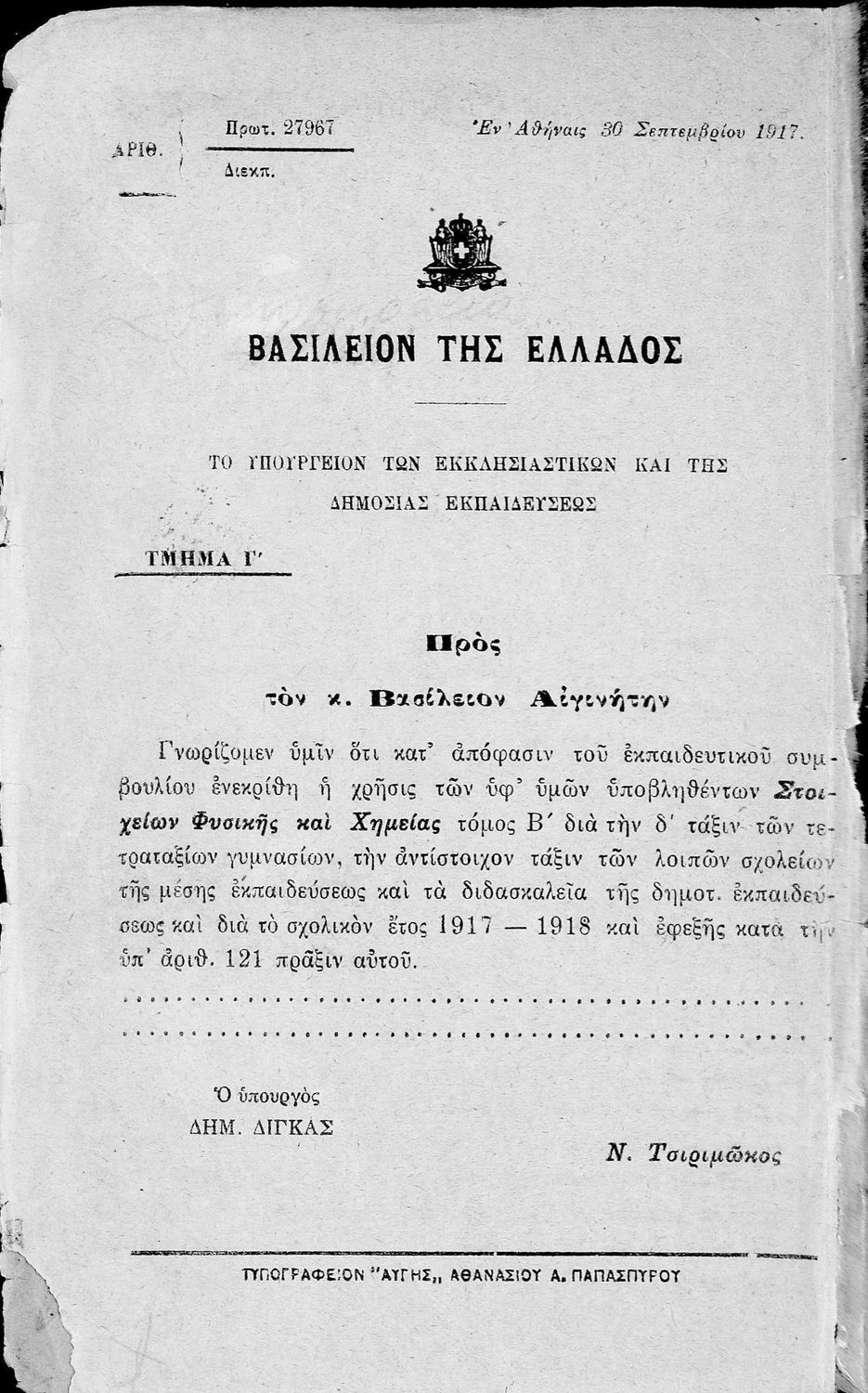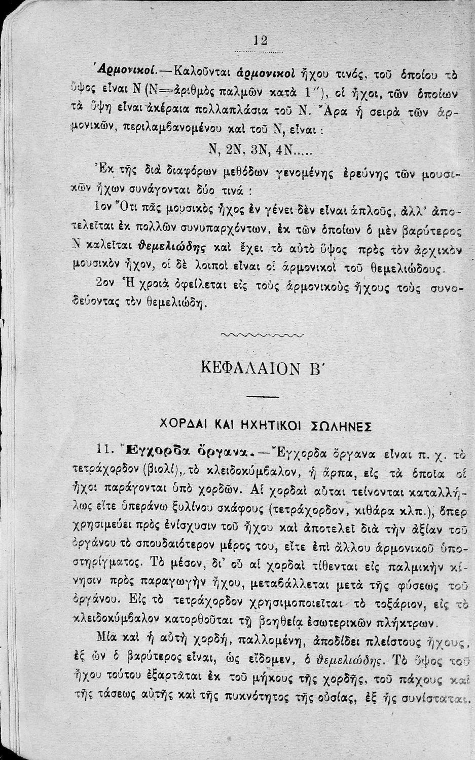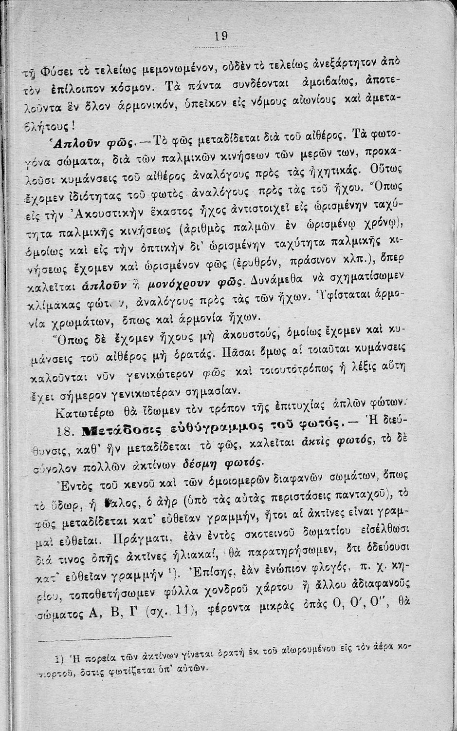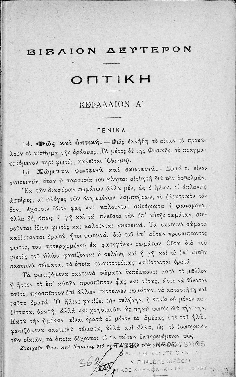 Σχολικό εγχειρίδιο Φυσικής και Χημείας για τη Δ΄ Γυμνασίου που περιλαμβάνει στοιχεία ακουστικής, οπτικής, μαγνητισμού, ηλεκτρισμού και οργανικής χημείας. Ο συγγραφέας ήταν καθηγητής της Φυσικής στο Εθνικό Πανεπιστήμιο.