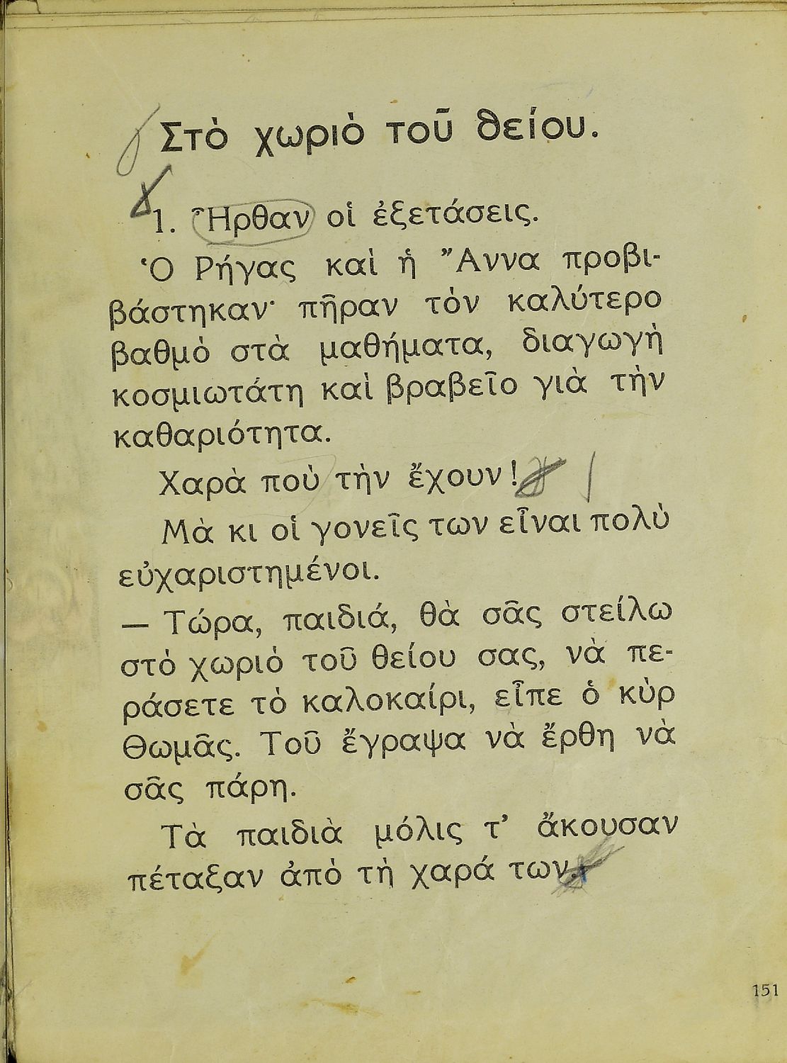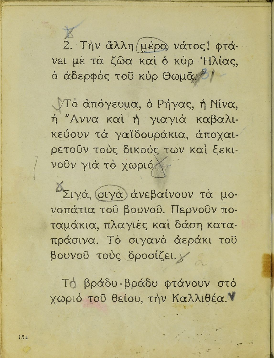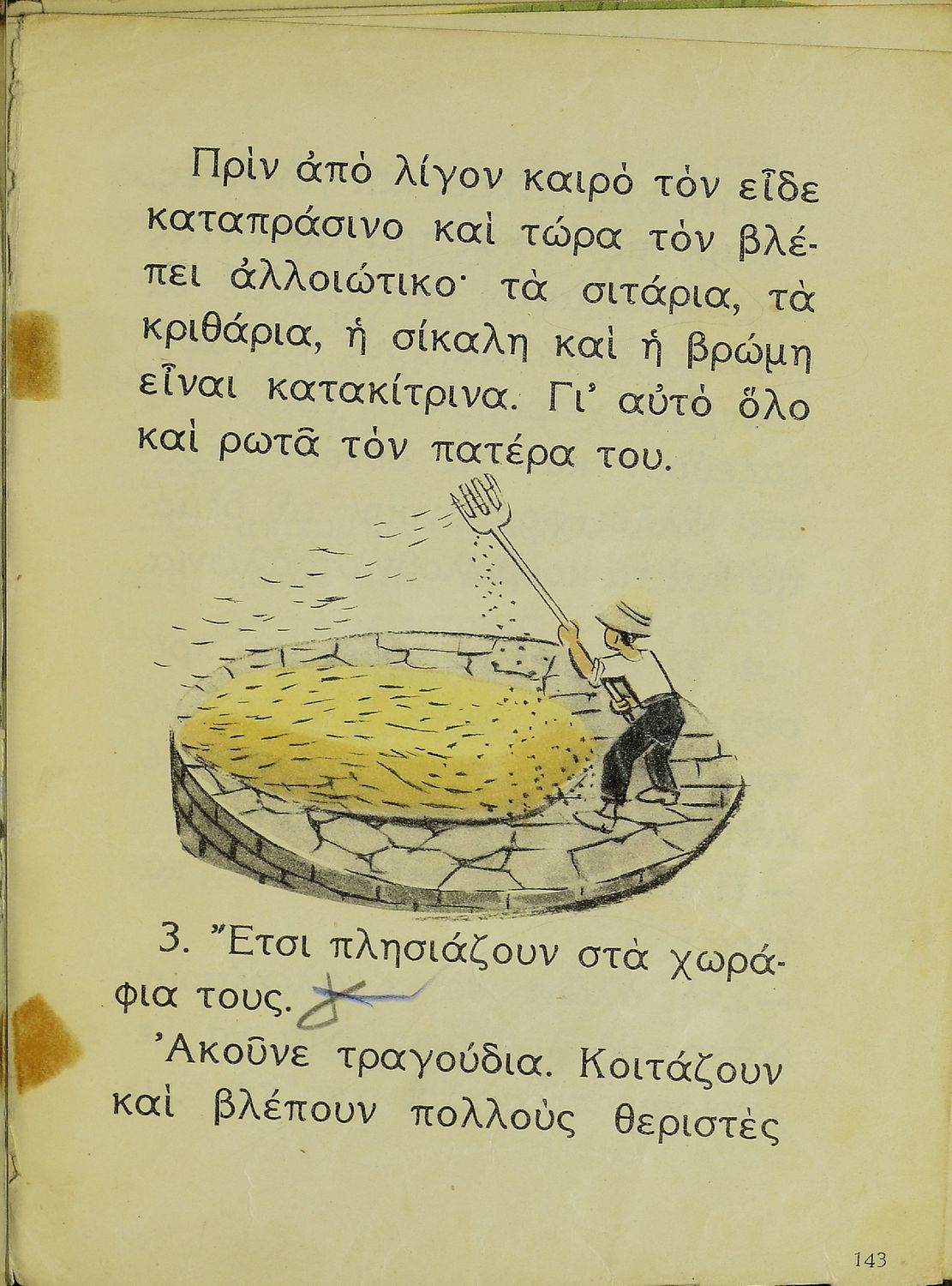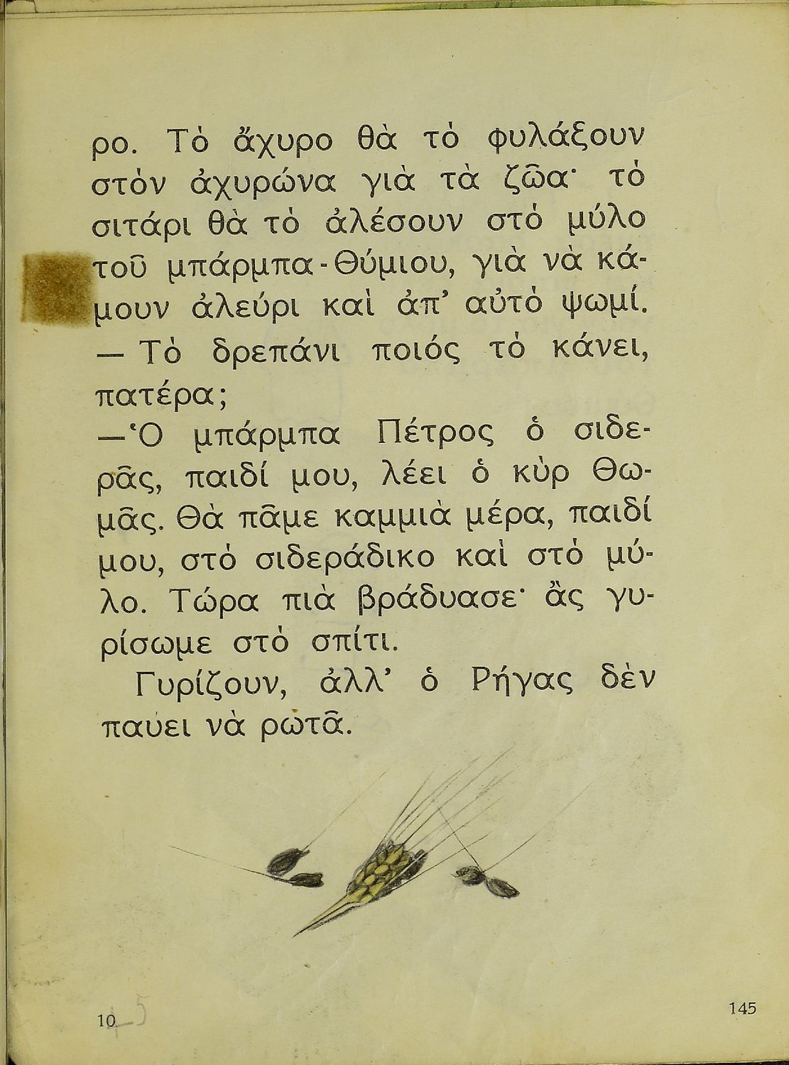 Αναγνωστικό Ε΄ Δημοτικού που περιλαμβάνει πεζογραφήματα εμπνευσμένα από την ελληνική φύση, την αγροτική ζωή και από το τρίπτυχο "Πατρίς- θρησκεία- οικογένεια".
