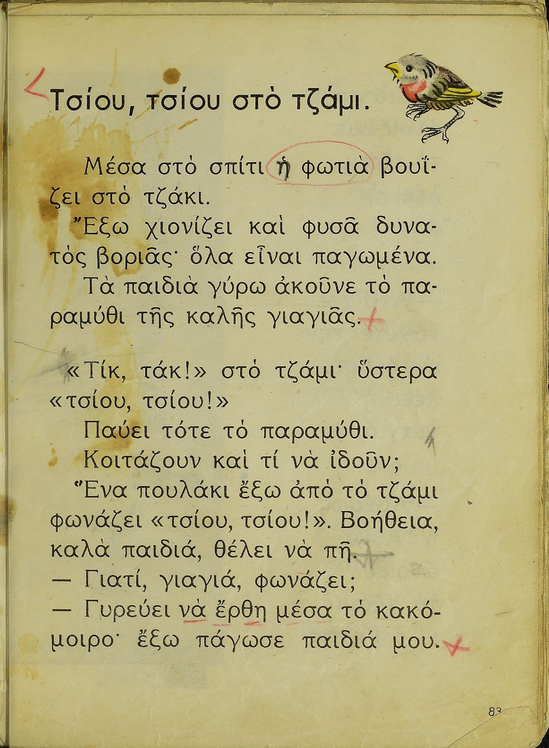 Αναγνωστικό Α΄ Δημοτικού που περιέχει ποιήματα και πεζά με σκηνές και προκρίνει τις αξίες της καλοσύνης, της υπευθυνότητας, της εργατικότητας, της αγάπης προς τα ζώα, αλλά και της διασκέδασης.