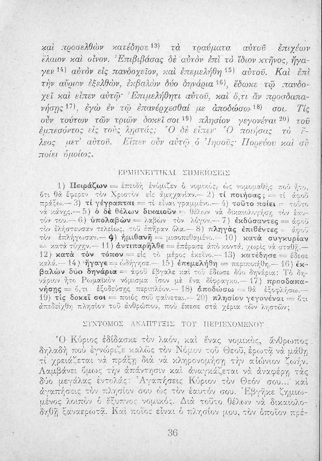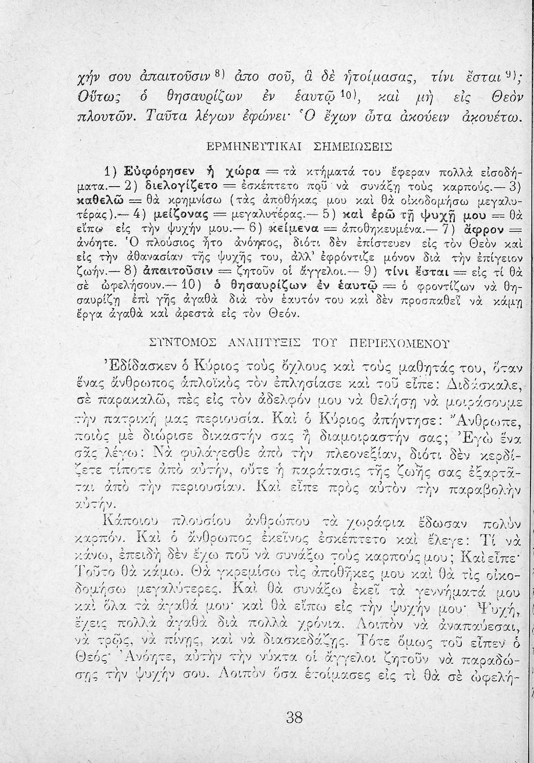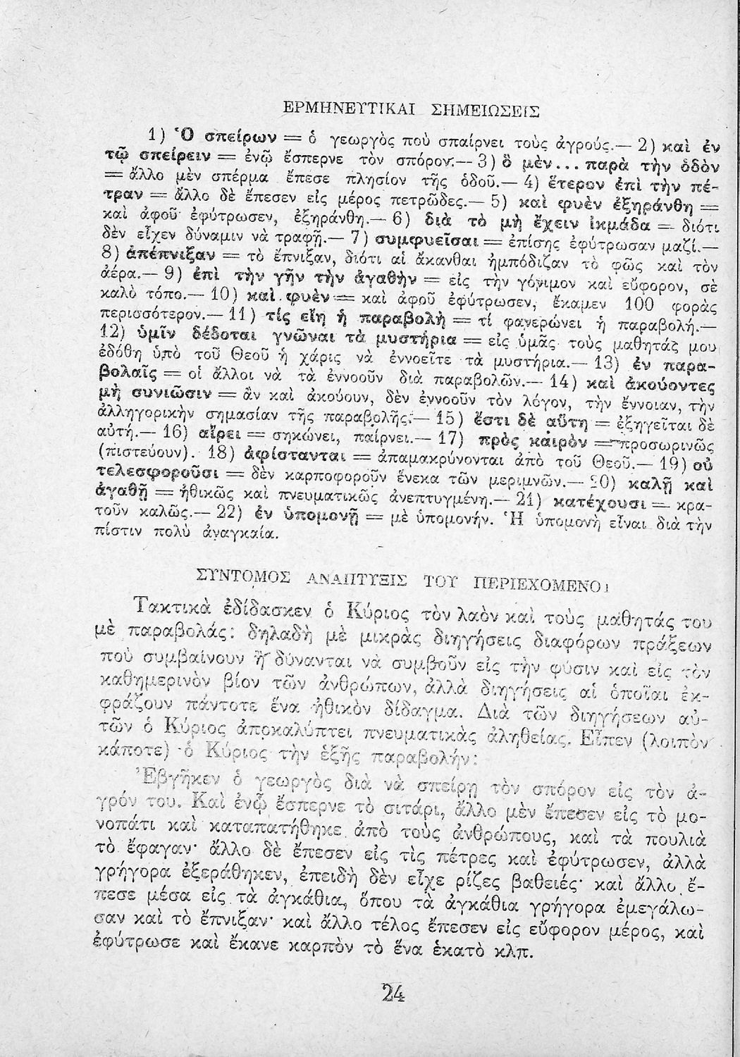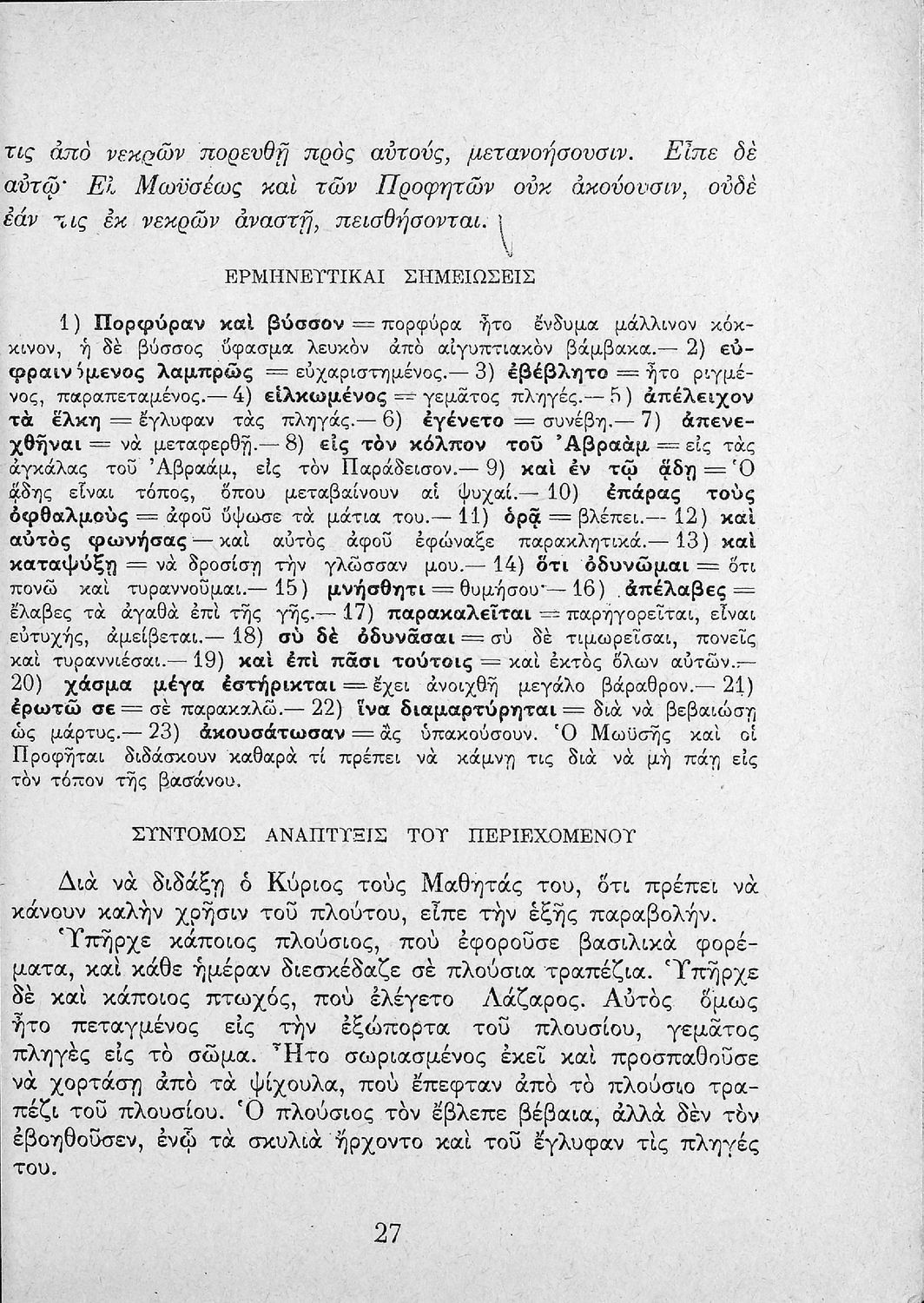 Το σύγγραμμα ήταν μαθητικό βοήθημα για το μάθημα των Θρησκευτικών. Περιέχει κείμενο, σχόλια των Ευαγγελίων
