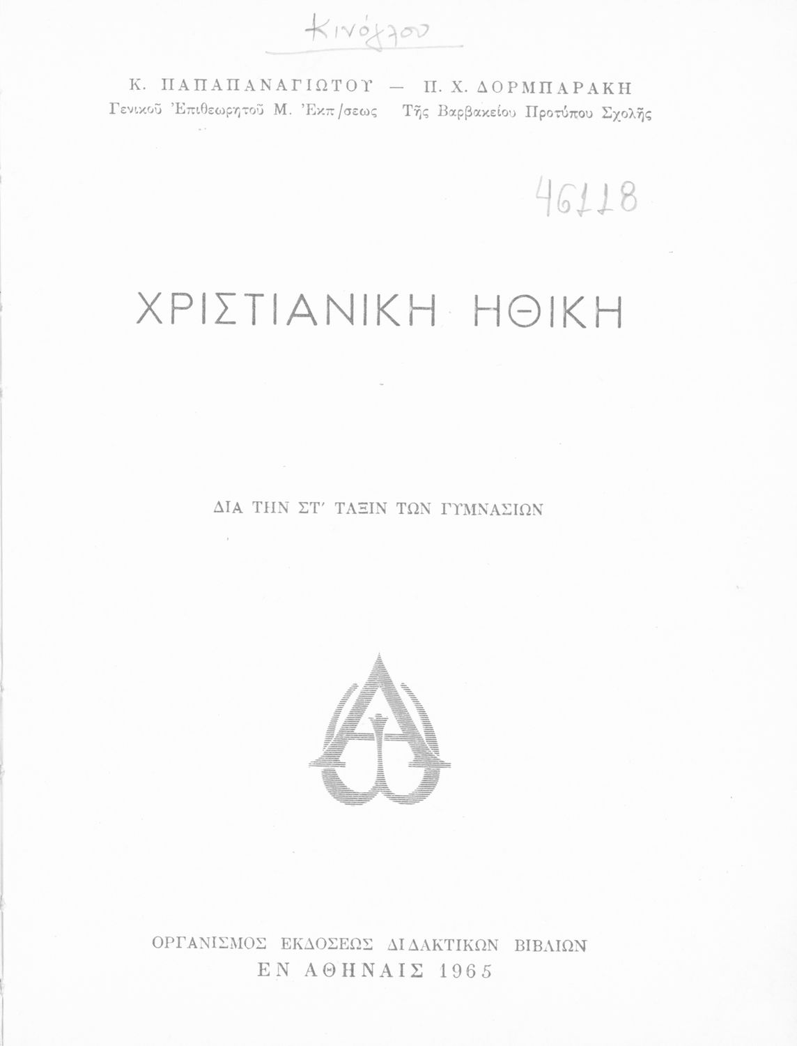 Κωδικός αναγνώρισης: 01-46118 Τίτλος: Χριστιανική Ηθική δια την ΣΤ΄ τάξιν των Γυμνασίων Συγγραφέας: Κ. Παπαπαναγιώτου, Π. Χ. Δορμπαράκης Μέγεθος και υπόστρωμα: Σχολικό εγχειρίδιο, 20εκ., σκληρό εξώφυλλο, 175 σελίδες. |