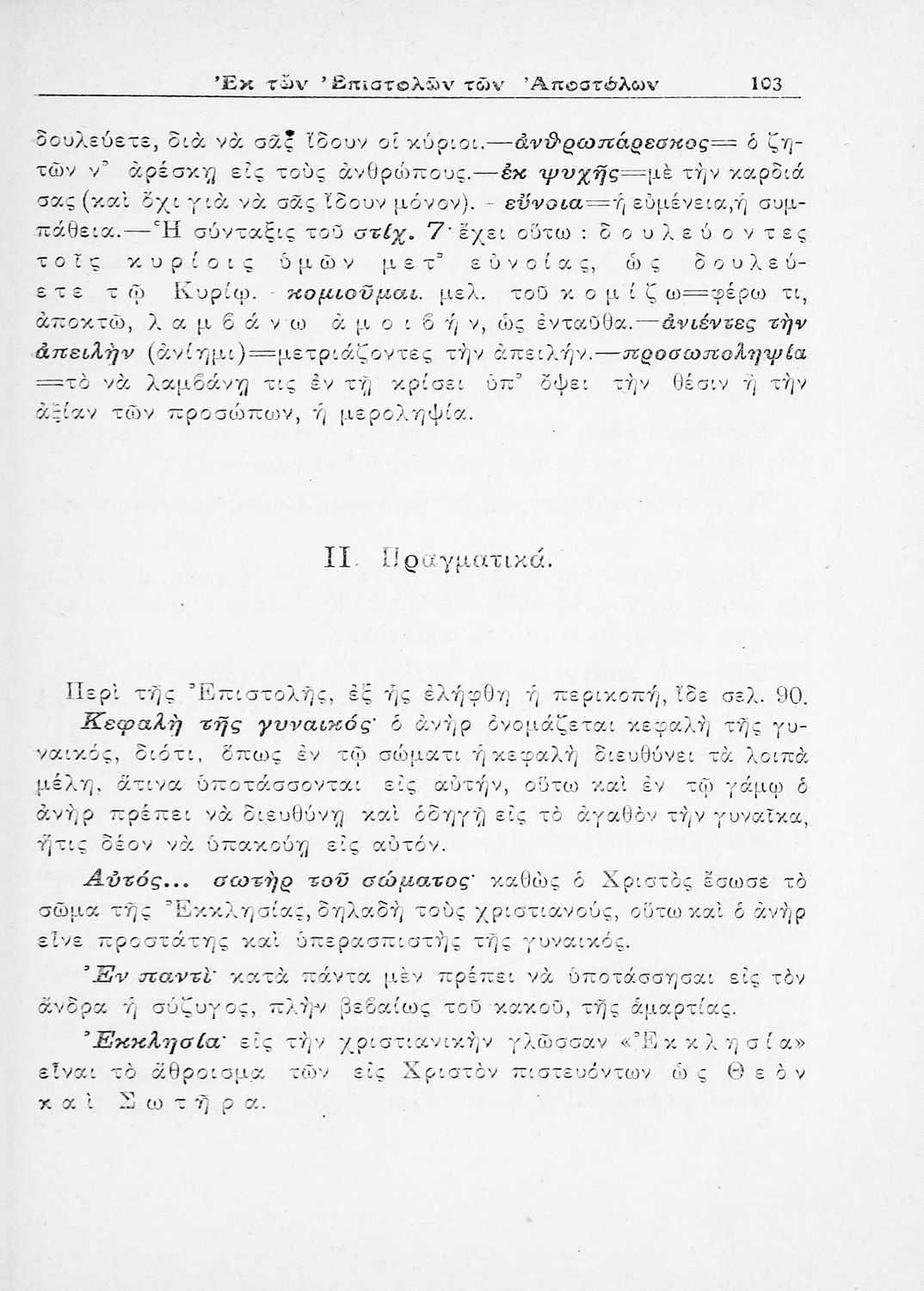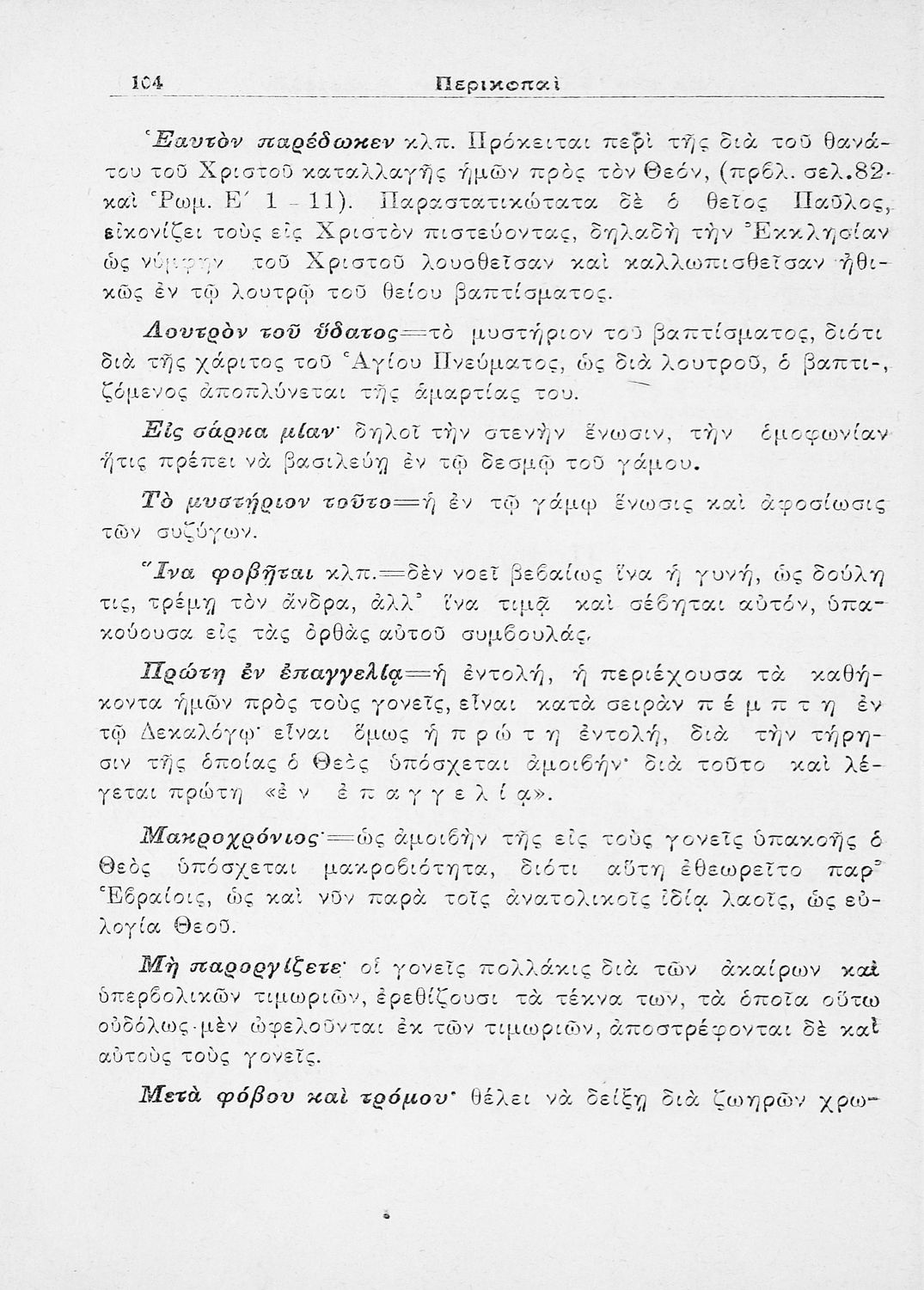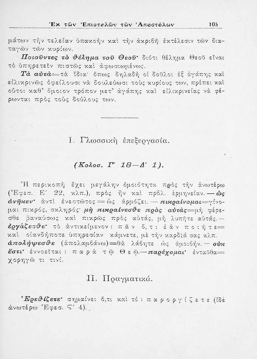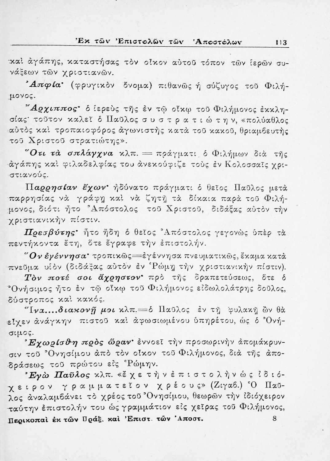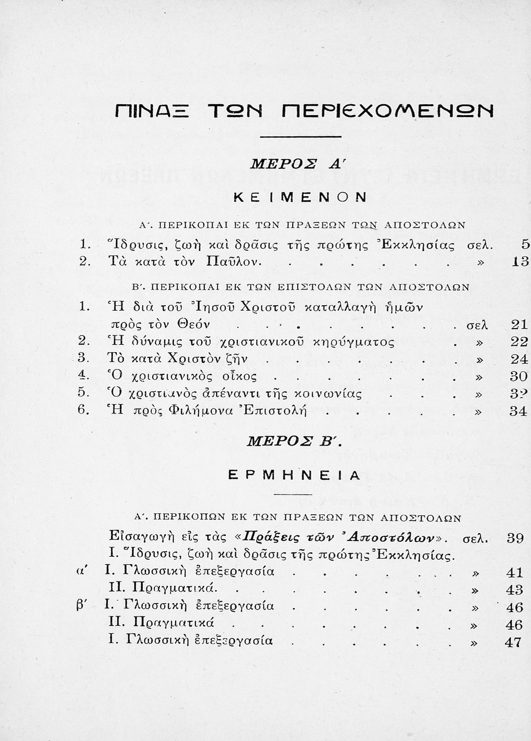 Σχολικό εγχειρίδιο Θρησκευτικών για τα Γυμνάσια, τα Διδασκαλεία και τα Παρθεναγωγεία που περιλαμβάνει αποσπάσματα από τις πράξεις των Αποστόλων, περικοπές ύμνων και ψαλμωδιών και επιστολές του Αποστόλου Παύλου.