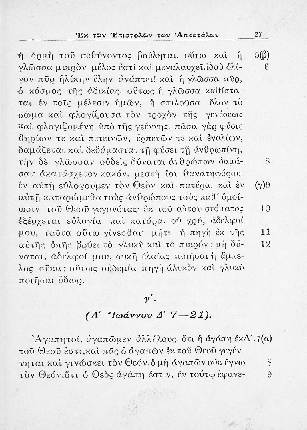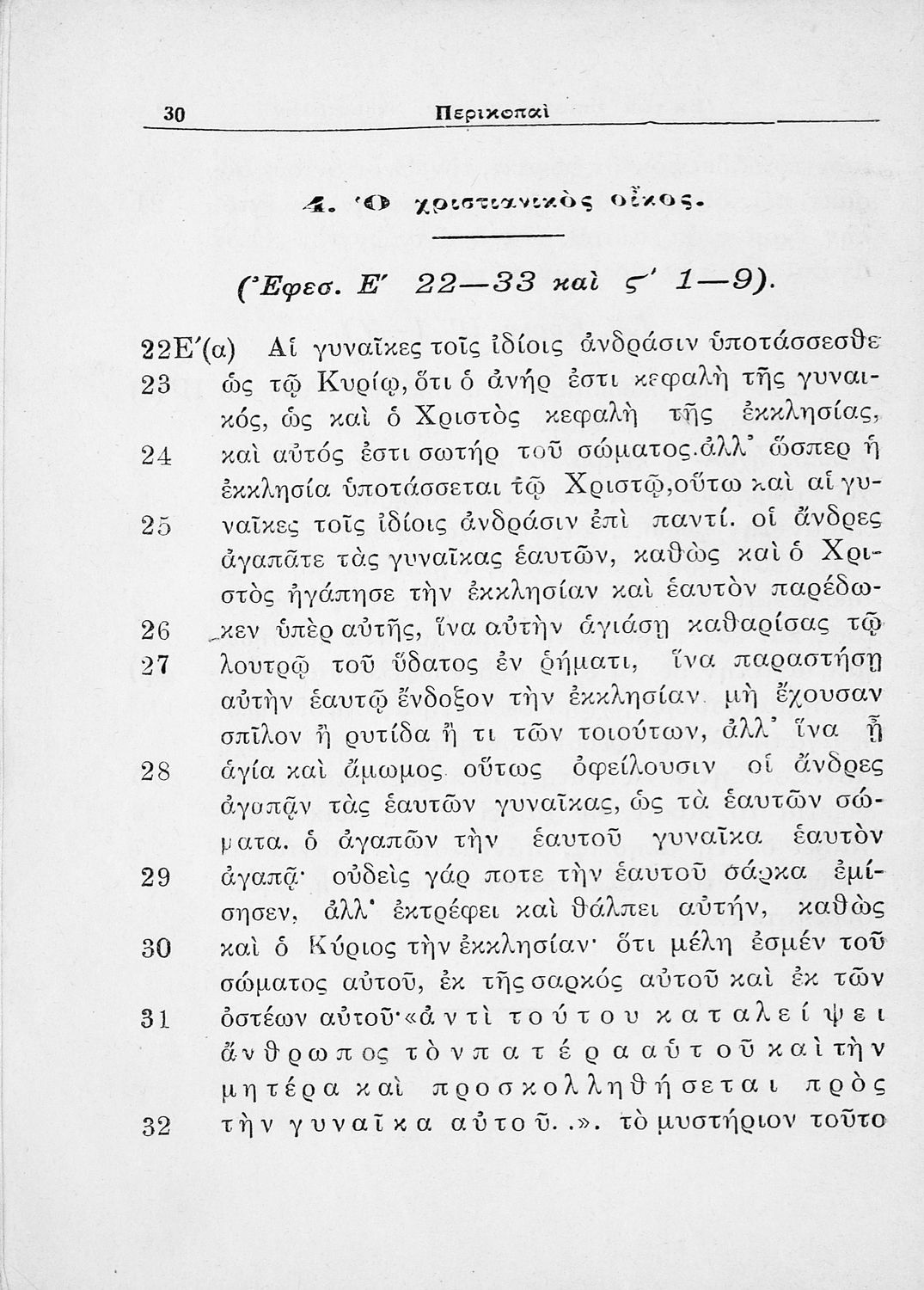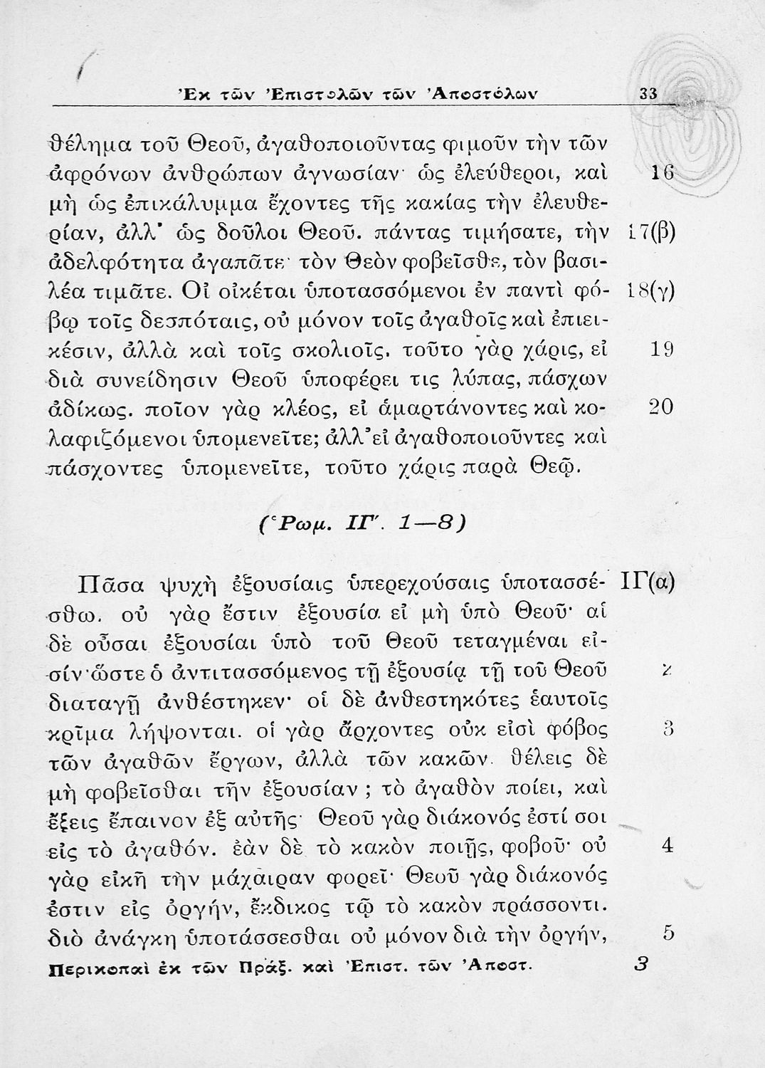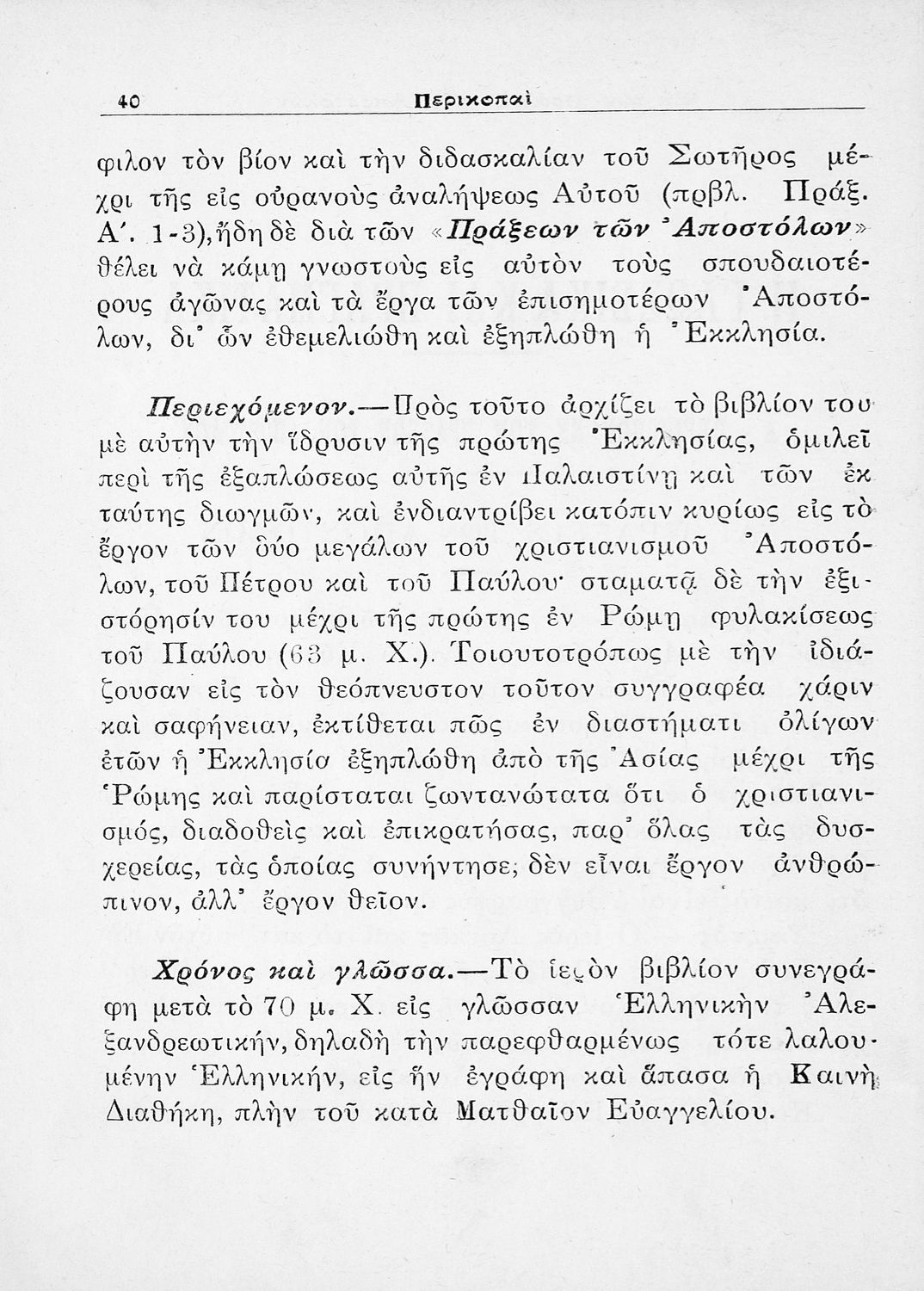Σχολικό εγχειρίδιο Θρησκευτικών για τα Γυμνάσια, τα Διδασκαλεία και τα Παρθεναγωγεία που περιλαμβάνει αποσπάσματα από τις πράξεις των Αποστόλων, περικοπές ύμνων και ψαλμωδιών και επιστολές του Αποστόλου Παύλου.