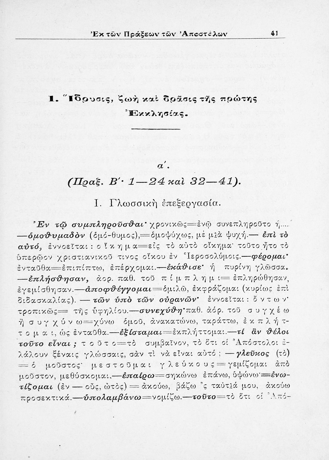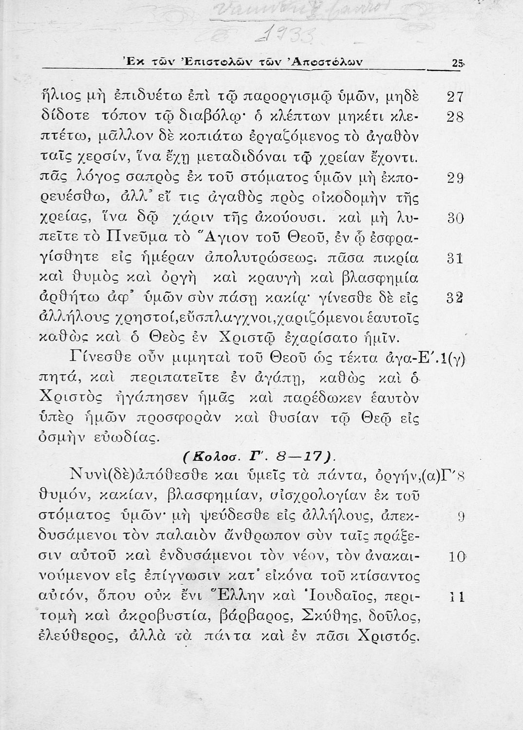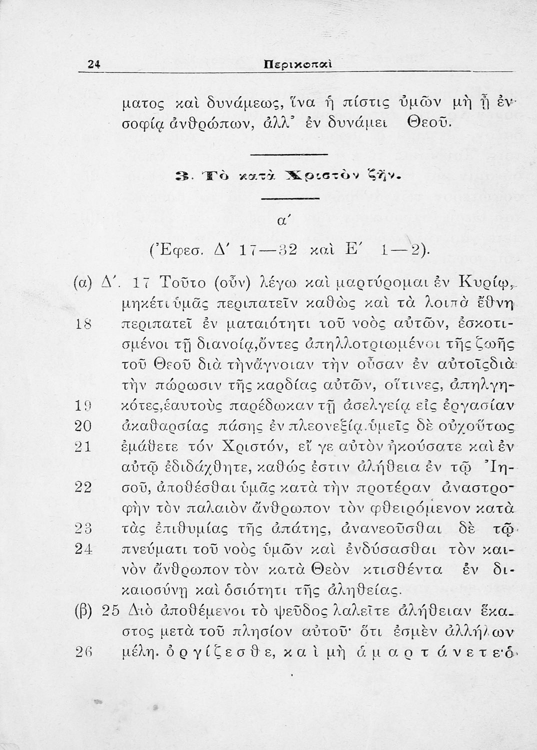Σχολικό εγχειρίδιο Θρησκευτικών για τα Γυμνάσια, τα Διδασκαλεία και τα Παρθεναγωγεία που περιλαμβάνει αποσπάσματα από τις πράξεις των Αποστόλων, περικοπές ύμνων και ψαλμωδιών και επιστολές του Αποστόλου Παύλου.