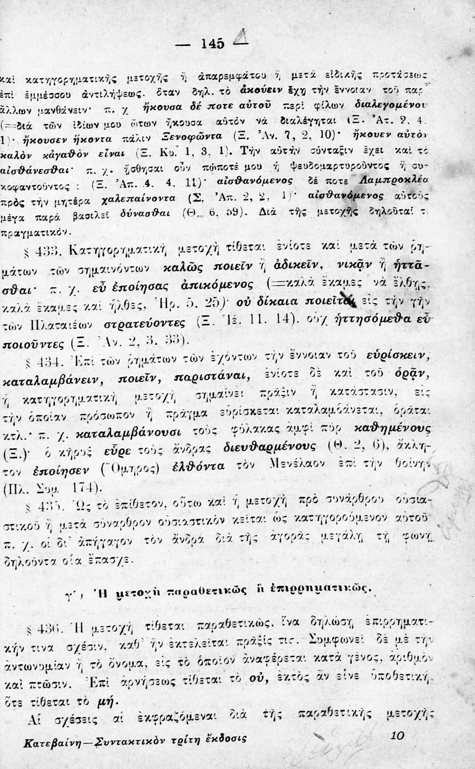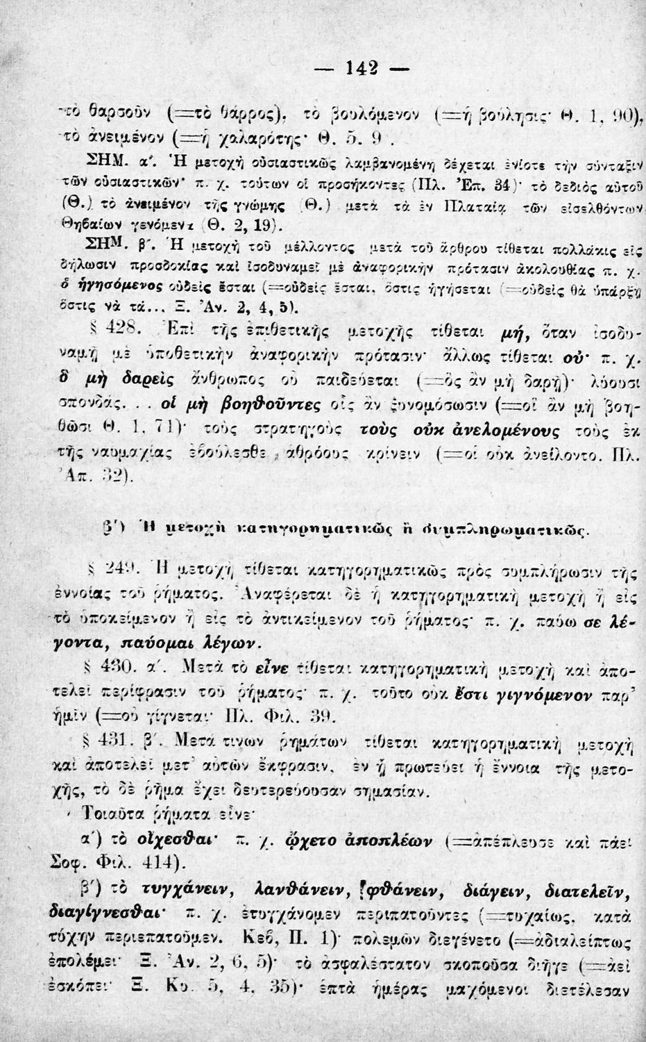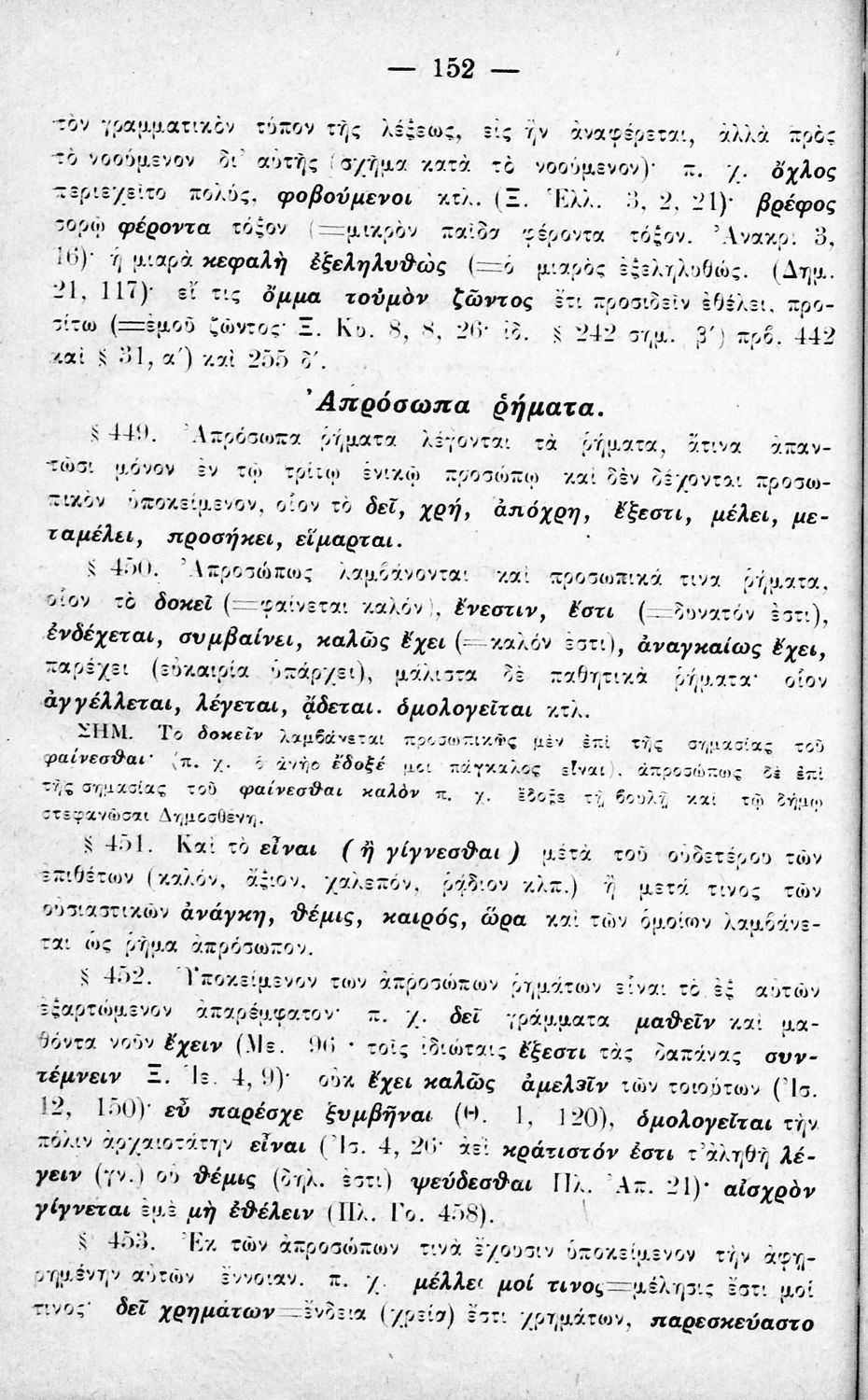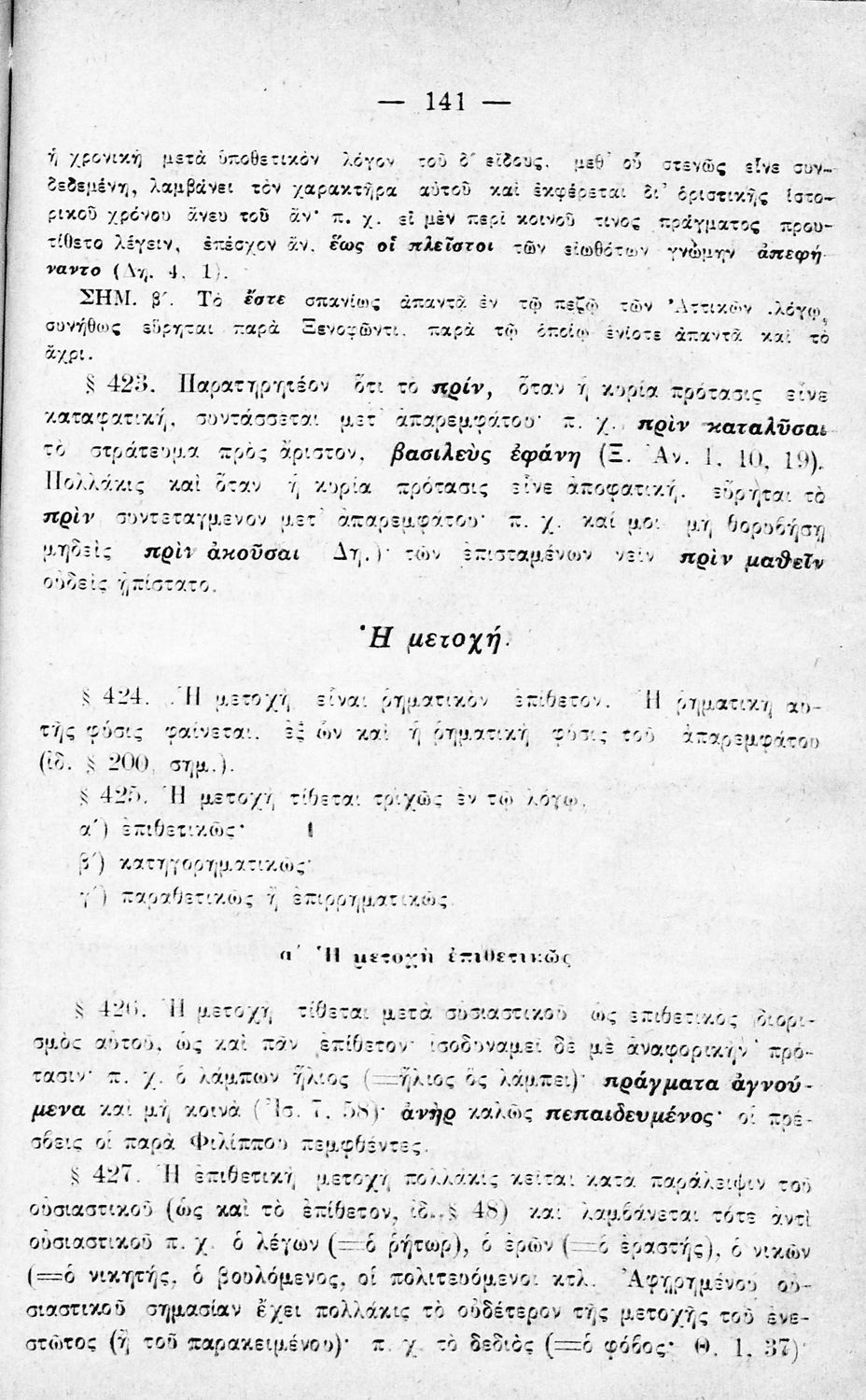 Σχολικό εγχειρίδιο Αρχαίων Ελληνικών για τα Ελληνικά Σχολεία, Παρθεναγωγεία και Γυμνάσια που περιέχει τους κανόνες γραμματικής και είναι χωρισμένο σε φθογγολογικό, τυπολογικό και ετυμολογικό μέρος.