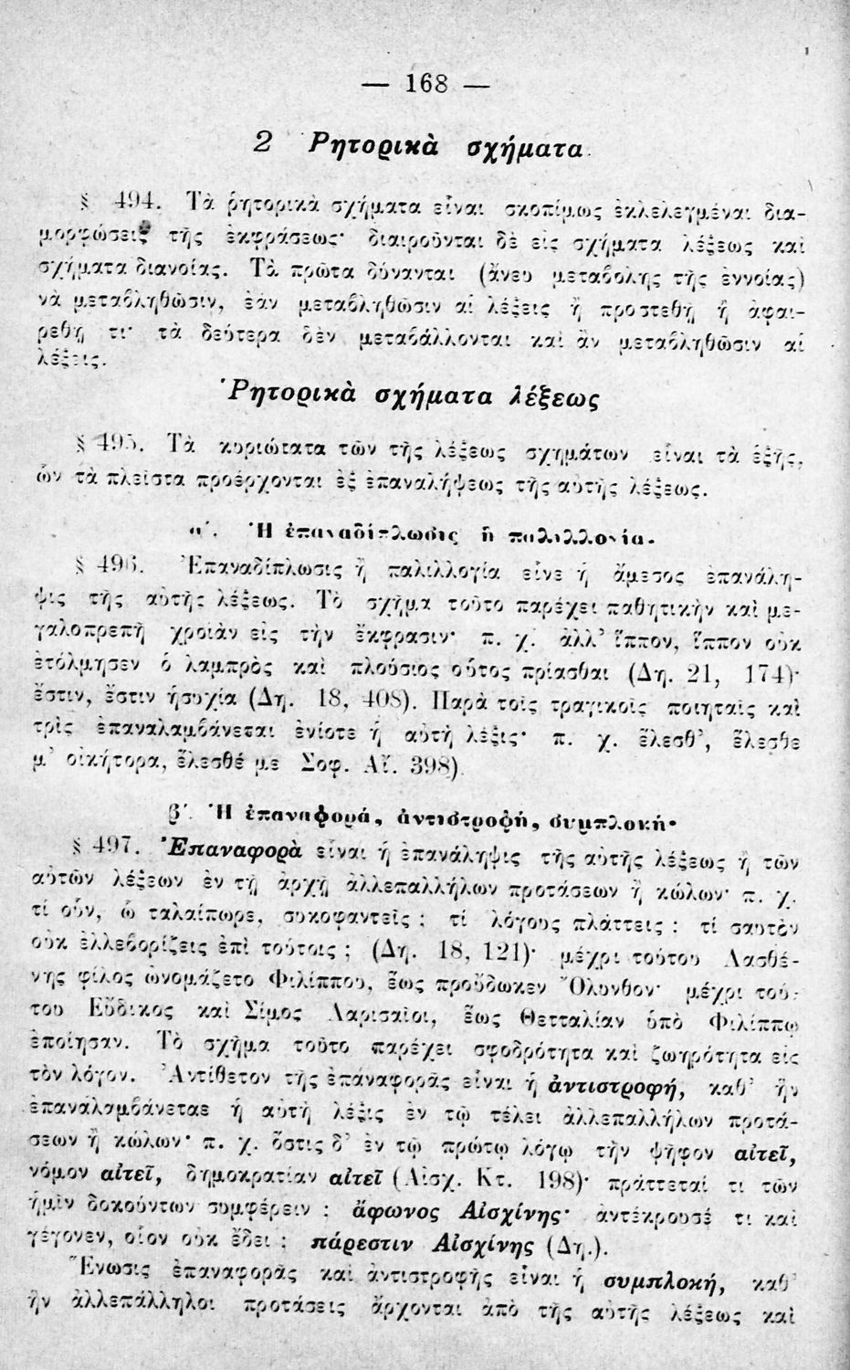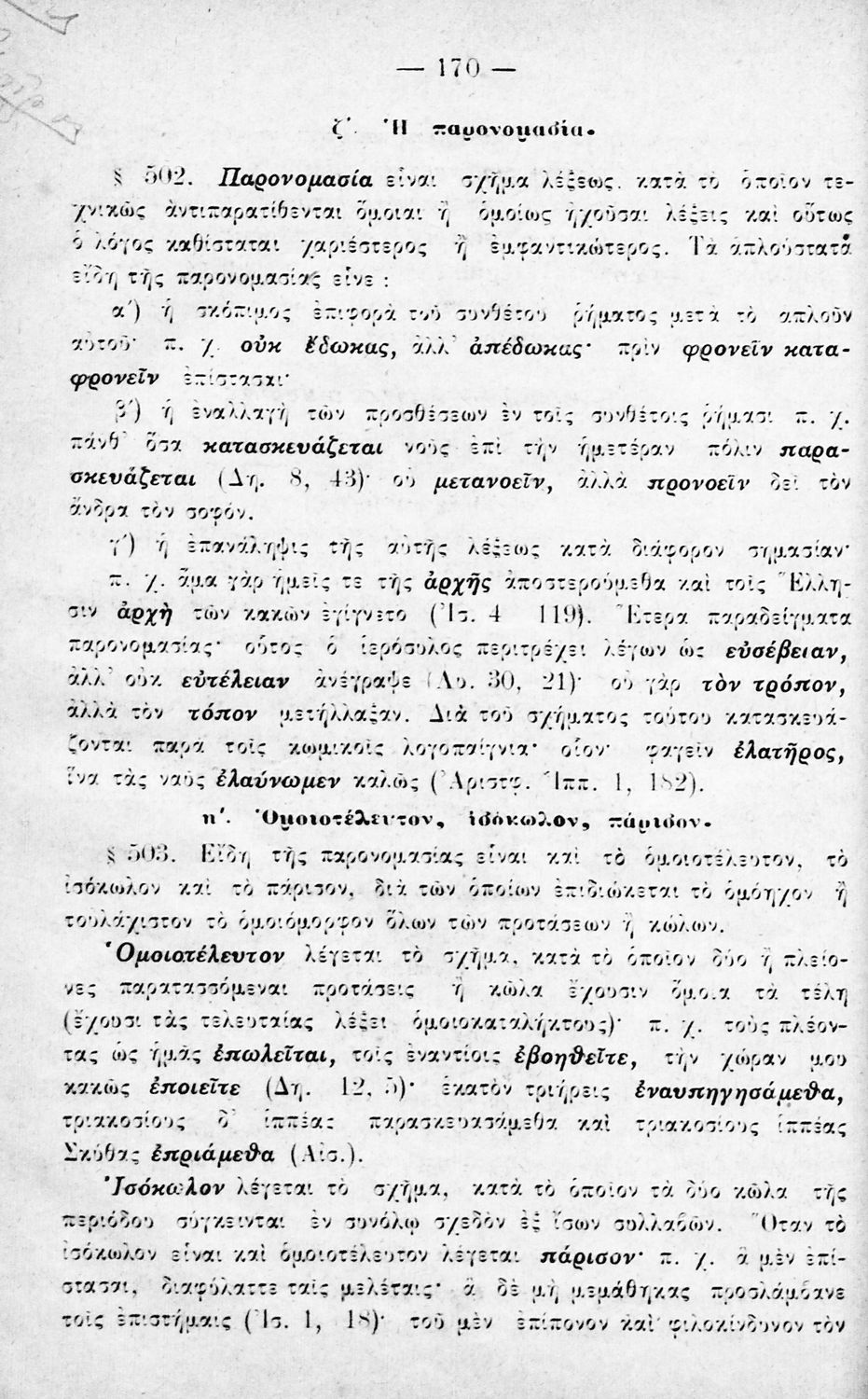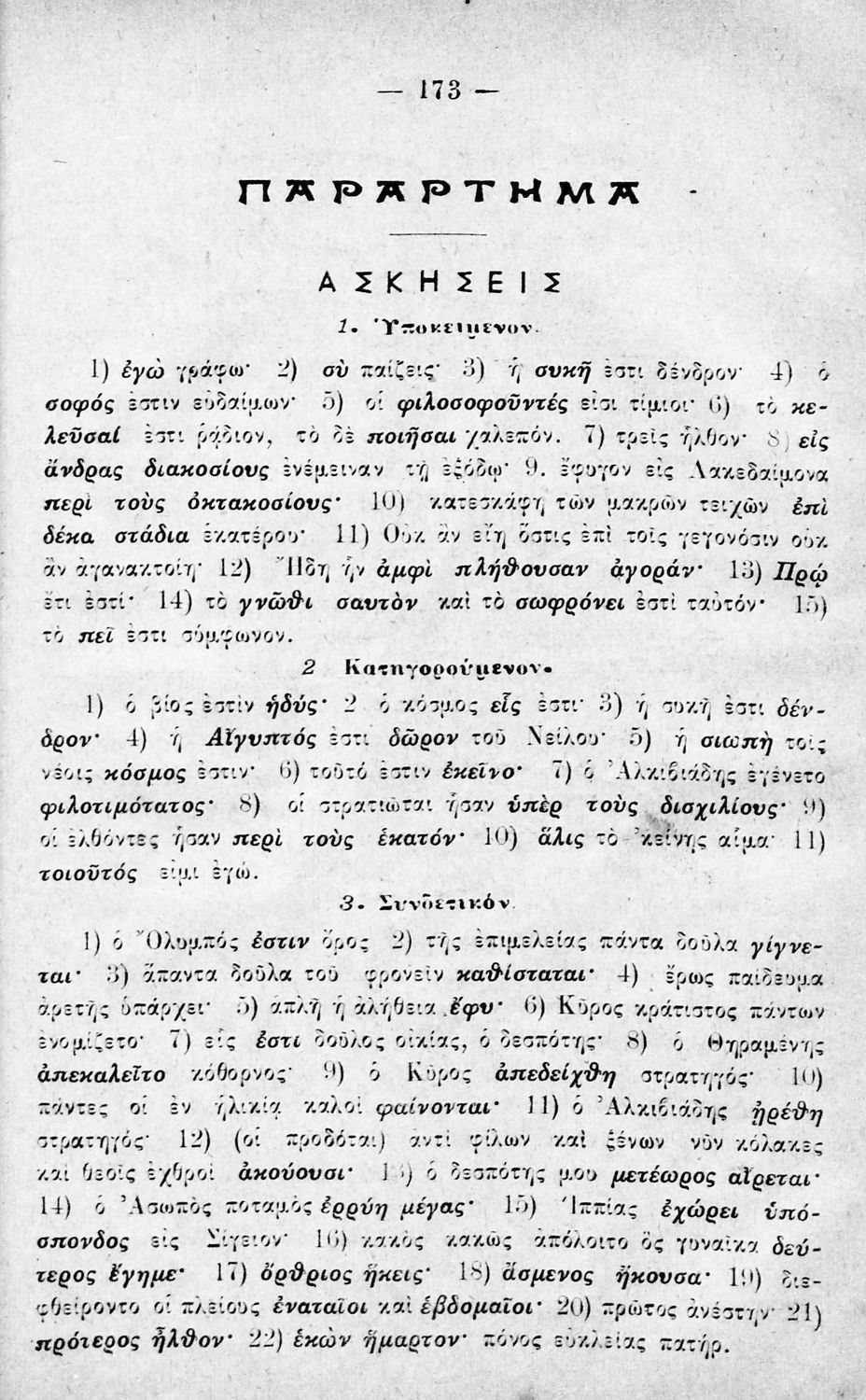 Σχολικό εγχειρίδιο Αρχαίων Ελληνικών για τα Ελληνικά Σχολεία, Παρθεναγωγεία και Γυμνάσια που περιέχει τους κανόνες γραμματικής και είναι χωρισμένο σε φθογγολογικό, τυπολογικό και ετυμολογικό μέρος.