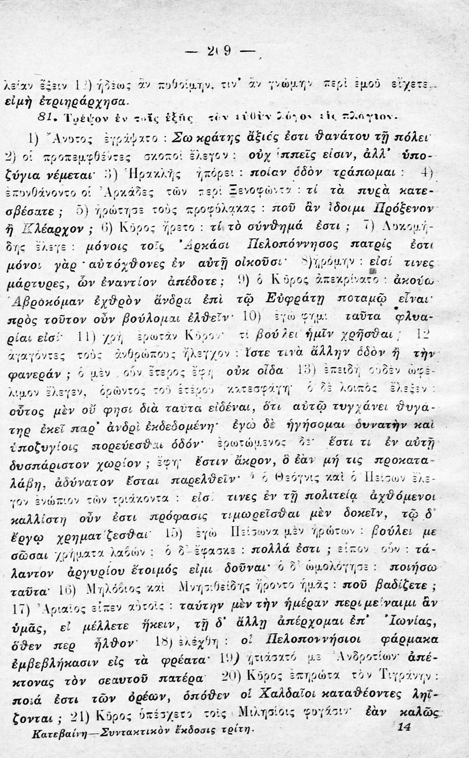 Σχολικό εγχειρίδιο Αρχαίων Ελληνικών για τα Ελληνικά Σχολεία, Παρθεναγωγεία και Γυμνάσια που περιέχει τους κανόνες γραμματικής και είναι χωρισμένο σε φθογγολογικό, τυπολογικό και ετυμολογικό μέρος.