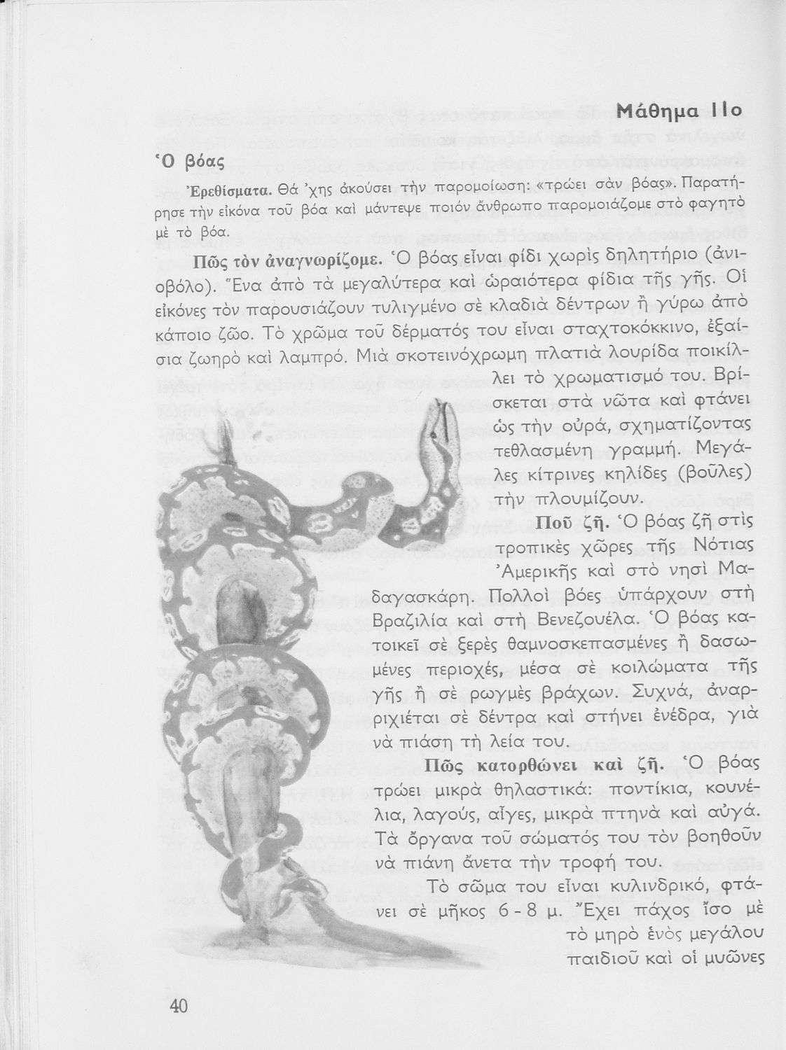 Βαθμίδα εκπαίδευσης: Πρωτοβάθμια Τάξη: Ε' Δημοτικού Μάθημα: Φυσική Ιστορία Γλώσσα: Δημοτική Παρουσίαση περιεχομένου: Σχολικό εγχειρίδιο της Ε' Δημοτικού για το μάθημα της Φυσικής Ιστορίας. Περιέχει πληροφορίες για την ζωολογία φυτολογία και την ορυκτολογία. Το βιβλίο έχει εικόνες, οι οποίες διευκολύνουν τη διδασκαλία. Ο λόγος των κειμένων είναι απλός και κατανοητός για τους μαθητές. |
