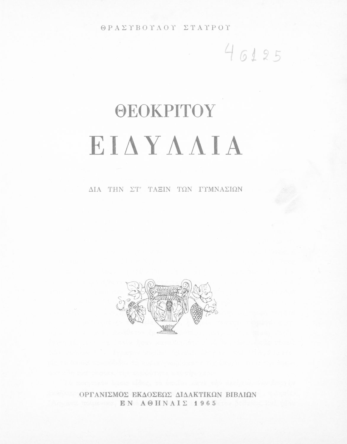 Σχολικό εγχειρίδιο Αρχαίων Ελληνικών ΣΤ΄ Γυμνασίου που περιλαμβάνει εισαγωγή στη ζωή και το έργο του Θεόκριτου, τα Ειδύλλιά του και ερμηνευτικά σχόλια.