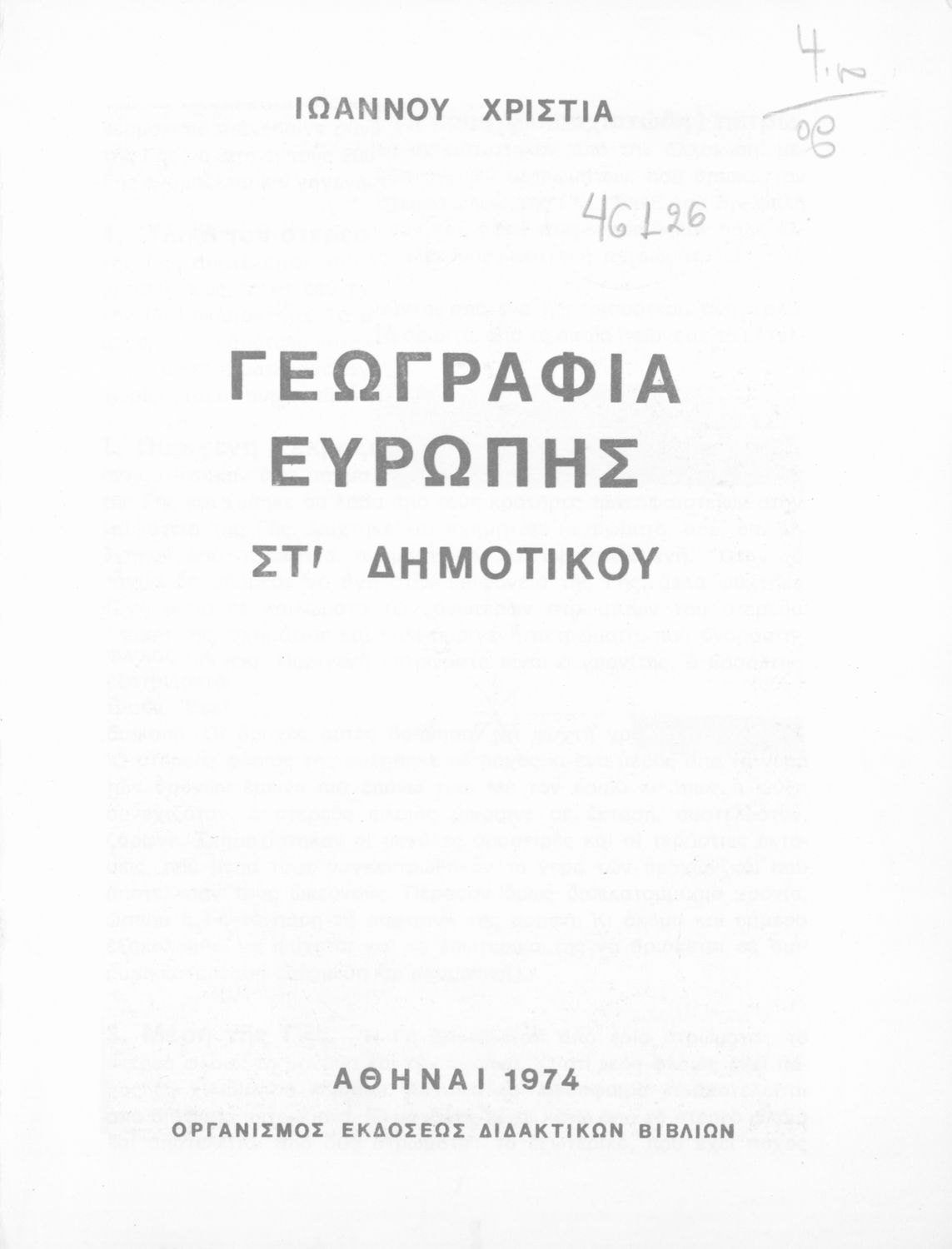 Σχολικό εγχειρίδιο Γεωγραφίας ΣΤ΄ Δημοτικού που περιλαμβάνει εισαγωγή στη φυσική και μαθηματική γεωγραφία και παρουσιάζει τα κράτη της Ευρώπης από φυσική, οικονομική και πολιτική σκοπιά.
