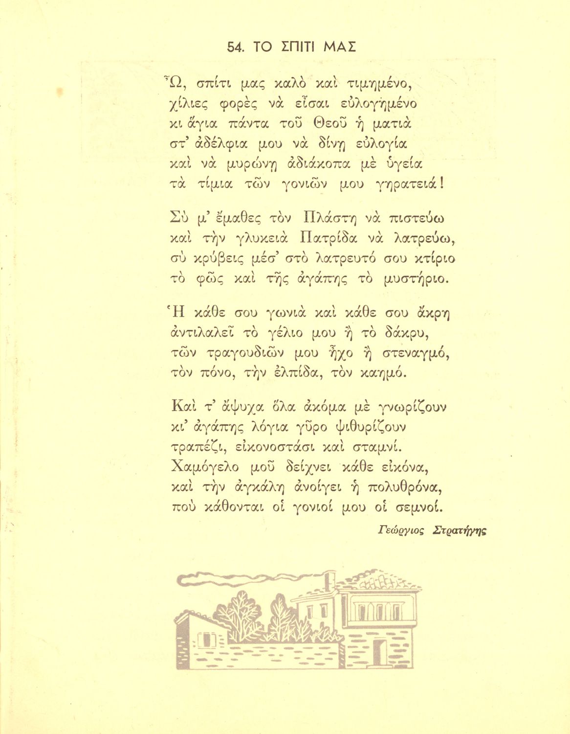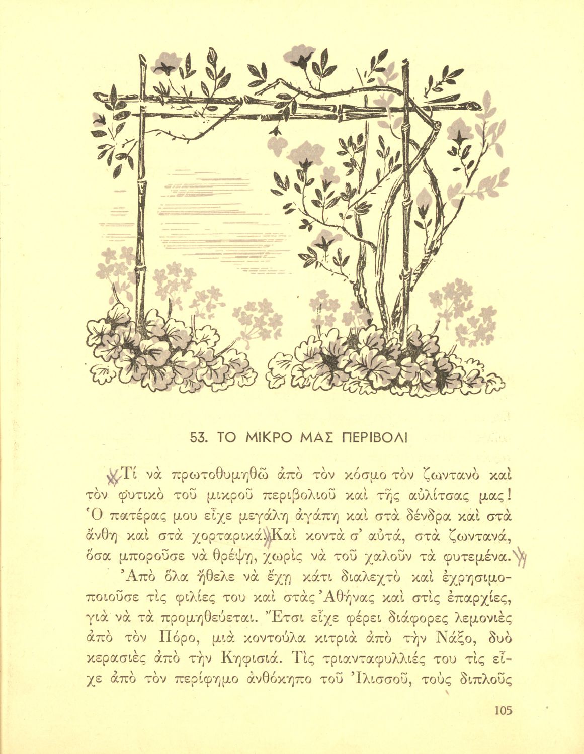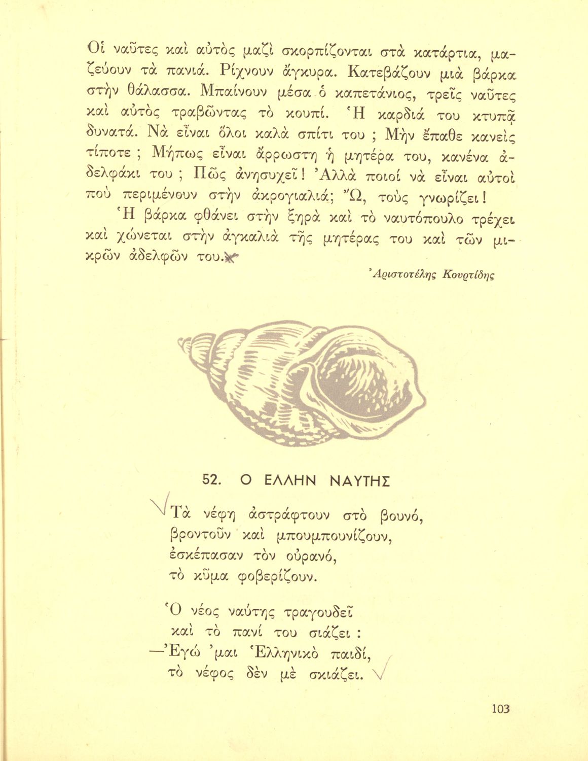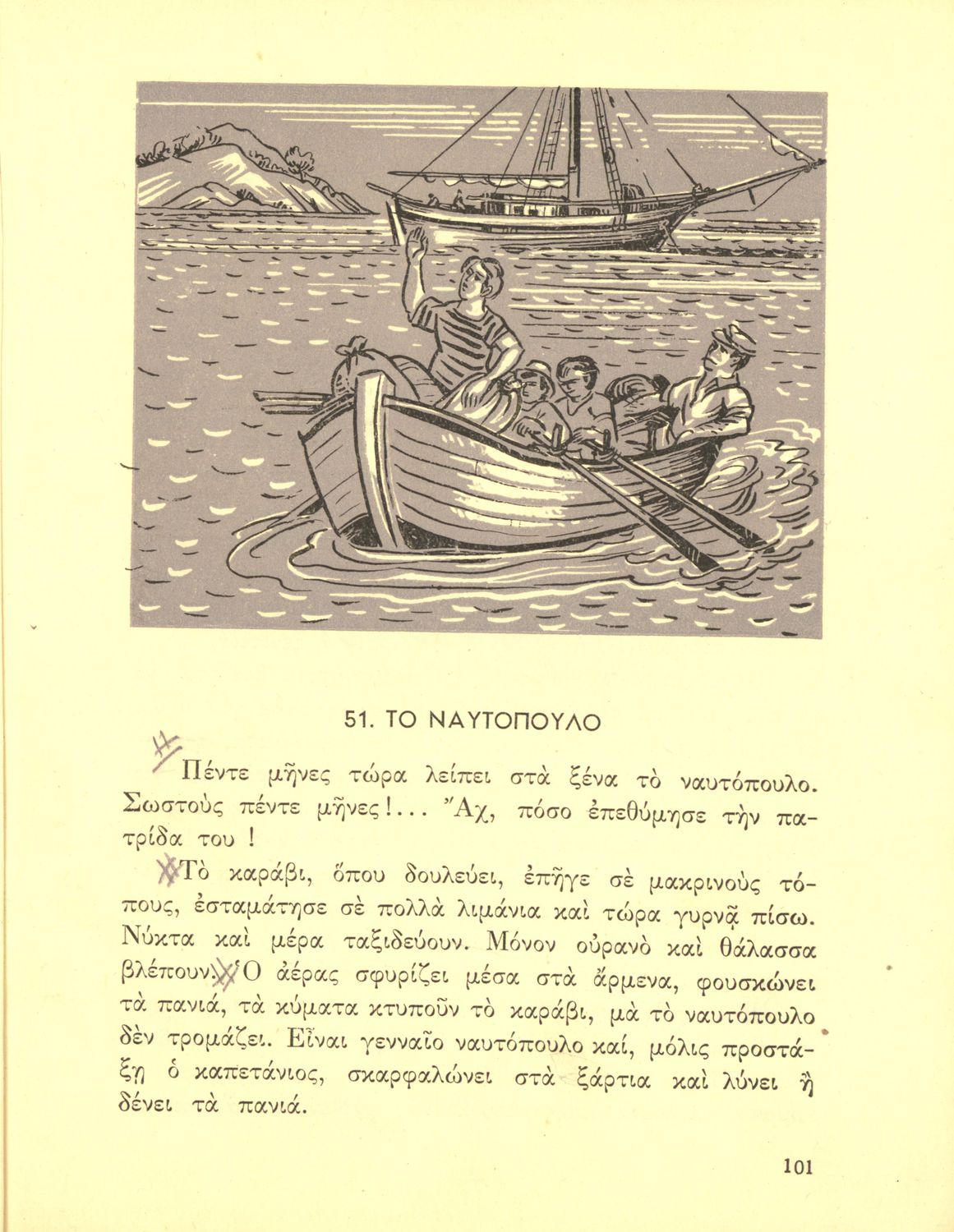 Αναγνωστικό ΣΤ΄ Δημοτικού που περιλαμβάνει θέματα από τις ελληνικές παραδόσεις και μύθους, την ελληνική φύση και θάλασσα και το τρίπτυχο "Πατρίς-θρησκεία-οικογένειαα".