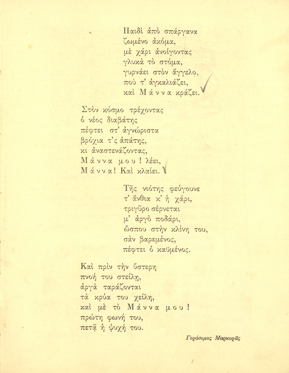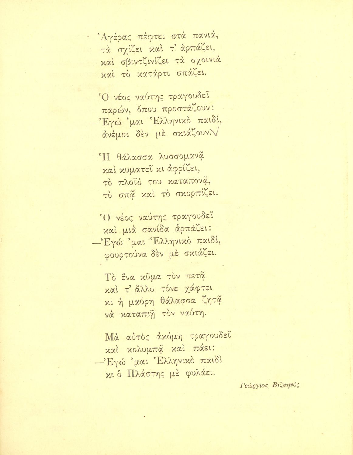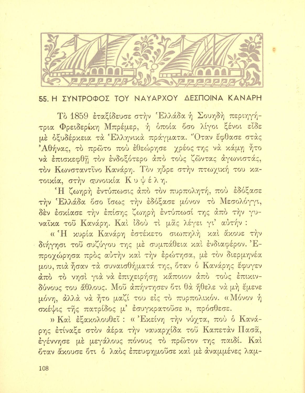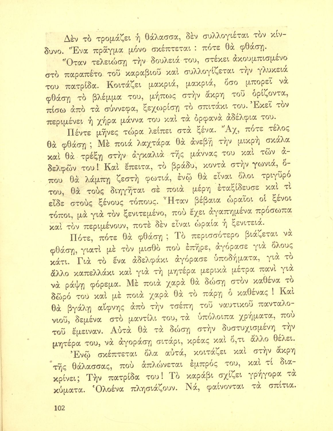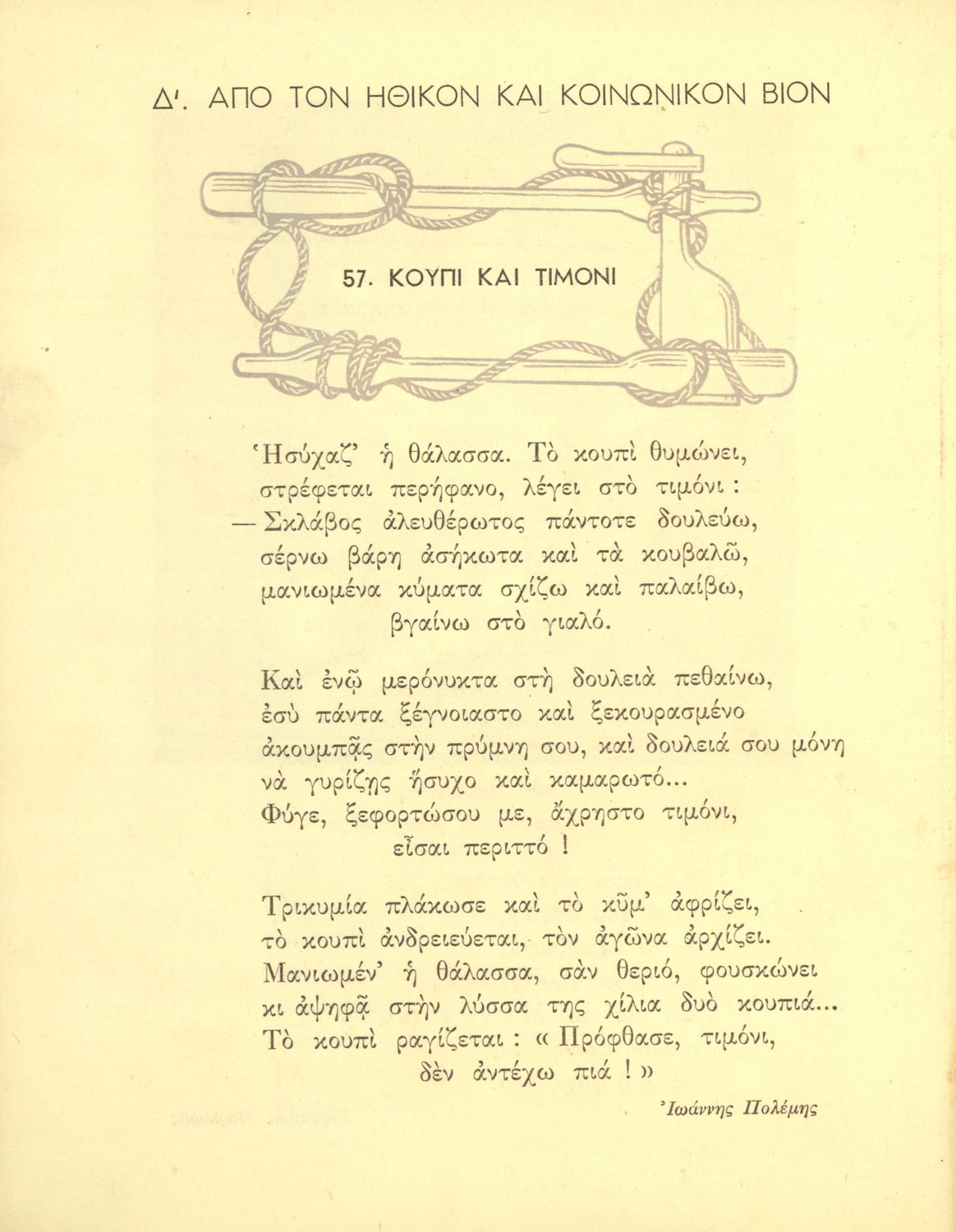 Αναγνωστικό ΣΤ΄ Δημοτικού που περιλαμβάνει θέματα από τις ελληνικές παραδόσεις και μύθους, την ελληνική φύση και θάλασσα και το τρίπτυχο "Πατρίς-θρησκεία-οικογένειαα".