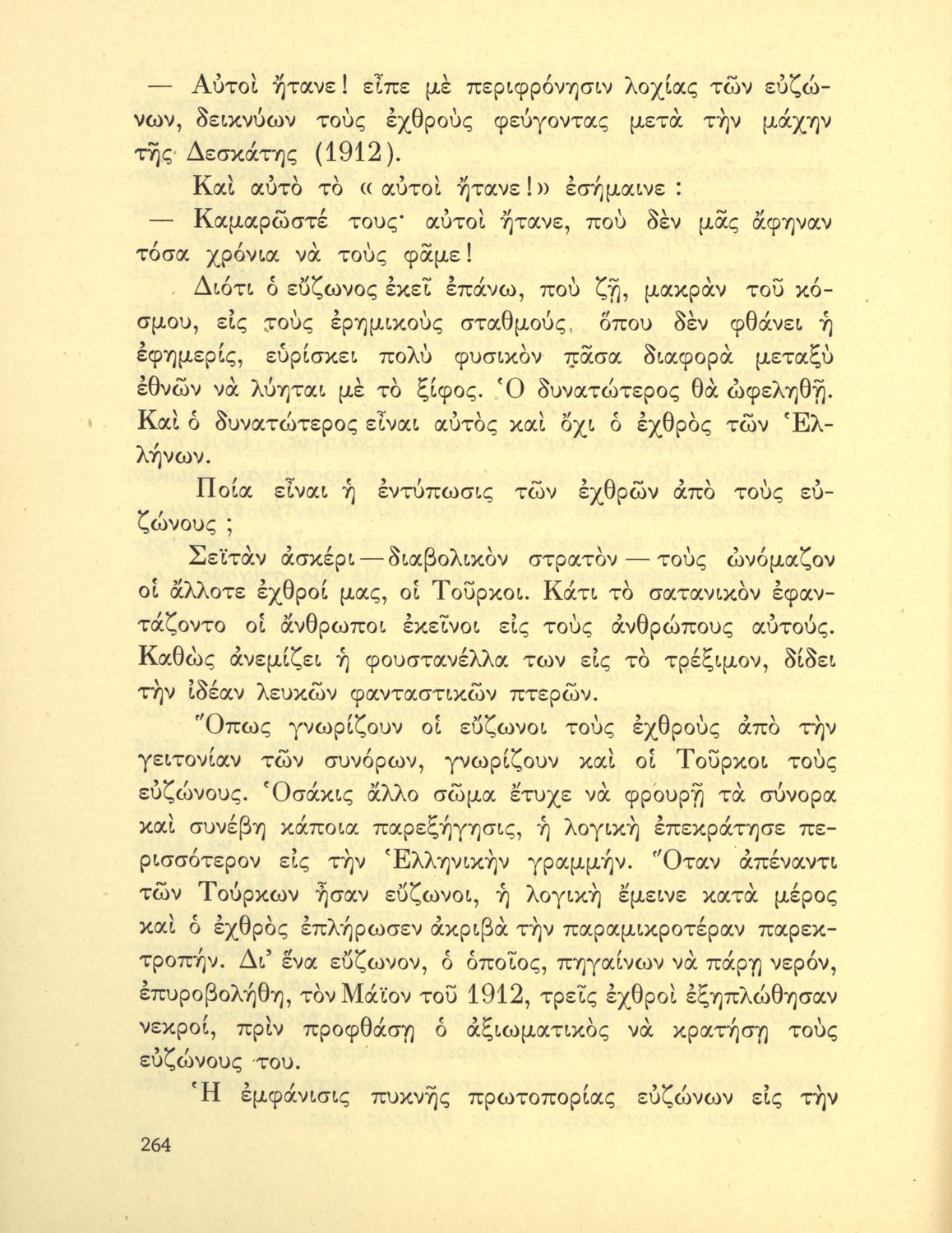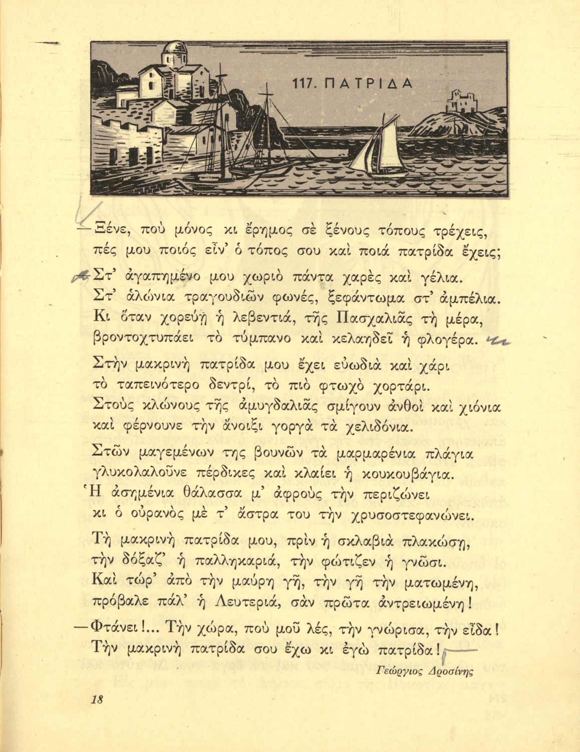 Αναγνωστικό ΣΤ΄ Δημοτικού που περιλαμβάνει θέματα από τις ελληνικές παραδόσεις και μύθους, την ελληνική φύση και θάλασσα και το τρίπτυχο "Πατρίς-θρησκεία-οικογένειαα".