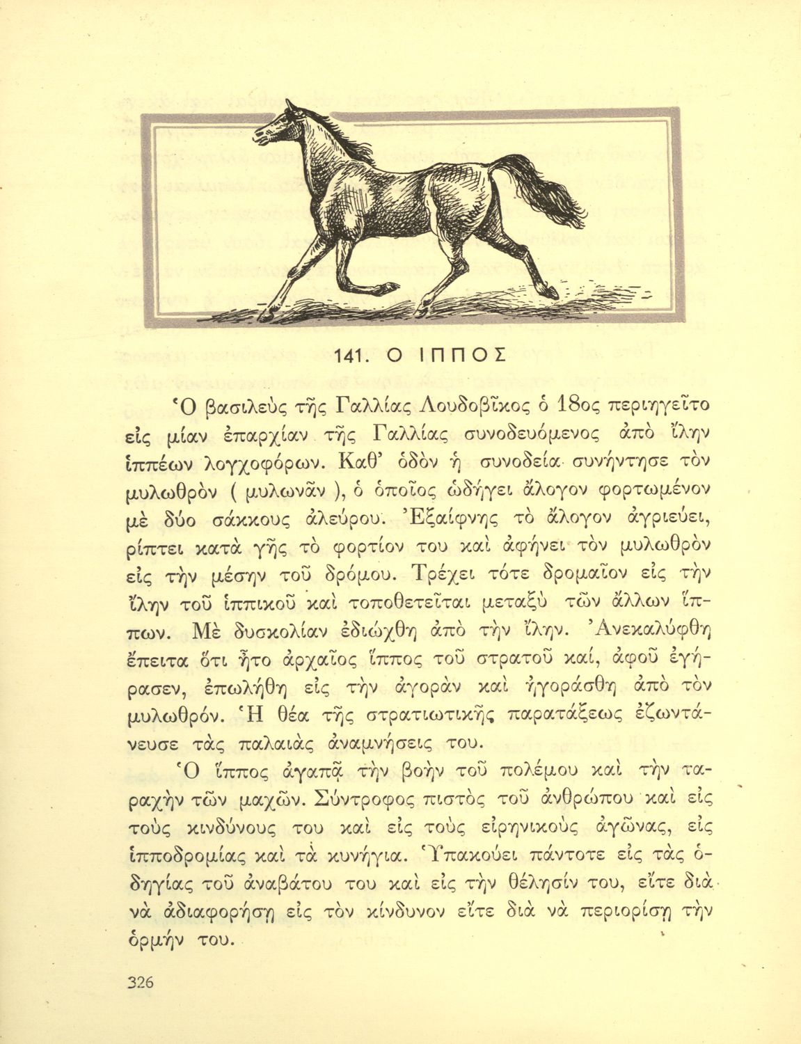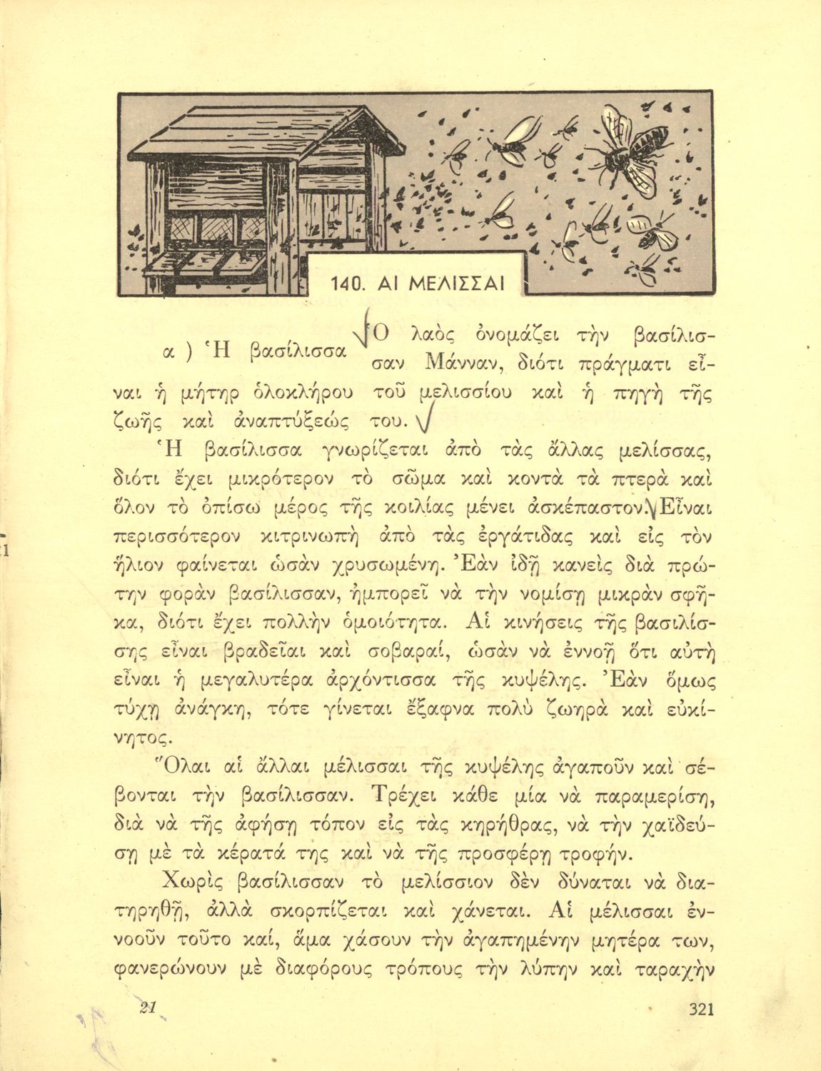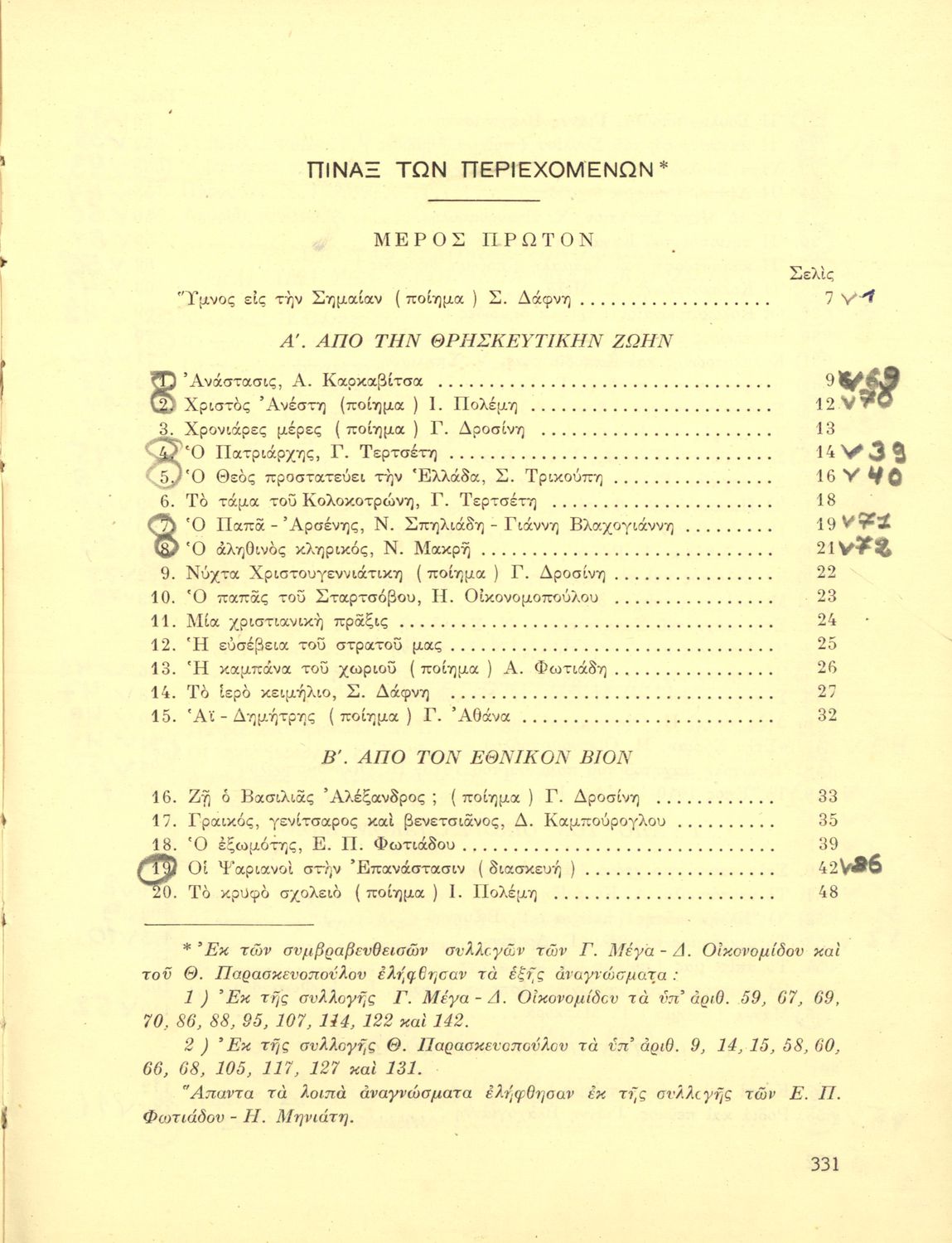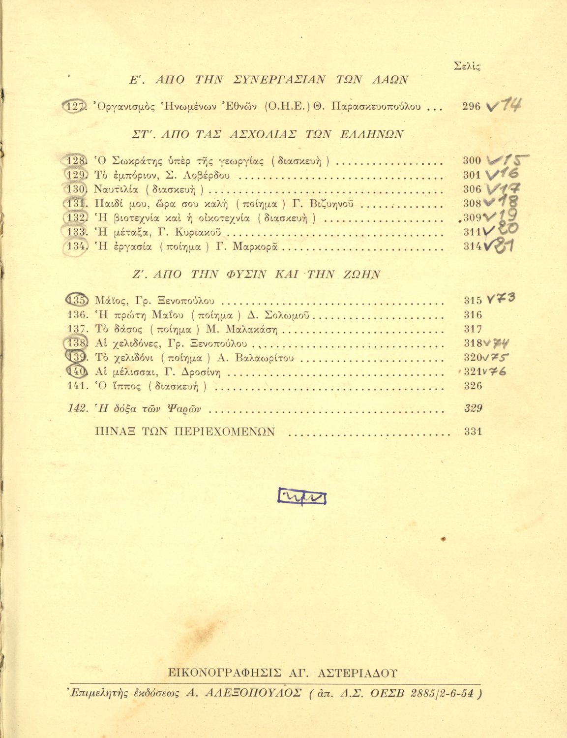 Αναγνωστικό ΣΤ΄ Δημοτικού που περιλαμβάνει θέματα από τις ελληνικές παραδόσεις και μύθους, την ελληνική φύση και θάλασσα και το τρίπτυχο "Πατρίς-θρησκεία-οικογένειαα".