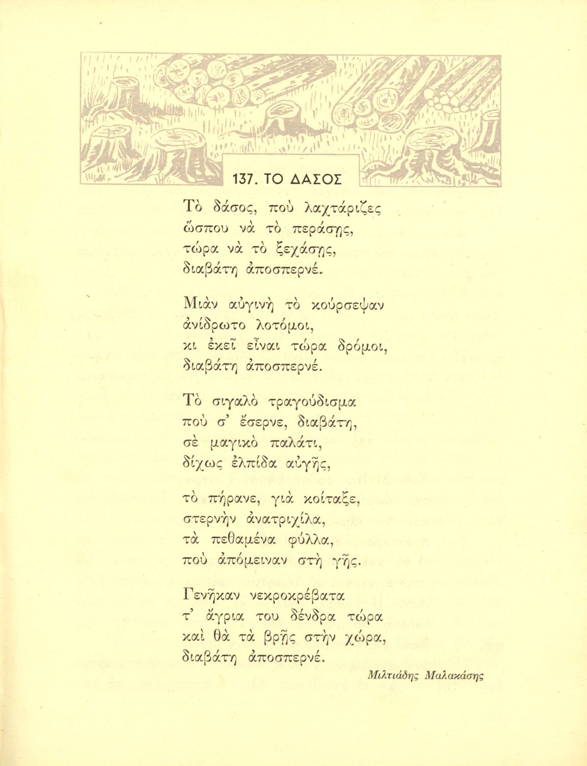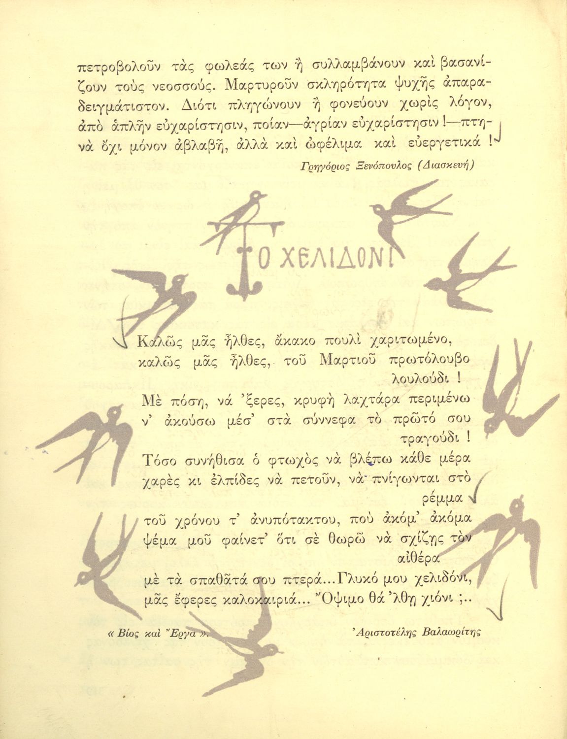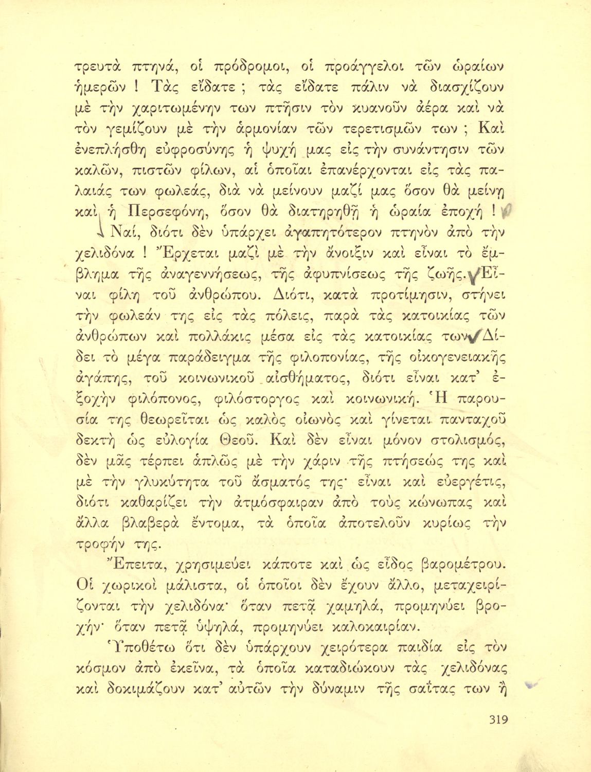 Αναγνωστικό ΣΤ΄ Δημοτικού που περιλαμβάνει θέματα από τις ελληνικές παραδόσεις και μύθους, την ελληνική φύση και θάλασσα και το τρίπτυχο "Πατρίς-θρησκεία-οικογένειαα".