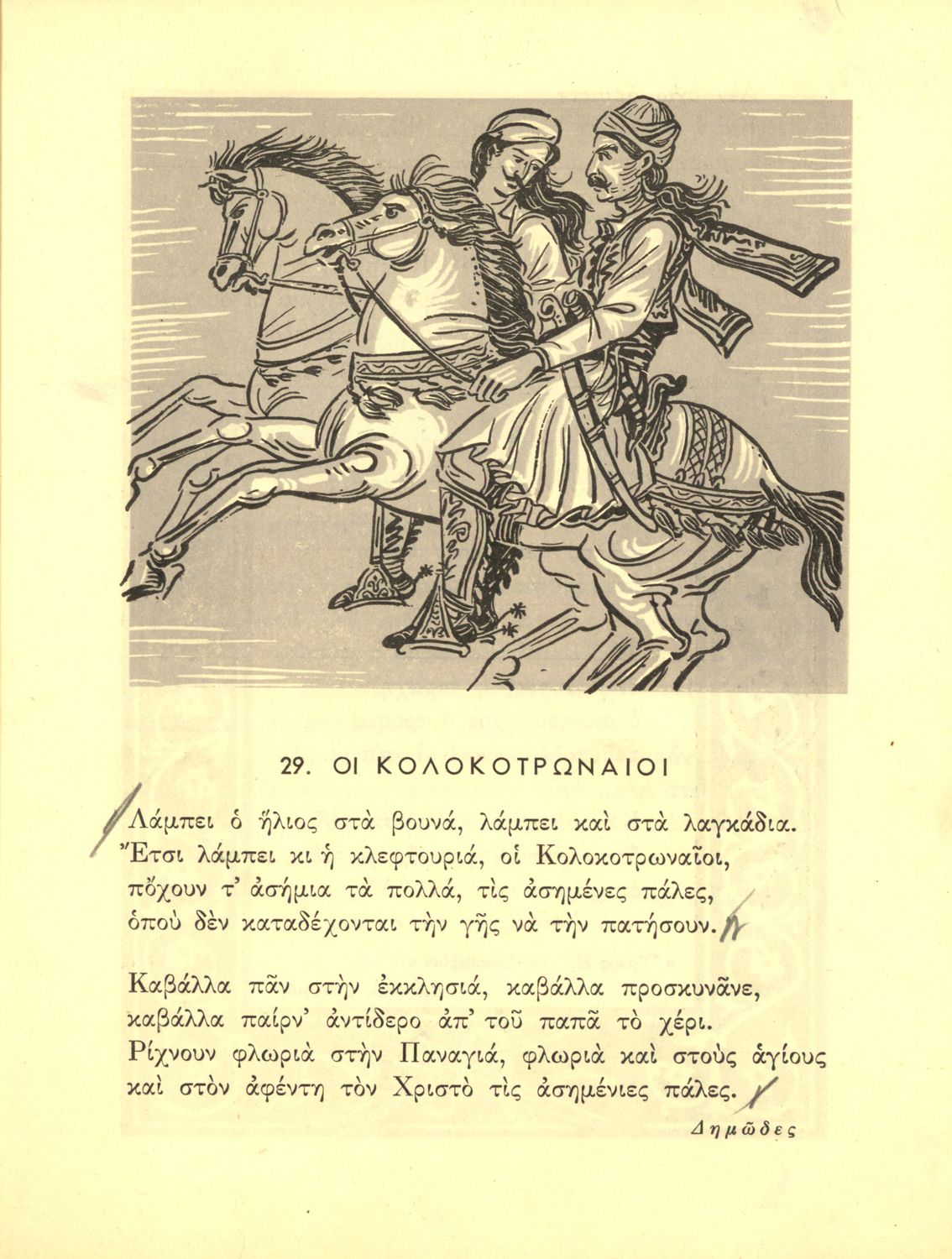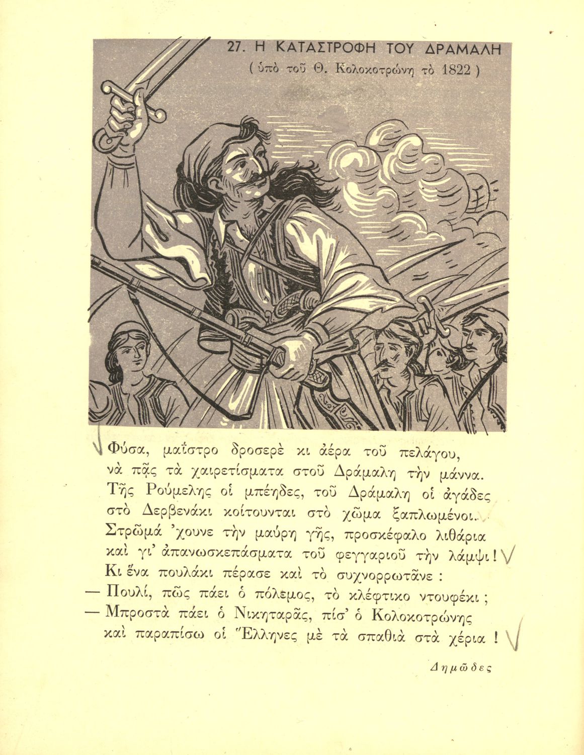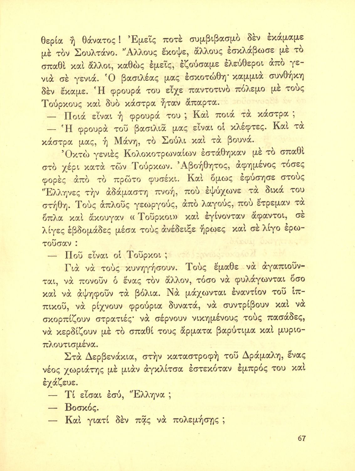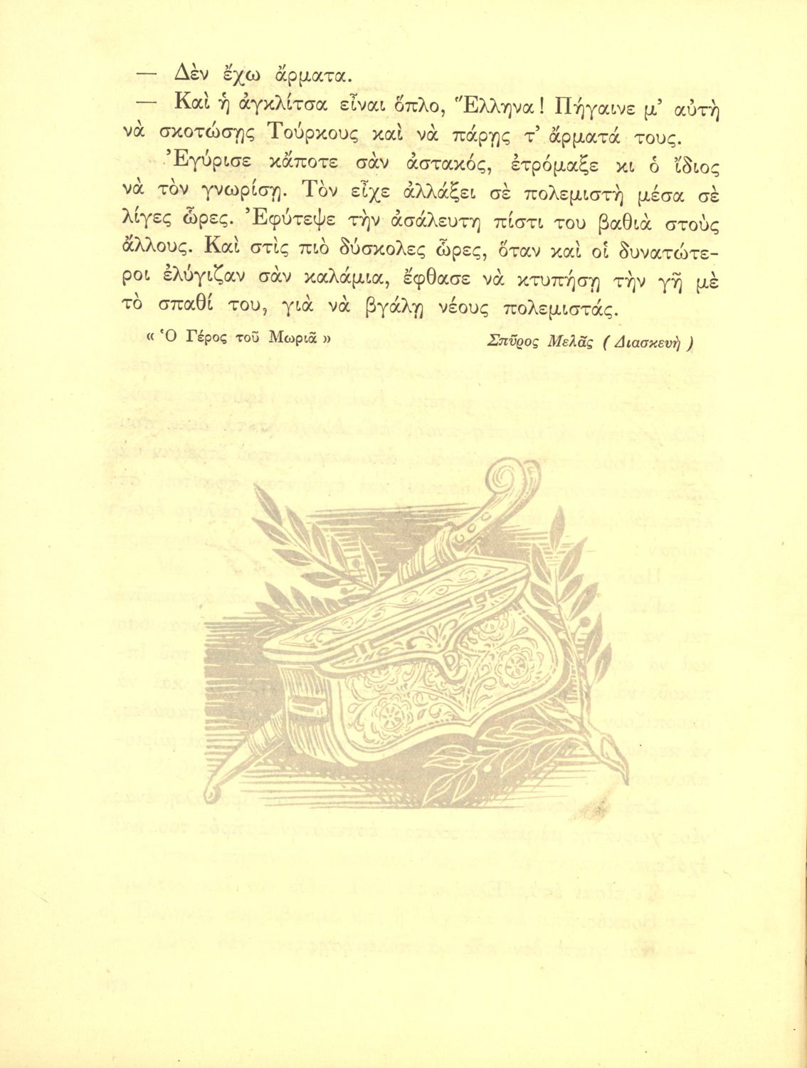 Αναγνωστικό ΣΤ΄ Δημοτικού που περιλαμβάνει θέματα από τις ελληνικές παραδόσεις και μύθους, την ελληνική φύση και θάλασσα και το τρίπτυχο "Πατρίς-θρησκεία-οικογένειαα".