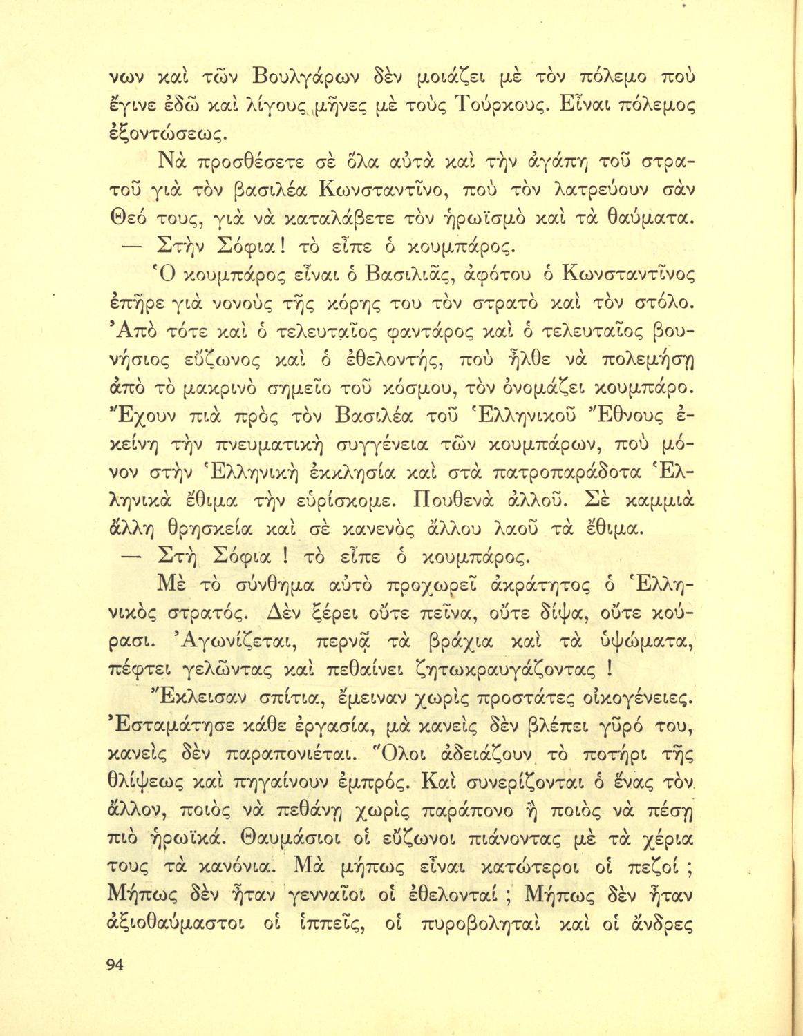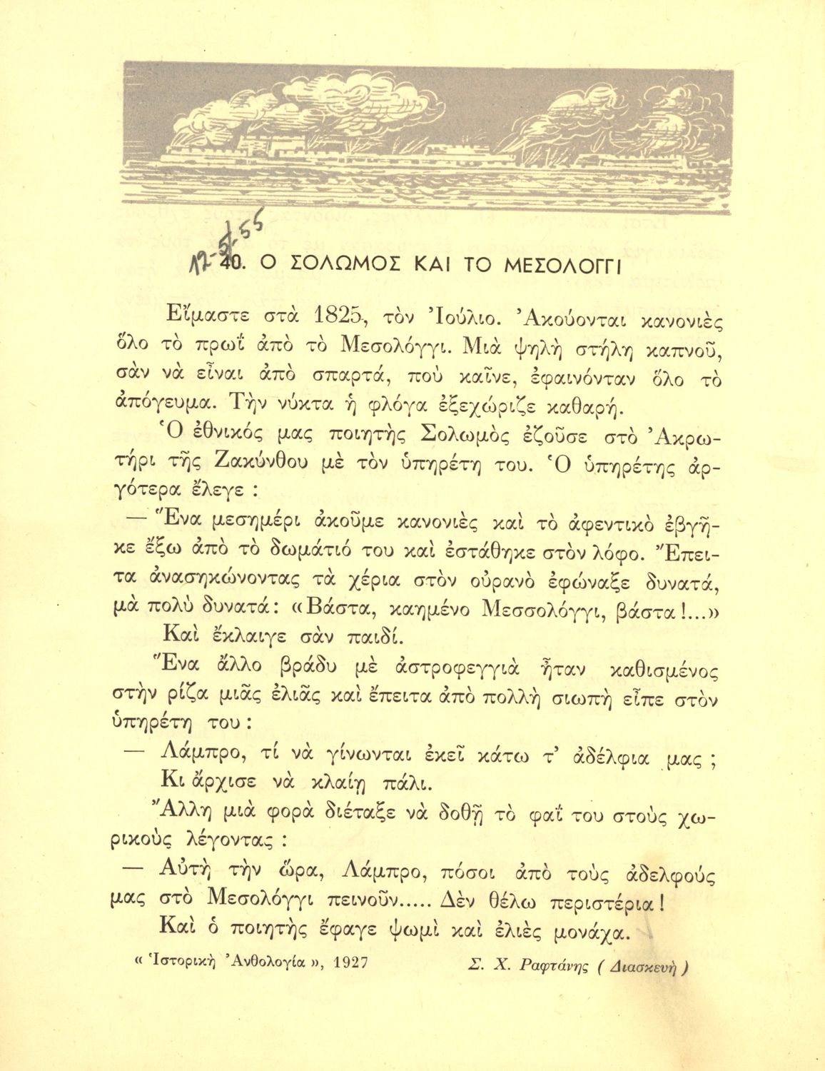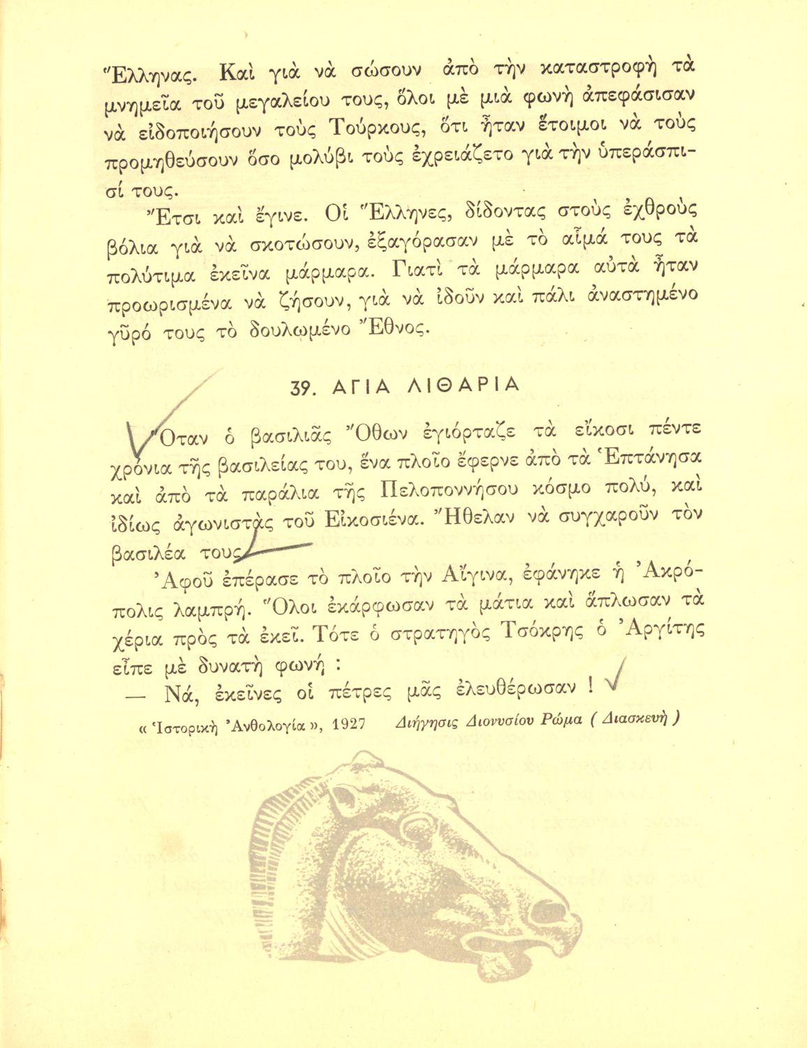 Αναγνωστικό ΣΤ΄ Δημοτικού που περιλαμβάνει θέματα από τις ελληνικές παραδόσεις και μύθους, την ελληνική φύση και θάλασσα και το τρίπτυχο "Πατρίς-θρησκεία-οικογένειαα".
