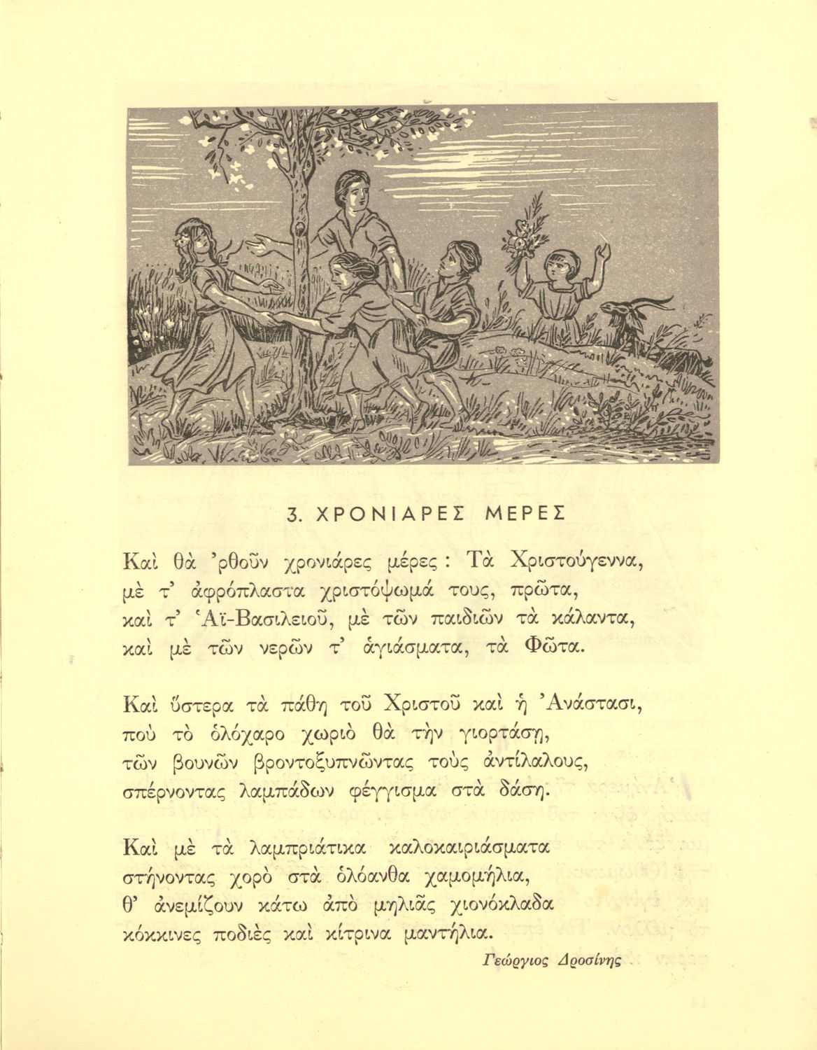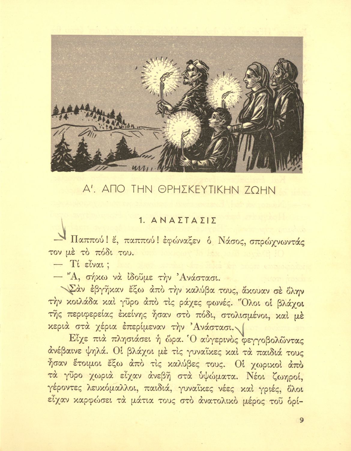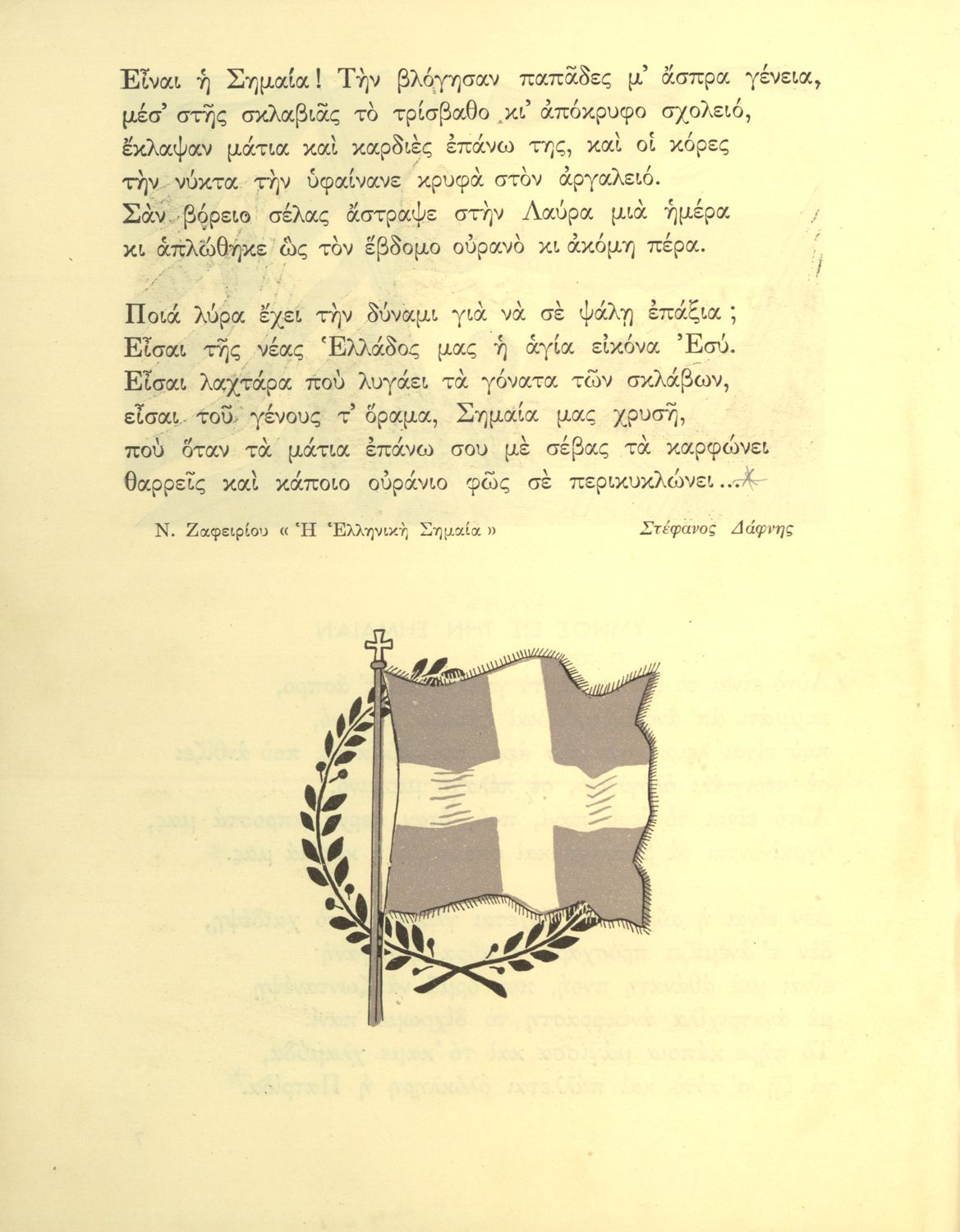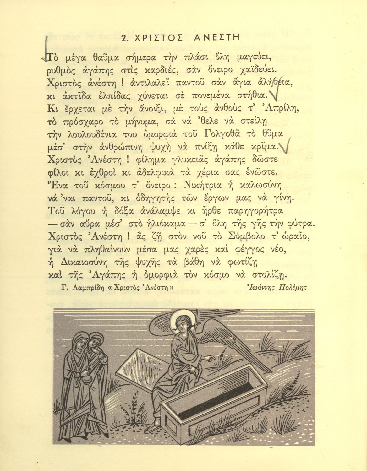 Αναγνωστικό ΣΤ΄ Δημοτικού που περιλαμβάνει θέματα από τις ελληνικές παραδόσεις και μύθους, την ελληνική φύση και θάλασσα και το τρίπτυχο "Πατρίς-θρησκεία-οικογένειαα".
