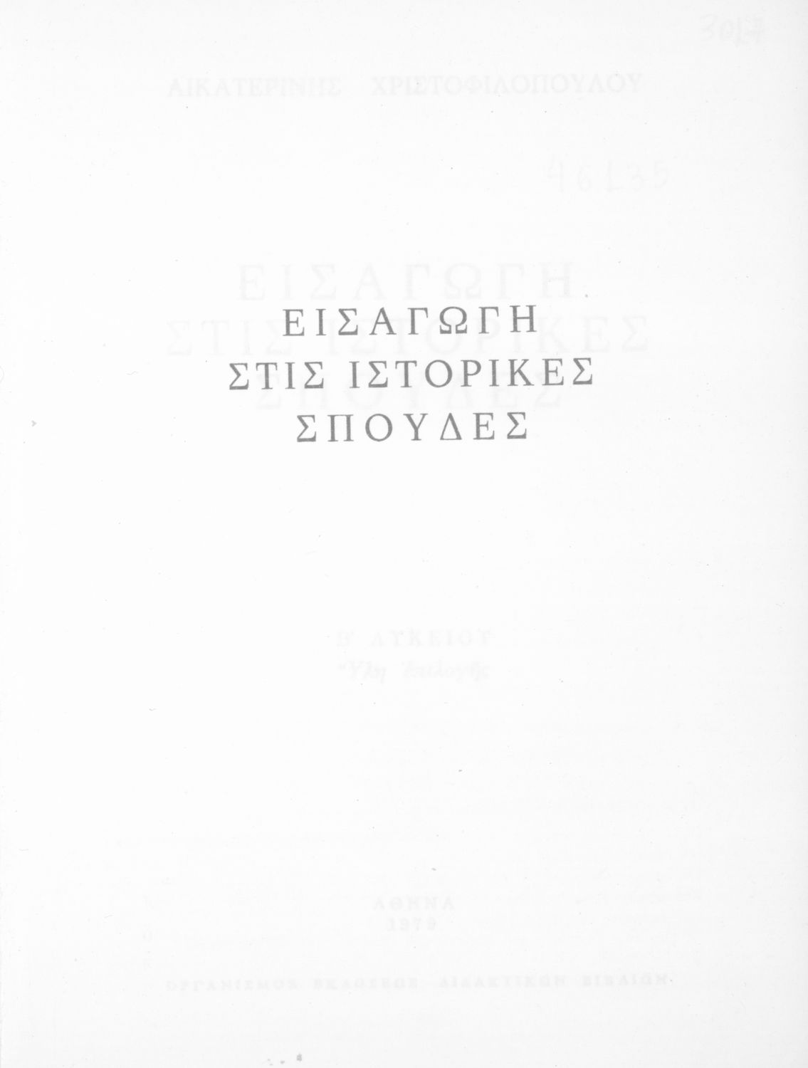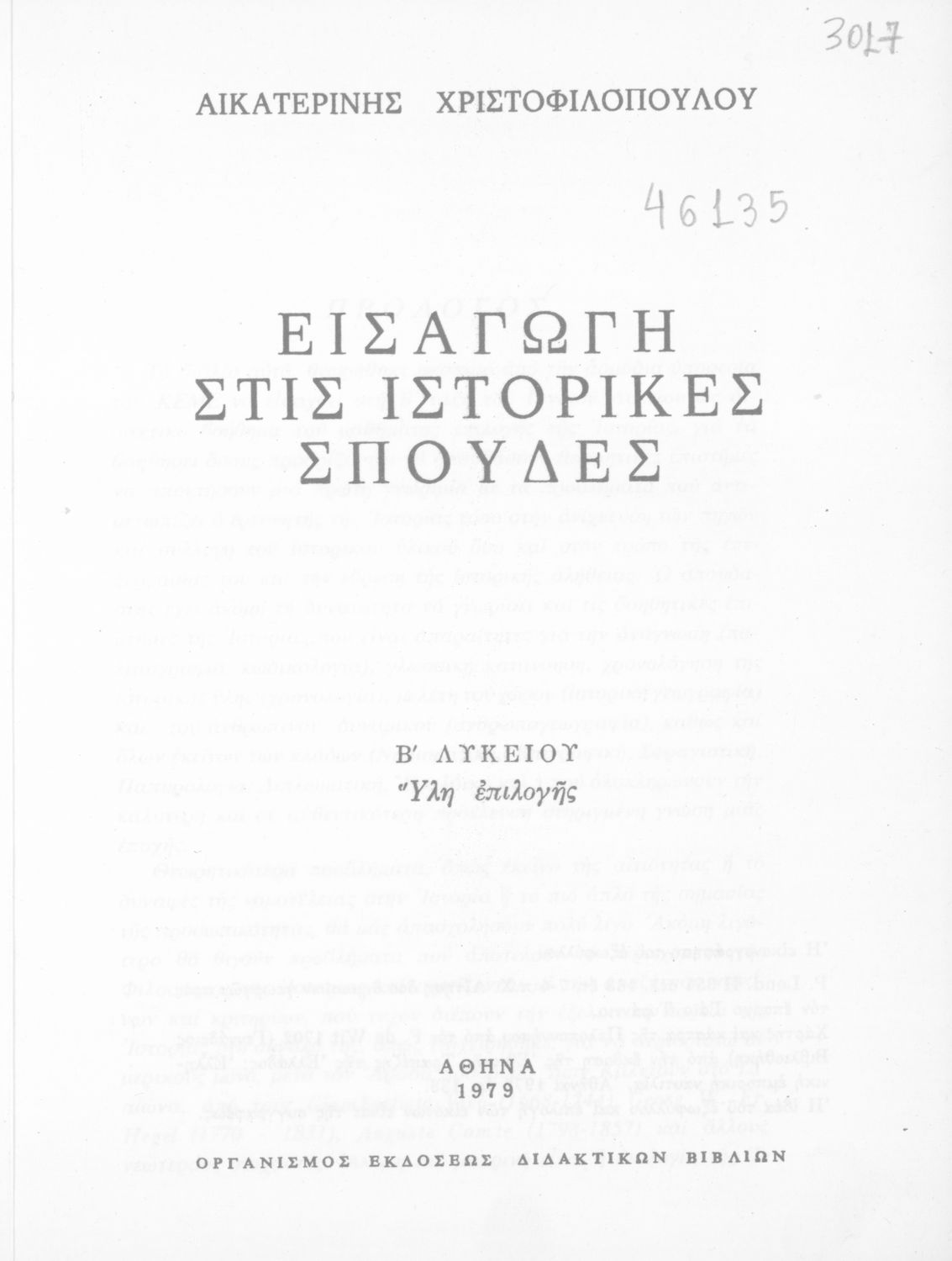 Κωδικός αναγνώρισης: 01-46135 Τίτλος: Εισαγωγή στις Ιστορικές σπουδές Β΄ Λυκείου ύλη επιλογής Συγγραφέας: Αικ. Χριστοφιλοπούλου Μέγεθος και υπόστρωμα: Σχολικό εγχειρίδιο, μαλακό εξώφυλλο, 128 σελίδες. Σκίτσα, εικόνες χάρτης (έγχρωμα). |