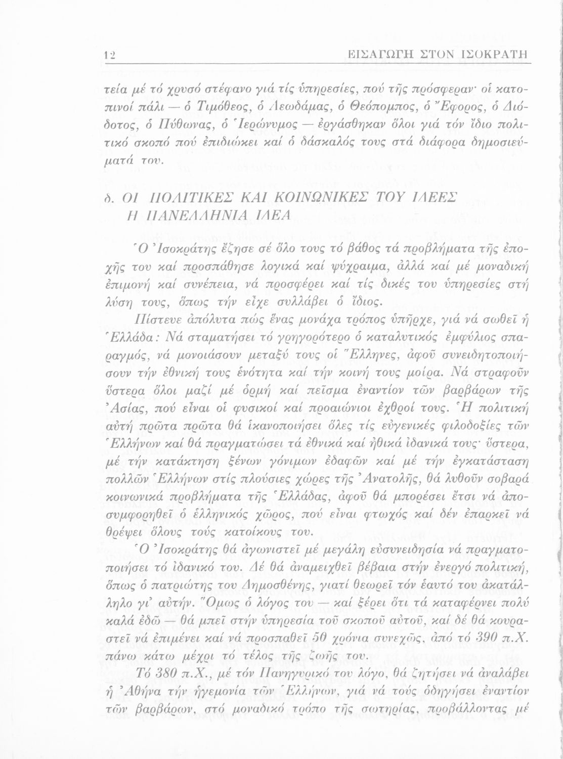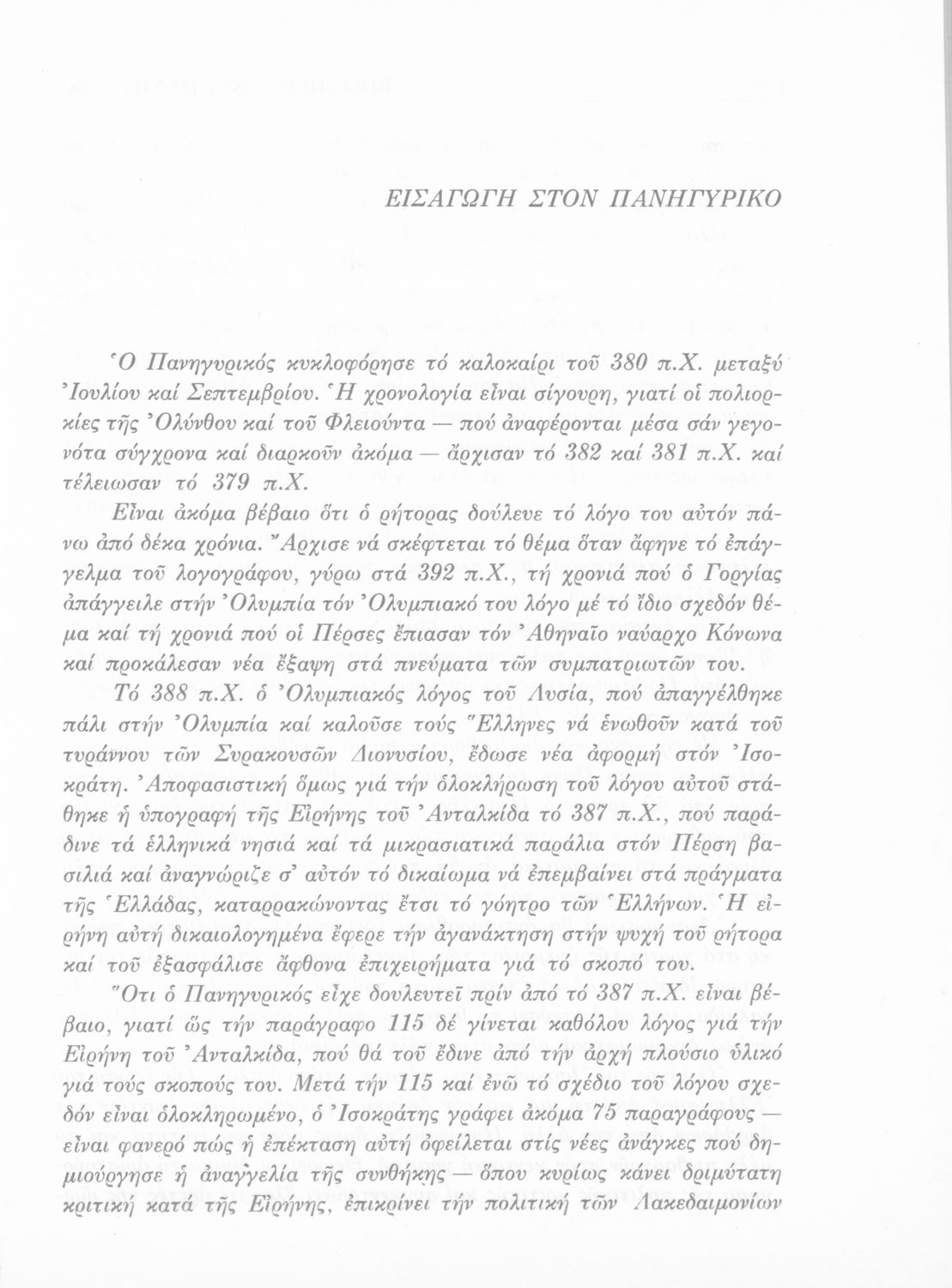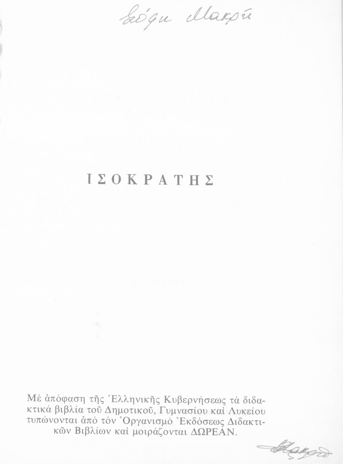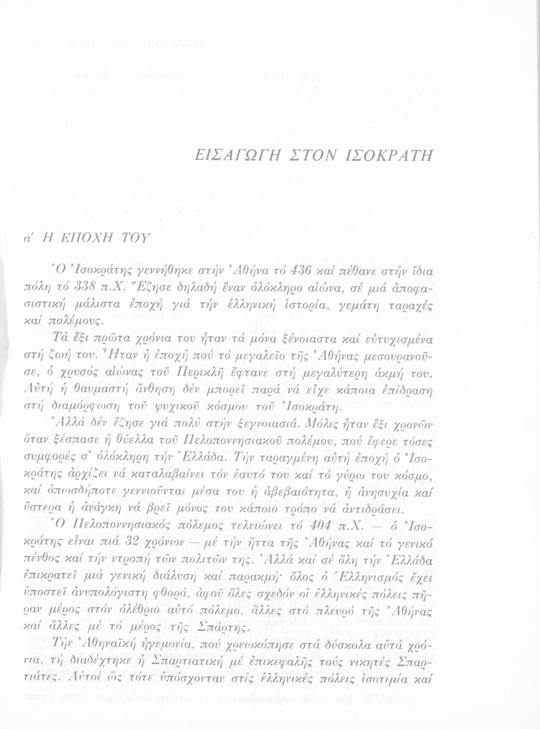 Σχολικό εγχειρίδιο Αρχαίων Ελληνικών Β΄ Γυμνασίου που περιλαμβάνει εισαγωγή στη ζωή και το έργο του Ισοκράτη, τον Πανηγυρικό, μετάφραση και ερμηνευτικές σημειώσεις.