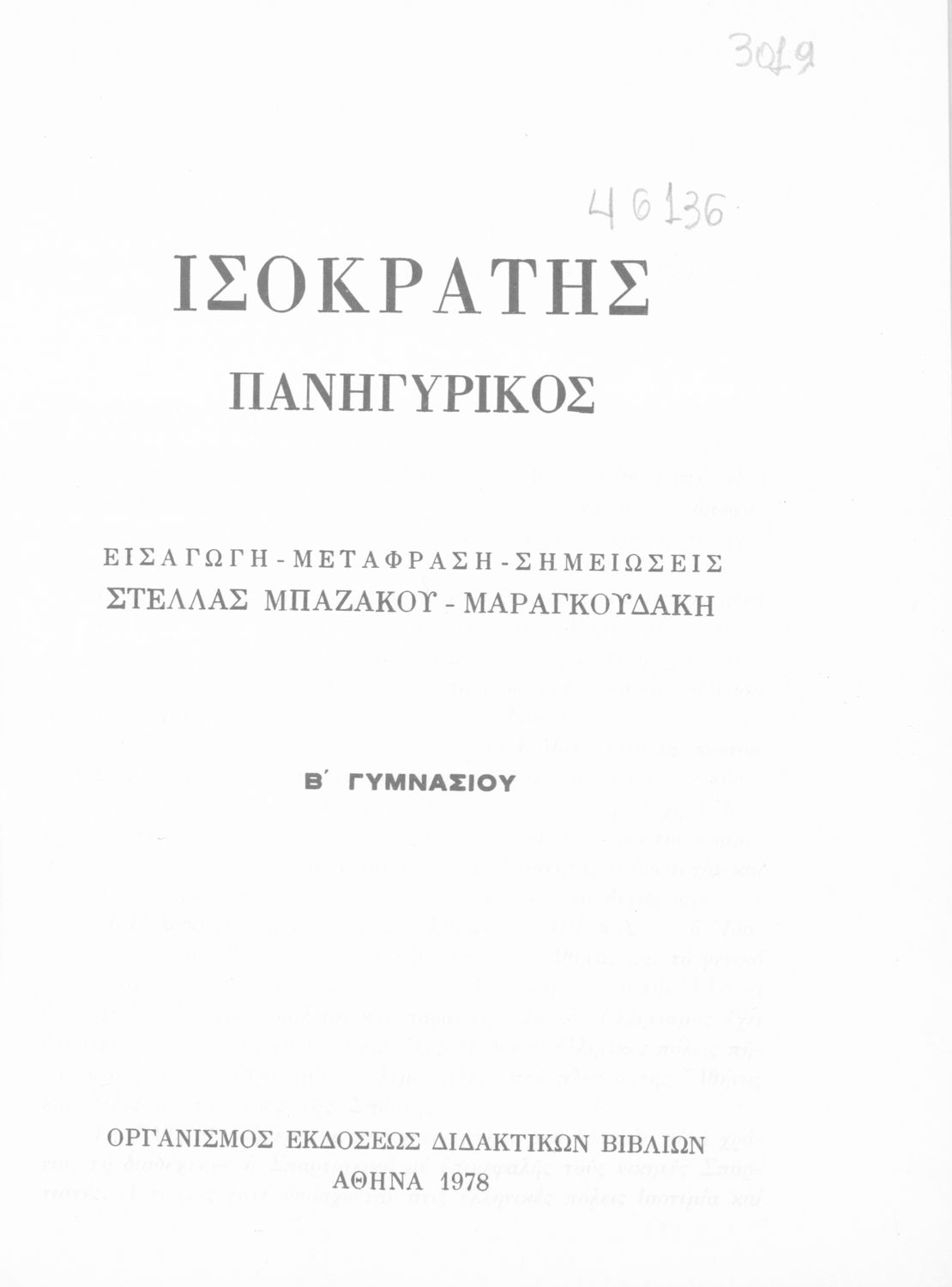 Κωδικός αναγνώρισης: 01-46136 Τίτλος: Ισοκράτης Πανηγυρικός Β΄ Γυμνασίου Συγγραφέας: Ισοκράτης, Στέλλα Μπαζάκου-Μαραγκουδάκη (εισαγωγή, μετάφραση, σημειώσεις) Μέγεθος και υπόστρωμα: Σχολικό εγχειρίδιο, 20εκ., μαλακό εξώφυλλο, 84 σελίδες. |