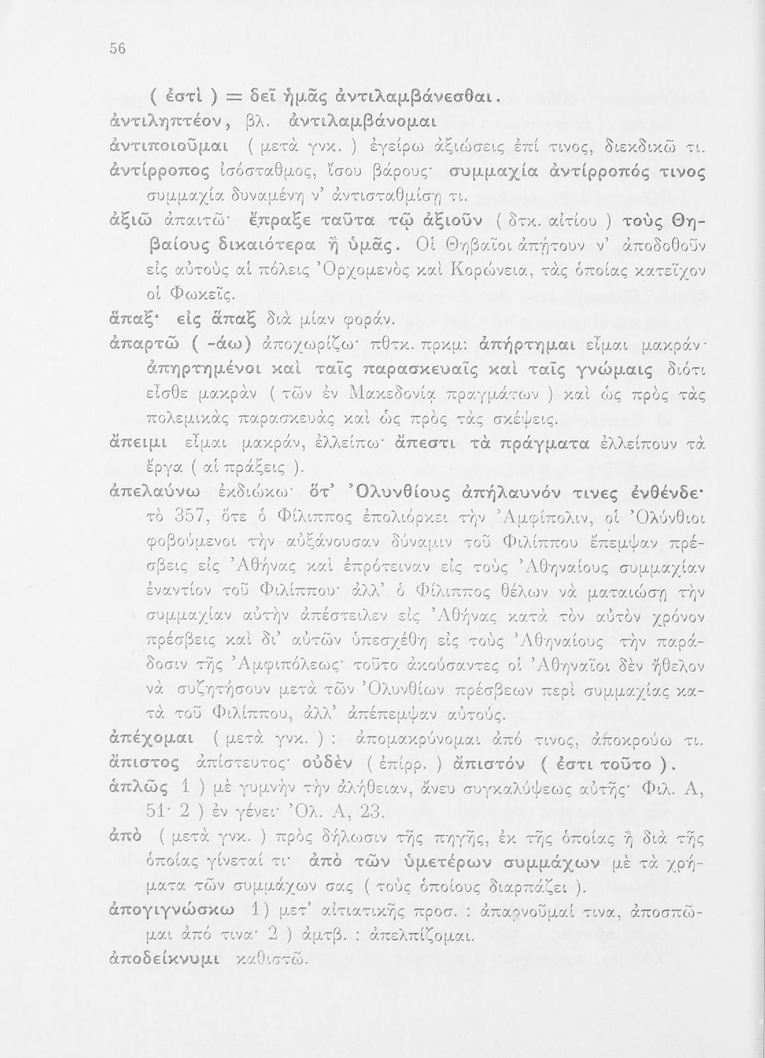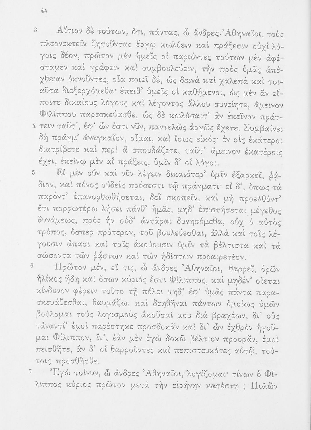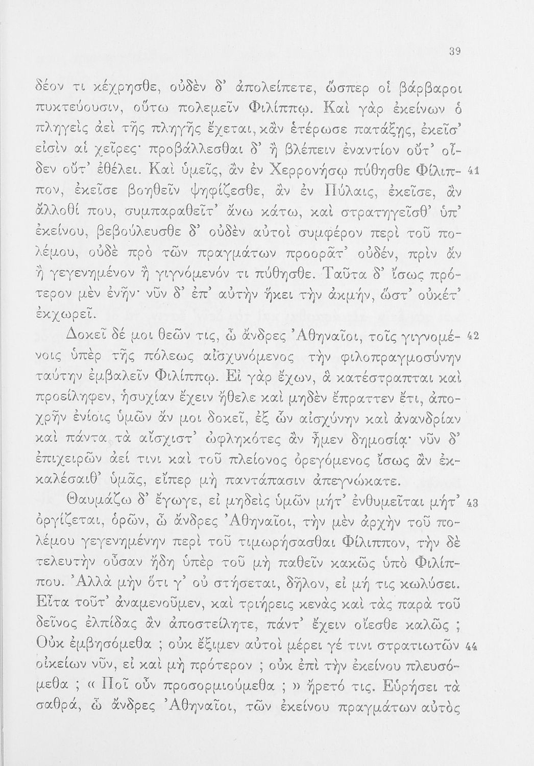 Σχολικό εγχειρίδιο Αρχαίων Ελληνικών Δ΄ Γυμνασίου που περιλαμβάνει εισαγωγή στη ζωή και στο έργο του Δημοσθένη, τον Α΄ κατά Φιλίππου, και τους Α΄ και Β΄ Ολυνθιακούς και ερμηνευτικά και ετυμολογικά σχόλια.