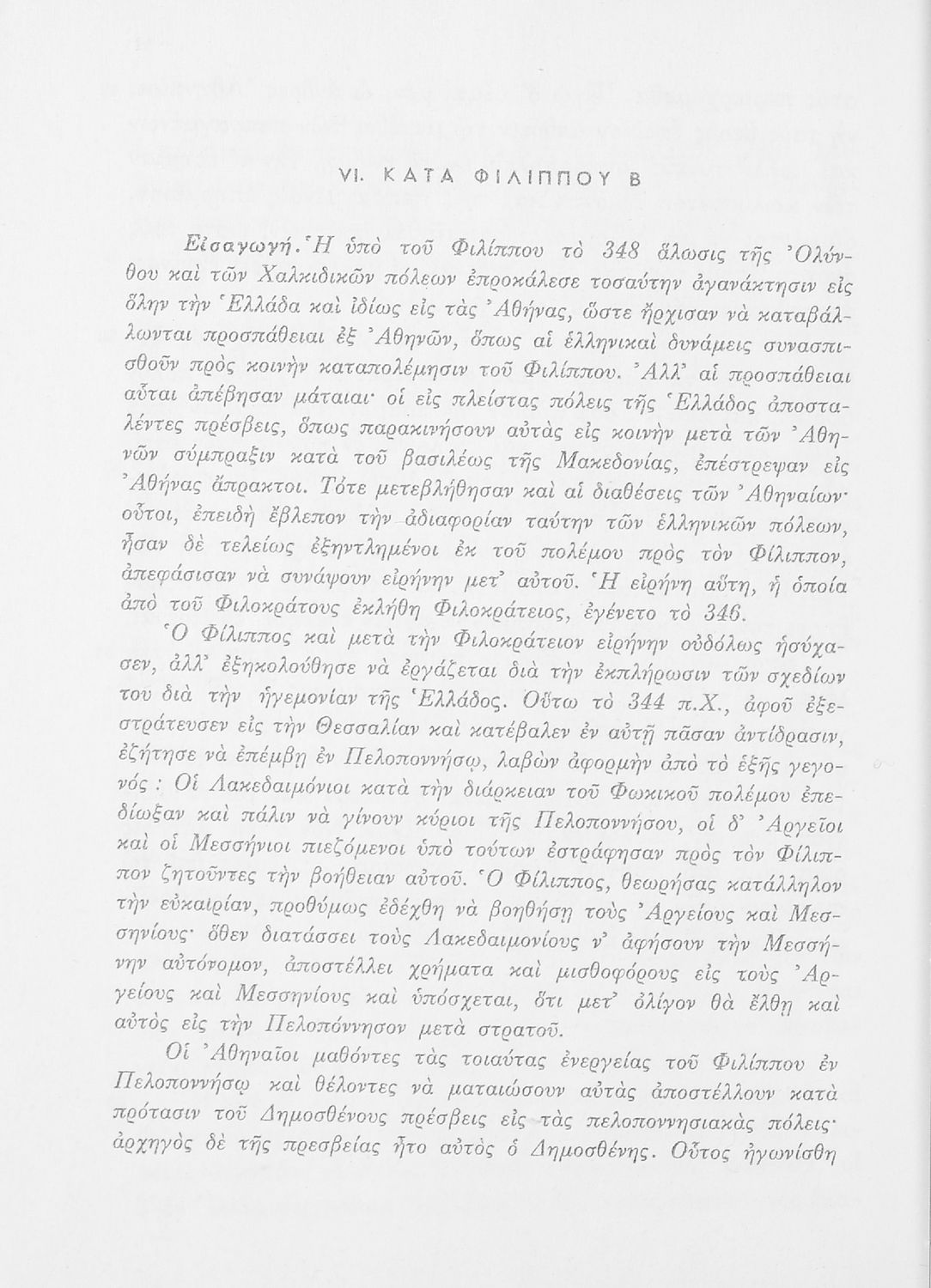 Σχολικό εγχειρίδιο Αρχαίων Ελληνικών Γυμνασίου που περιλαμβάνει τους Ολυνθιακούς Α΄ και Β΄ και τους Φιλιππικούς Α΄ και Β' του Δημοσθένη, εισαγωγή και ερμηνευτικά σχόλια.