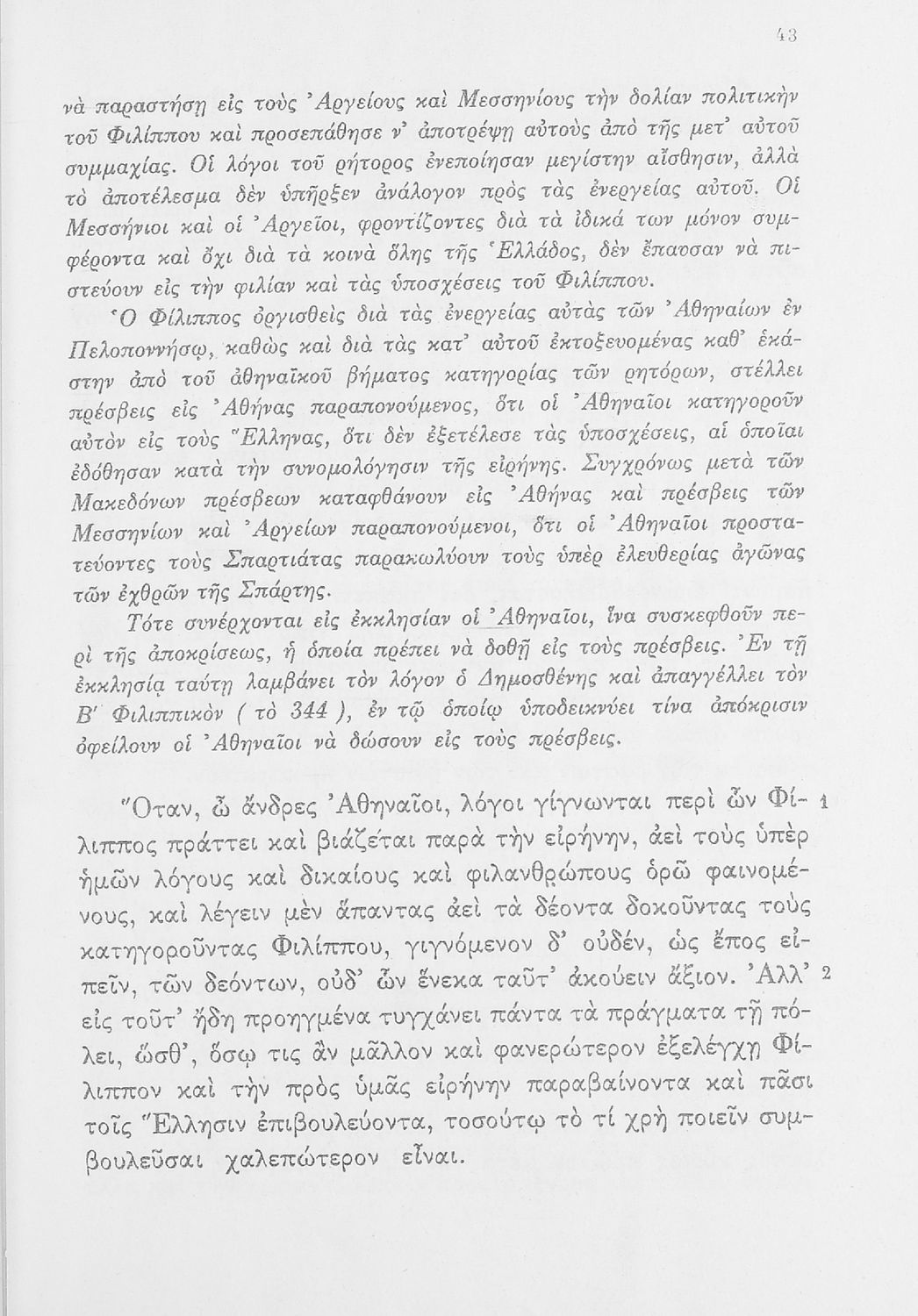 Σχολικό εγχειρίδιο Αρχαίων Ελληνικών Δ΄ Γυμνασίου που περιλαμβάνει τους Ολυνθιακούς Α΄ και Β΄ και τους Φιλιππικούς Α΄ και Β' του Δημοσθένη, εισαγωγή και ερμηνευτικά σχόλια. Φέρει το σύμβολο της δικτατορίας.