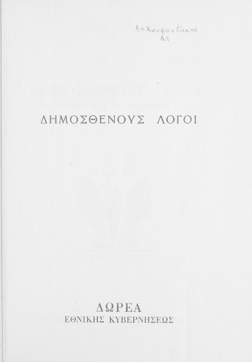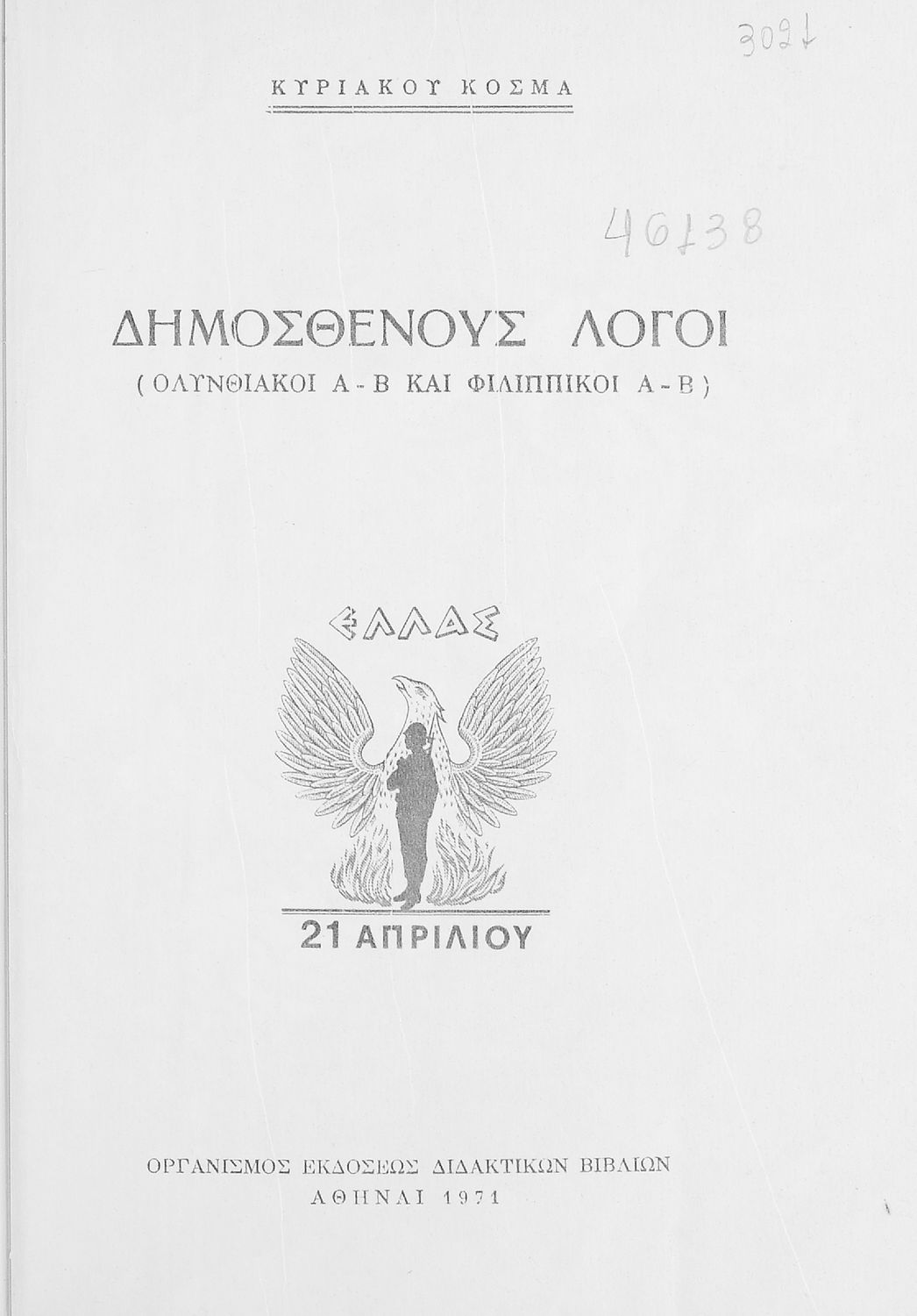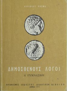 Σχολικό εγχειρίδιο Αρχαίων Ελληνικών Δ' Γυμνασίου που περιέχει τους Ολυνθιακούς Α΄ και Β΄ και τους Φιλιππικούς Α΄ και Β' του Δημοσθένη, ερμηνευτικά σχόλια και εισαγωγή στη ζωή και το έργο του Δημοσθένη. Φέρει το σύμβολο της δικτατορίας.