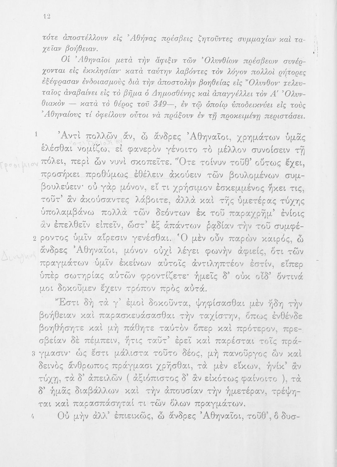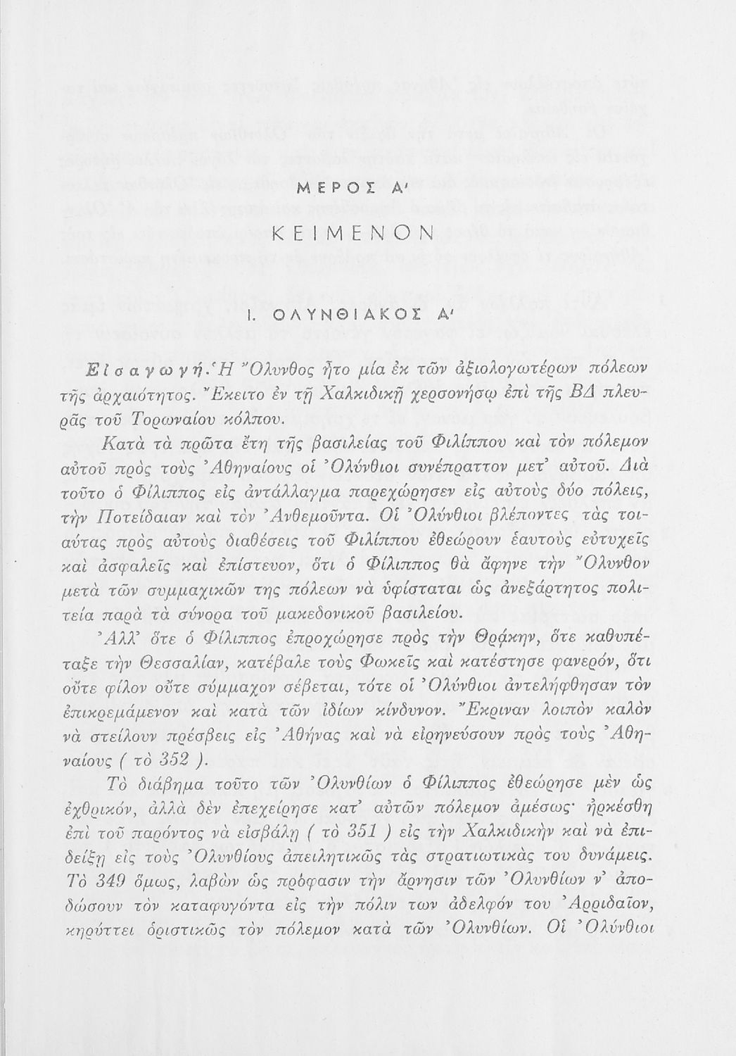 Σχολικό εγχειρίδιο Αρχαίων Ελληνικών Γυμνασίου που περιλαμβάνει τους Ολυνθιακούς Α΄ και Β΄ και τους Φιλιππικούς Α΄ και Β' του Δημοσθένη, εισαγωγή και ερμηνευτικά σχόλια.