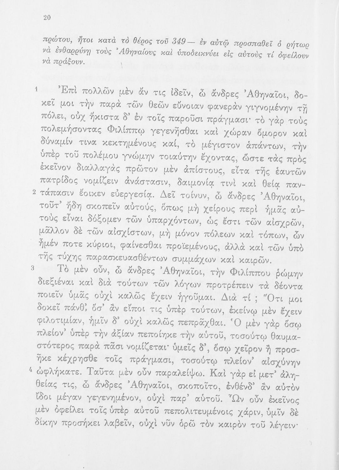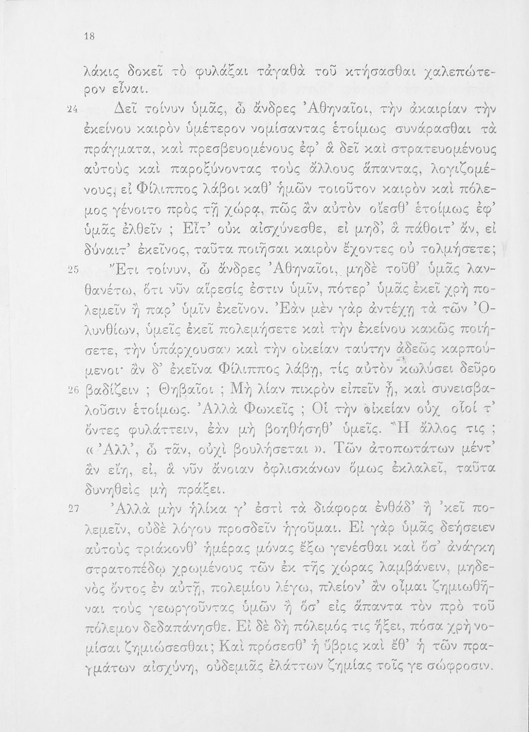 Σχολικό εγχειρίδιο Αρχαίων Ελληνικών Δ΄ Γυμνασίου που περιλαμβάνει εισαγωγή στη ζωή και στο έργο του Δημοσθένη, τον Α΄ κατά Φιλίππου, και τους Α΄ και Β΄ Ολυνθιακούς και ερμηνευτικά και ετυμολογικά σχόλια.