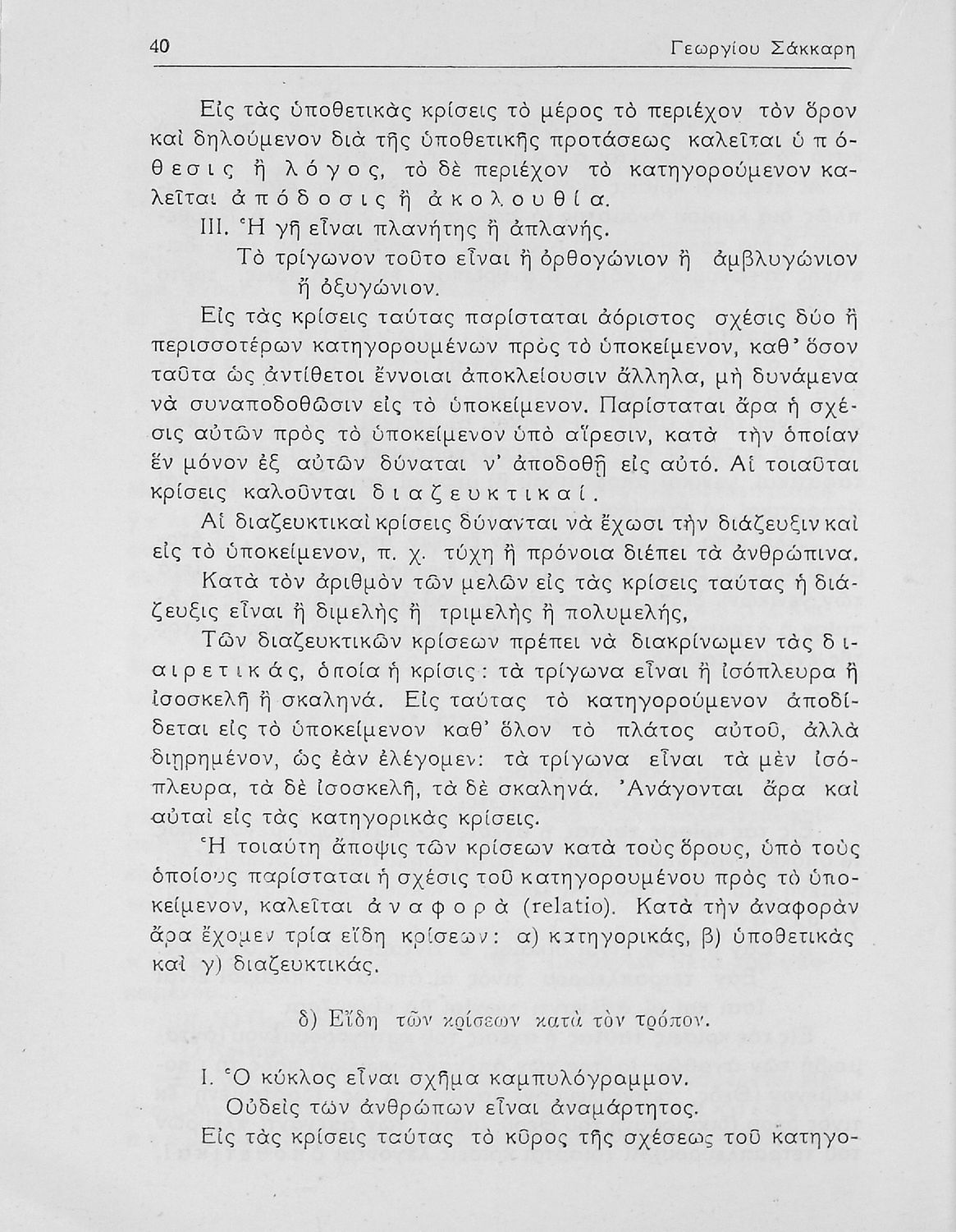 Κωδικός αναγνώρισης: 01-46140 Τίτλος: Στοιχειώδης λογική μετά στοιχείων γνωσιολογίας προς χρήσιν των μαθητών της ΣΤ΄ τάξεως των Εξαταξίων Γυμνασίων παλαιού τύπου Συγγραφέας: Γεώργιος Σακκάρης Μέγεθος και υπόστρωμα: Σχολικό εγχειρίδιο, 20εκ., μαλακό εξώφυλλο, 184 σελίδες. |
