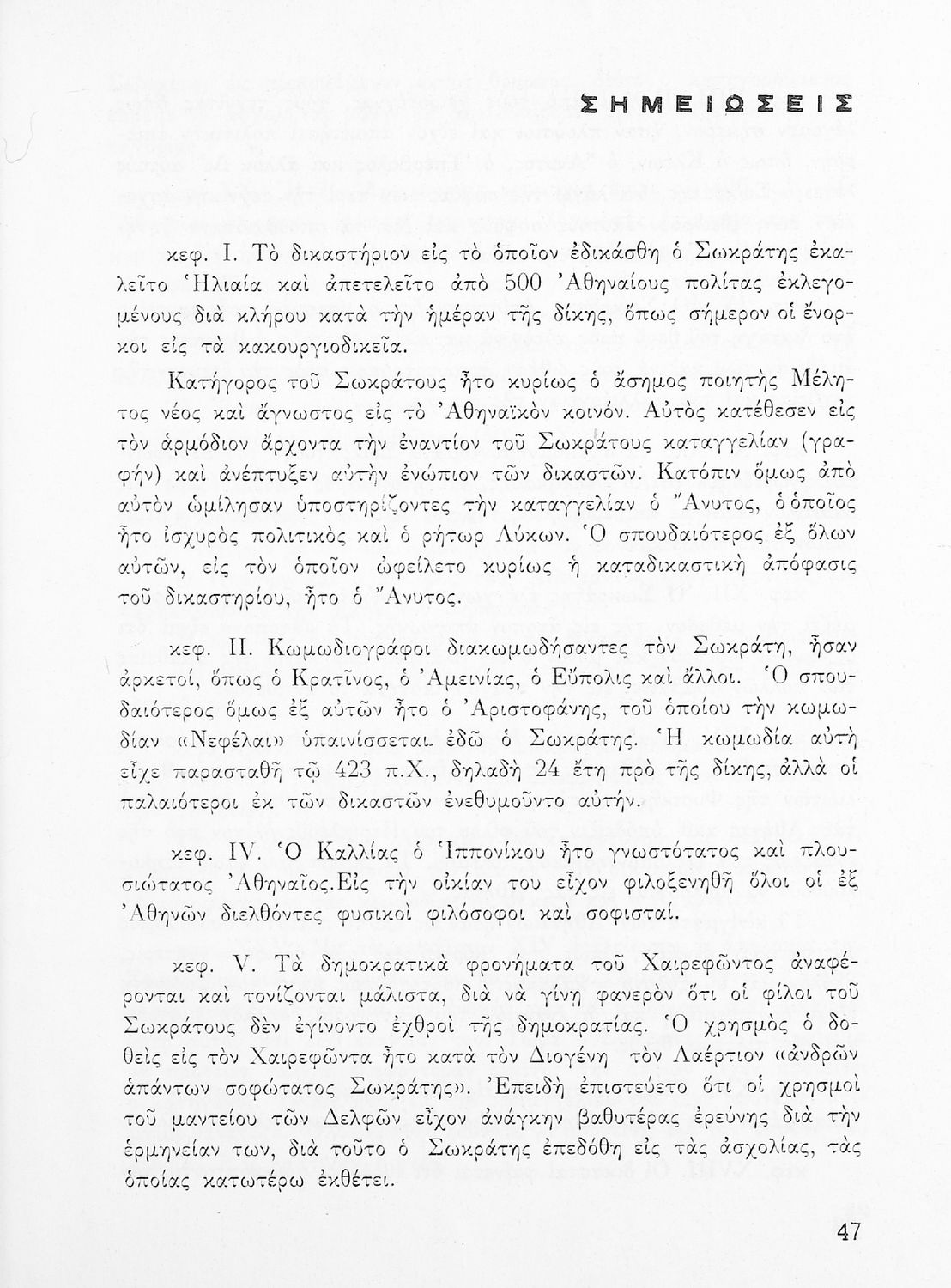 Μαθητικό βοήθημα Αρχαίων Ελληνικών Γυμνασίου που περιλαμβάνει τα κείμενα του Πλάτωνα Απολογία Σωκράτους, Κρίτων, Λάχης και πραγματολογικές παρατηρήσεις.