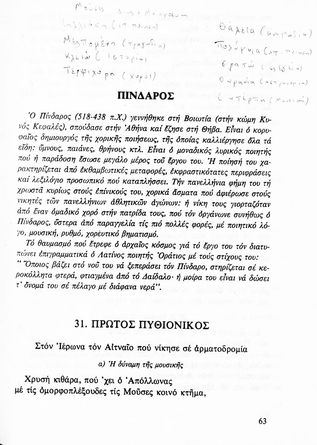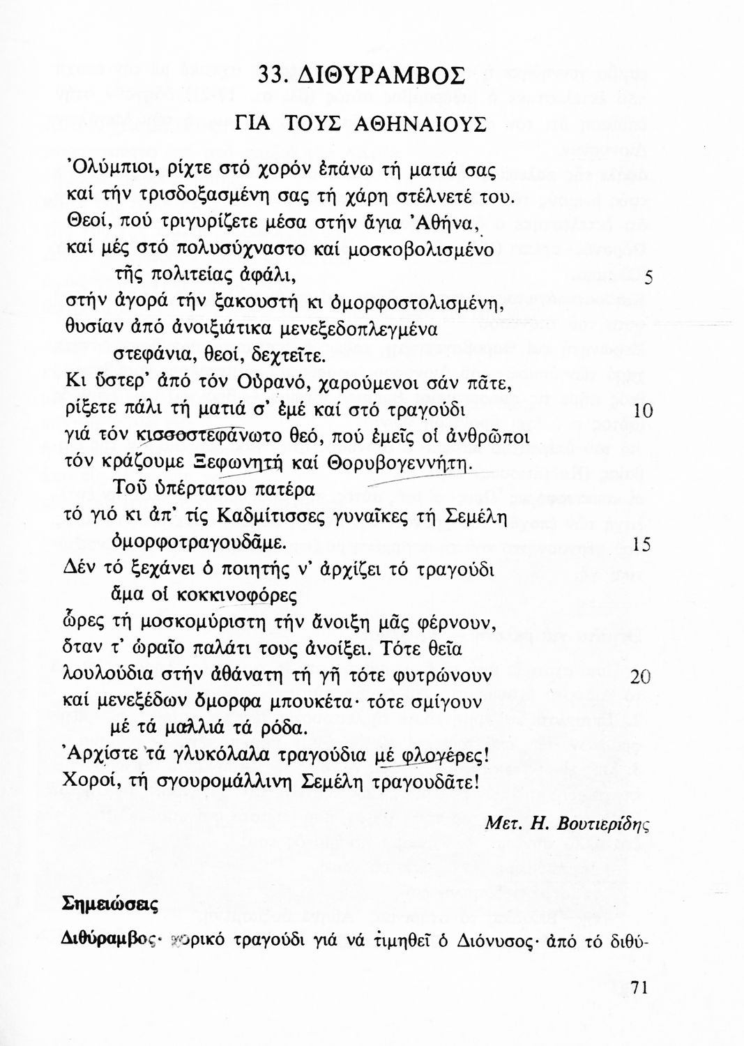 Σχολικό εγχειρίδιο Αρχαίων Ελληνικών Γ΄ Γυμνασίου που περιλαμβάνει εισαγωγή στην αρχαία λυρική ποίηση, χαρακτηριστικά δείγματα σε μετάφραση, πίνακα των κυριοτέρων ποιητών και του συγγραφικού τους έργου και ερμηνευτικές σημειώσεις.