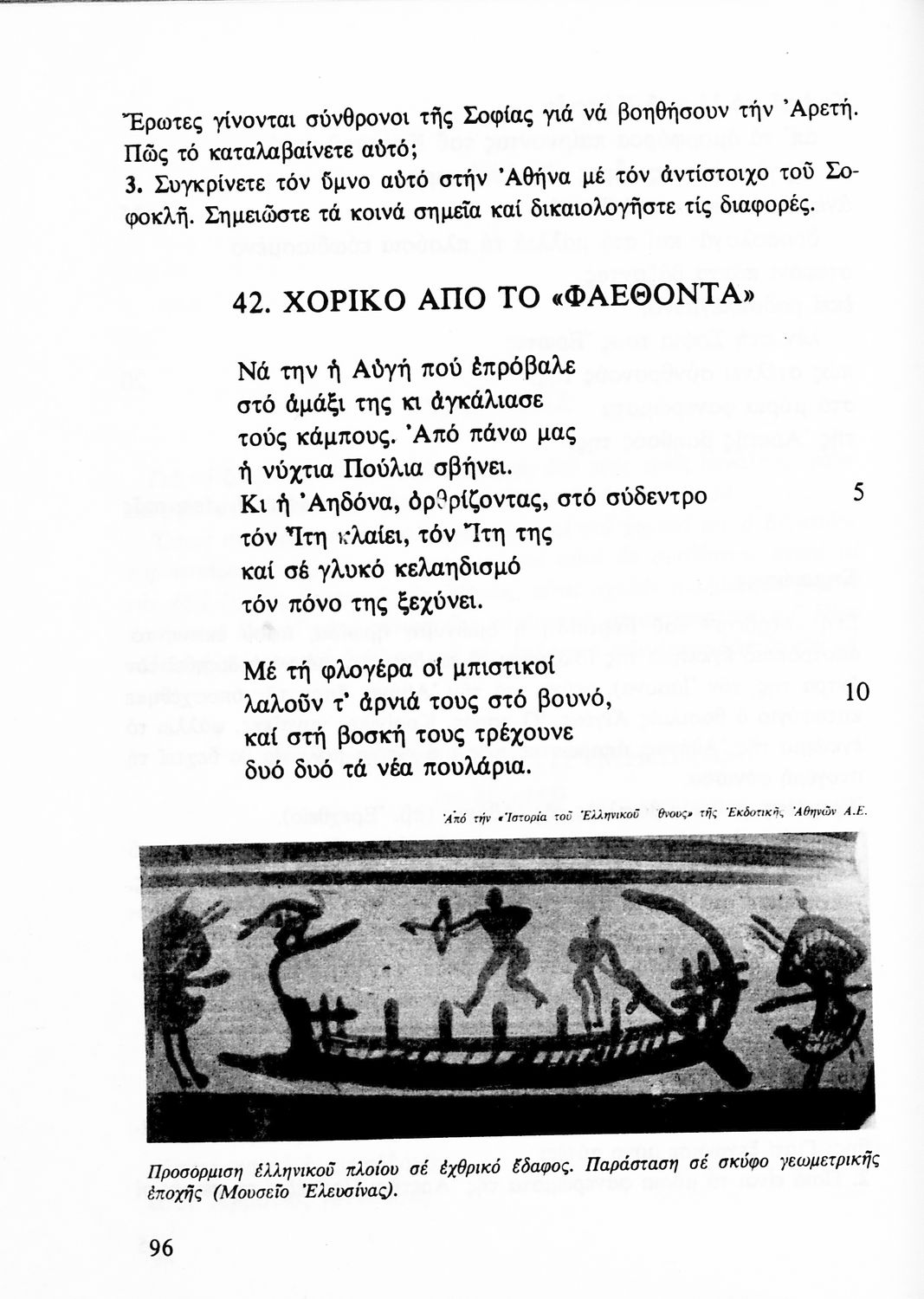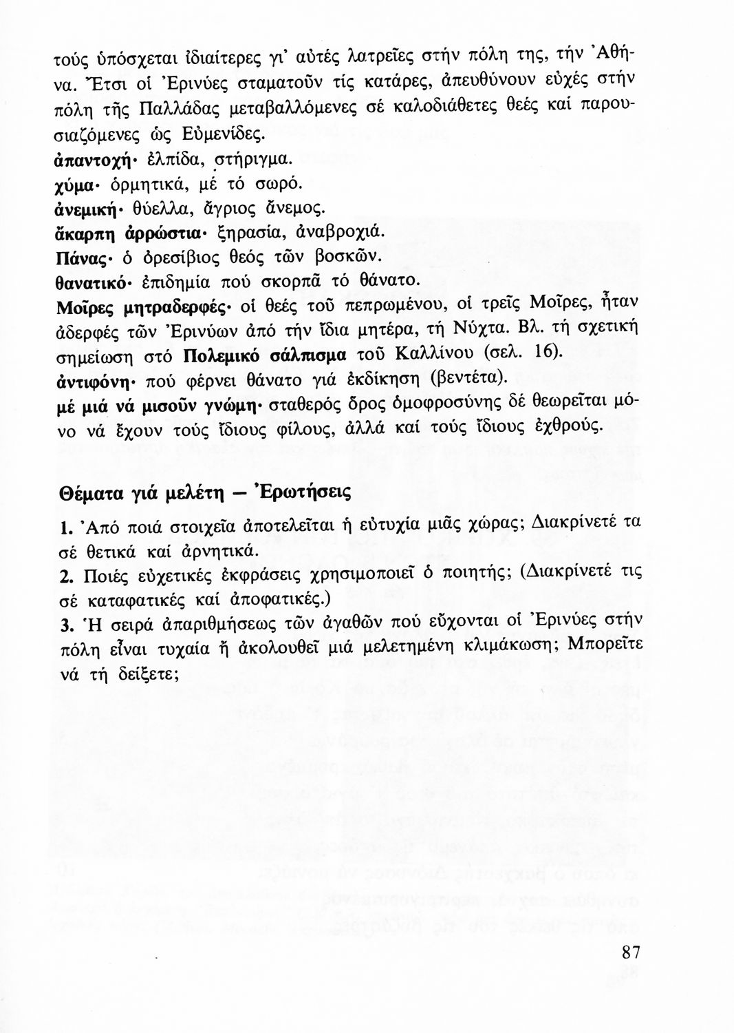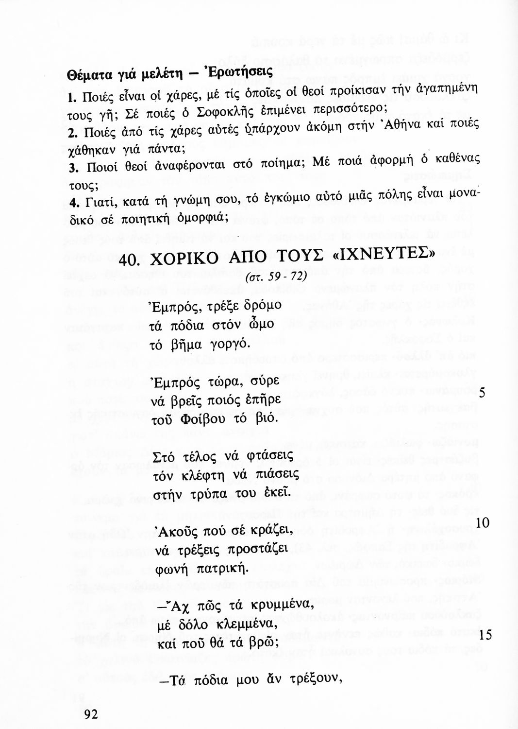 Βαθμίδα εκπαίδευσης: Δευτεροβάθμια Τάξη: Γ' Γυμνασίου Μάθημα: Αρχαία Ελληνικά Γλώσσα: Δημοτική Παρουσίαση περιεχομένου: Σχολικό εγχειρίδιο Αρχαίων Ελληνικών Γ΄ Γυμνασίου που περιλαμβάνει εισαγωγή στην αρχαία λυρική ποίηση, χαρακτηριστικά δείγματα σε μετάφραση, πίνακα των κυριοτέρων ποιητών και του συγγραφικού τους έργου και ερμηνευτικές σημειώσεις. |
