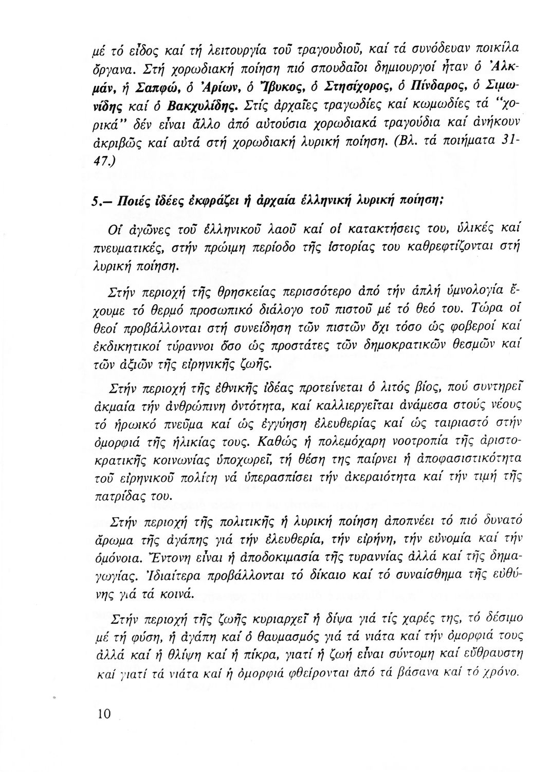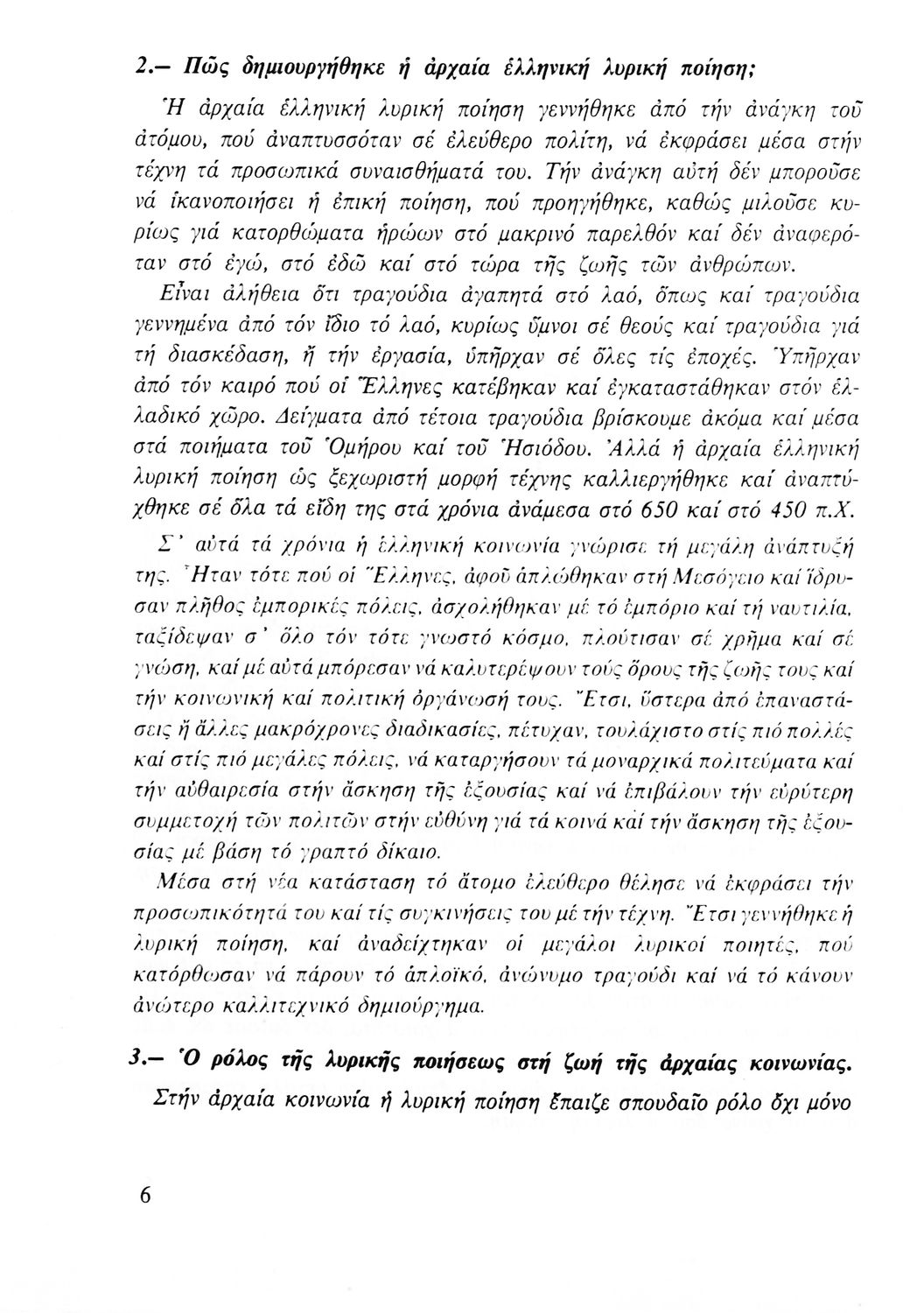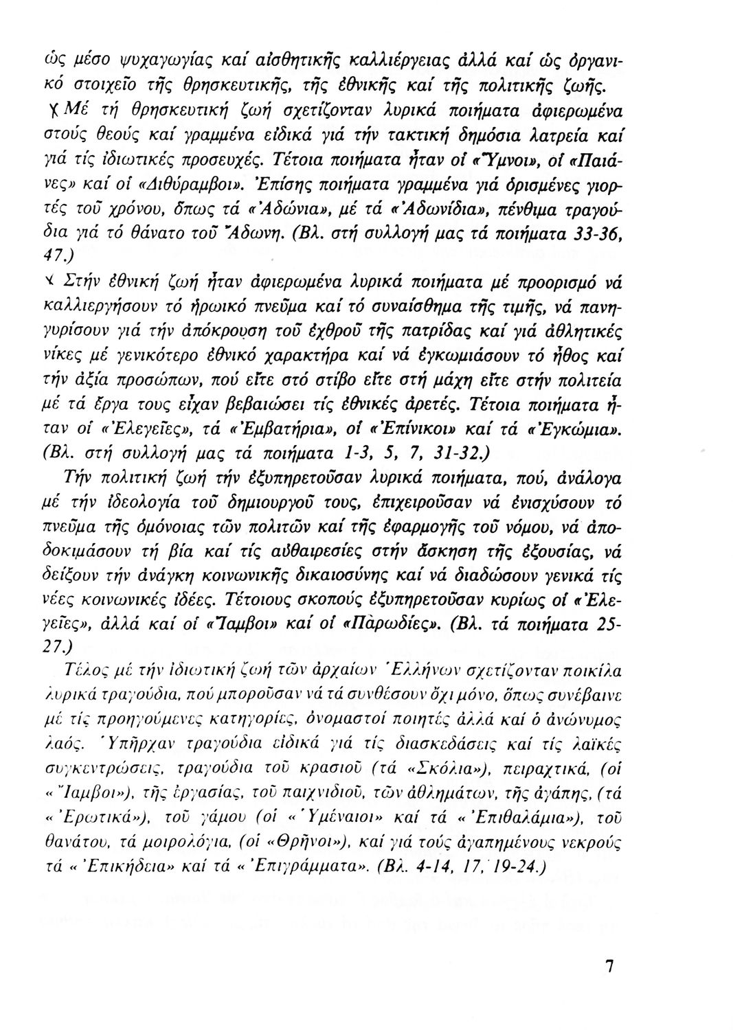 Σχολικό εγχειρίδιο Αρχαίων Ελληνικών Γ΄ Γυμνασίου που περιλαμβάνει εισαγωγή στην αρχαία λυρική ποίηση, χαρακτηριστικά δείγματα σε μετάφραση, πίνακα των κυριοτέρων ποιητών και του συγγραφικού τους έργου και ερμηνευτικές σημειώσεις.