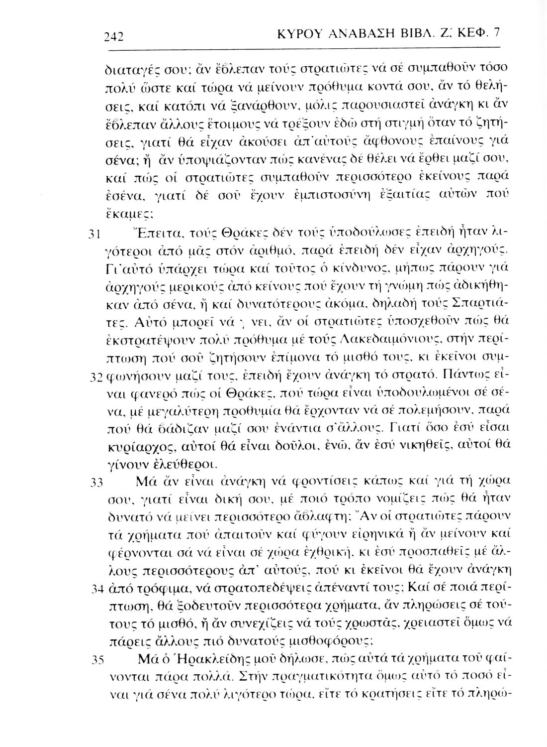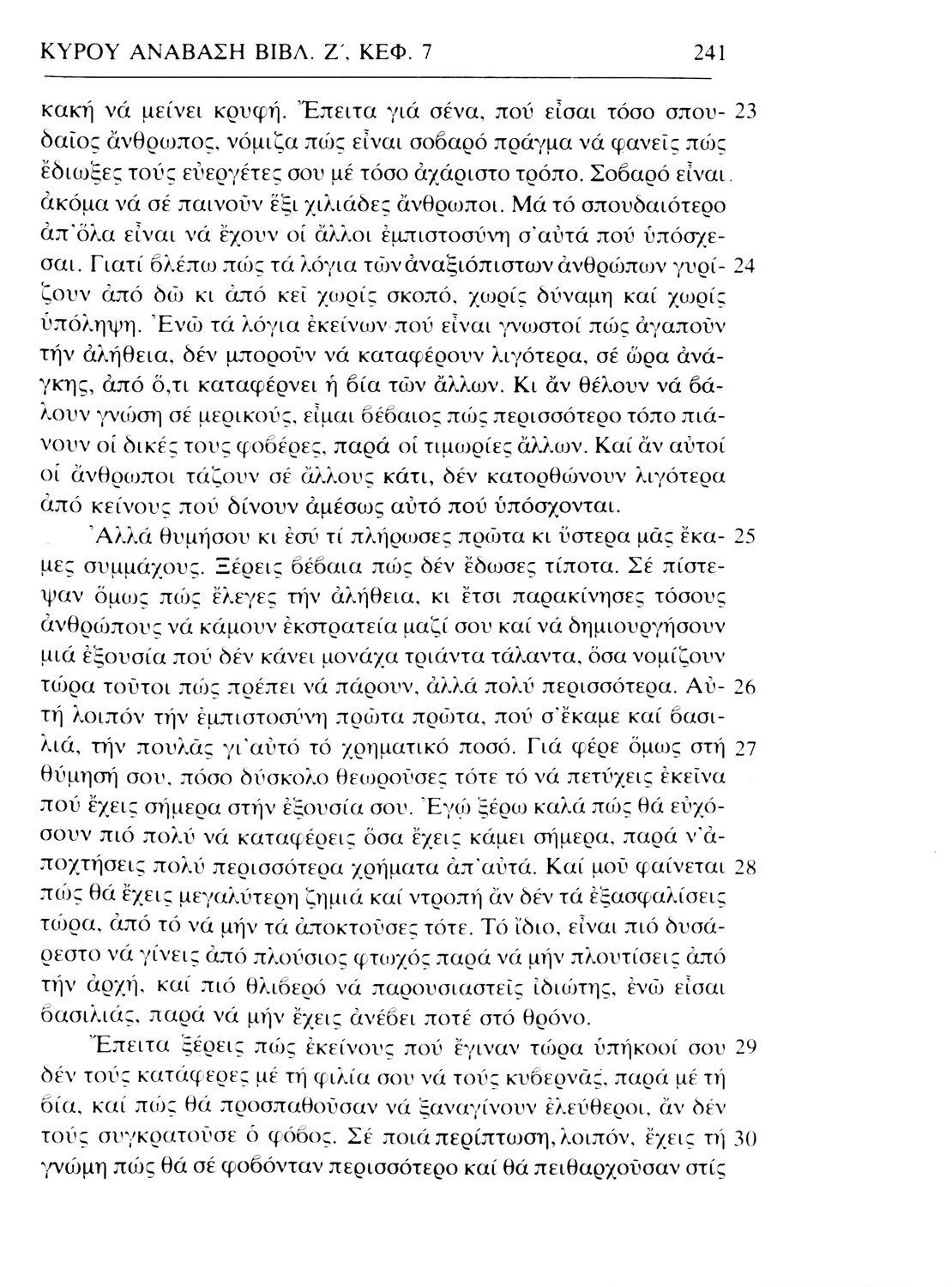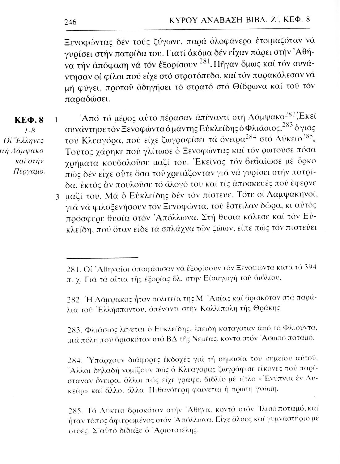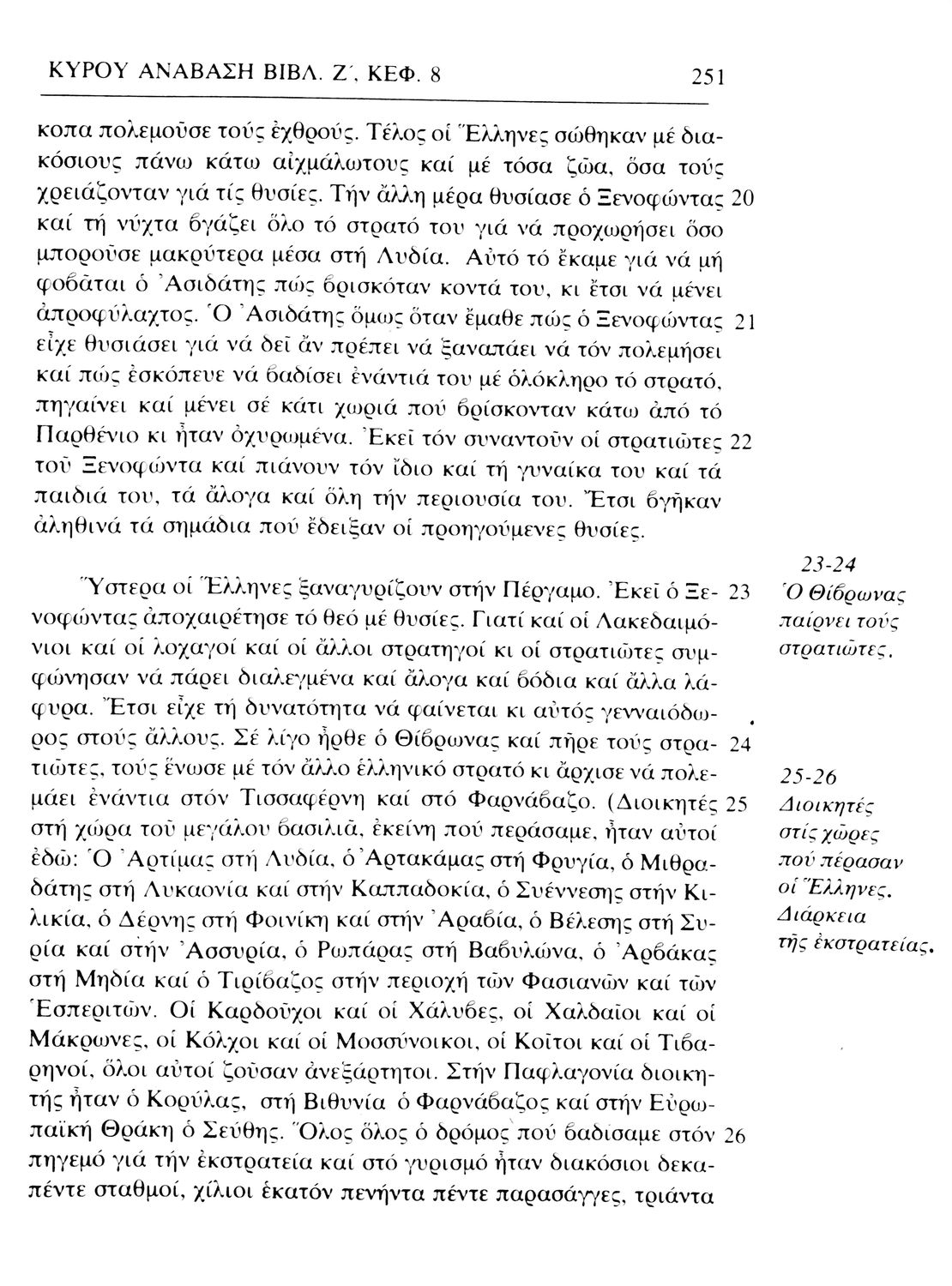 Σχολικό εγχειρίδιο Αρχαίων Ελληνικών α΄ Γυμνασίου που περιλαμβάνει μετάφραση του έργου του Ξενοφώντα Κύρου Ανάβασις, εισαγωγικά σχόλια για τη ζωή και το έργο του, και ερμηνευτικές παρατηρήσεις.