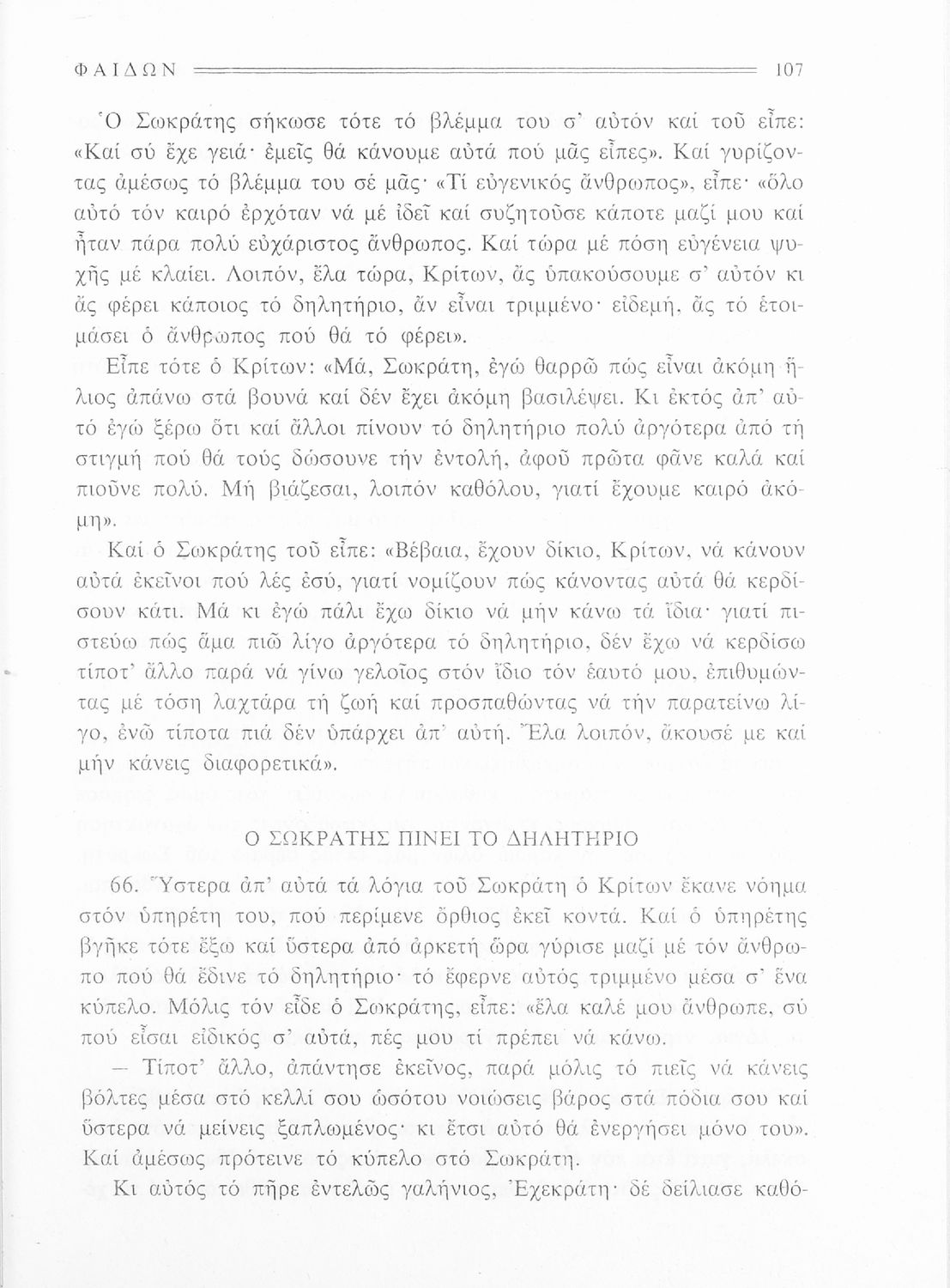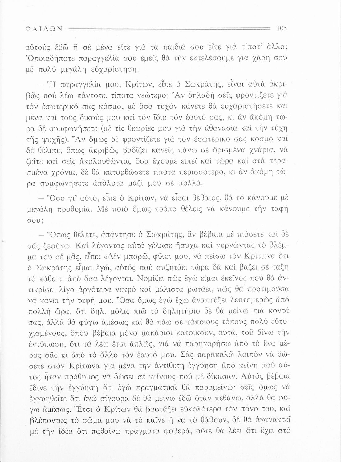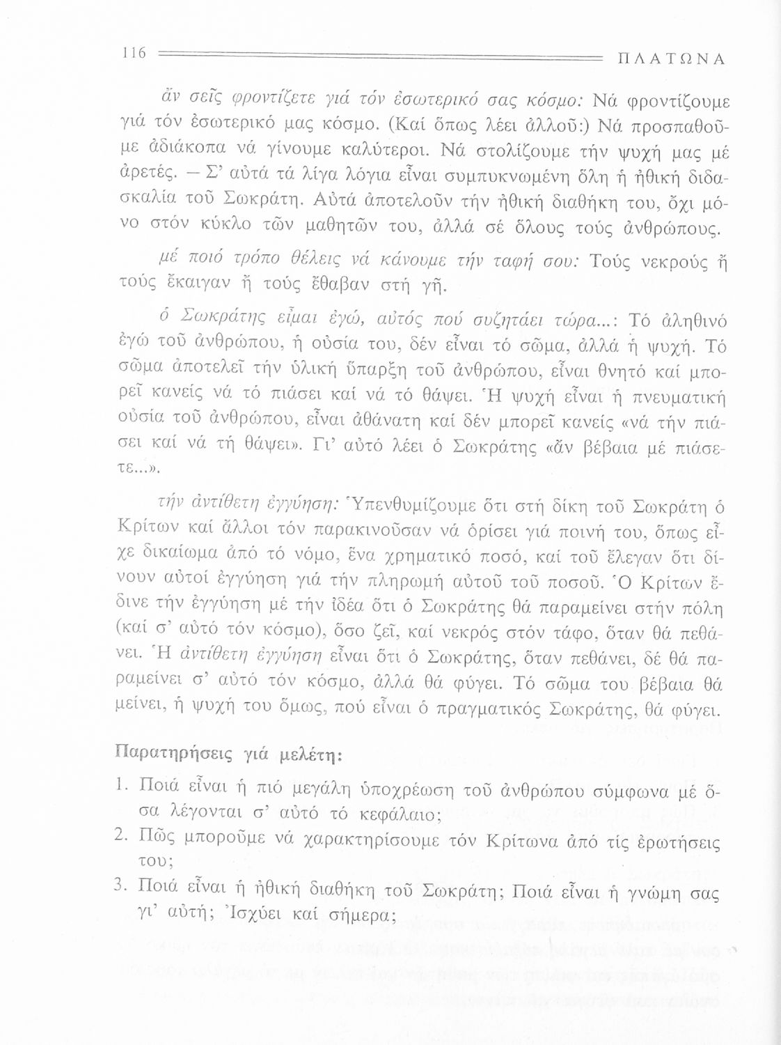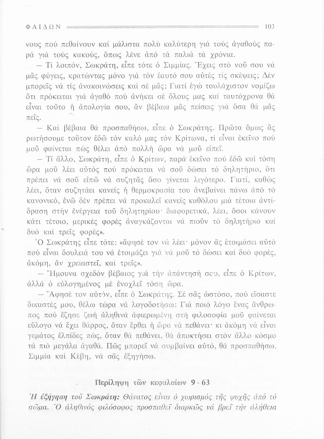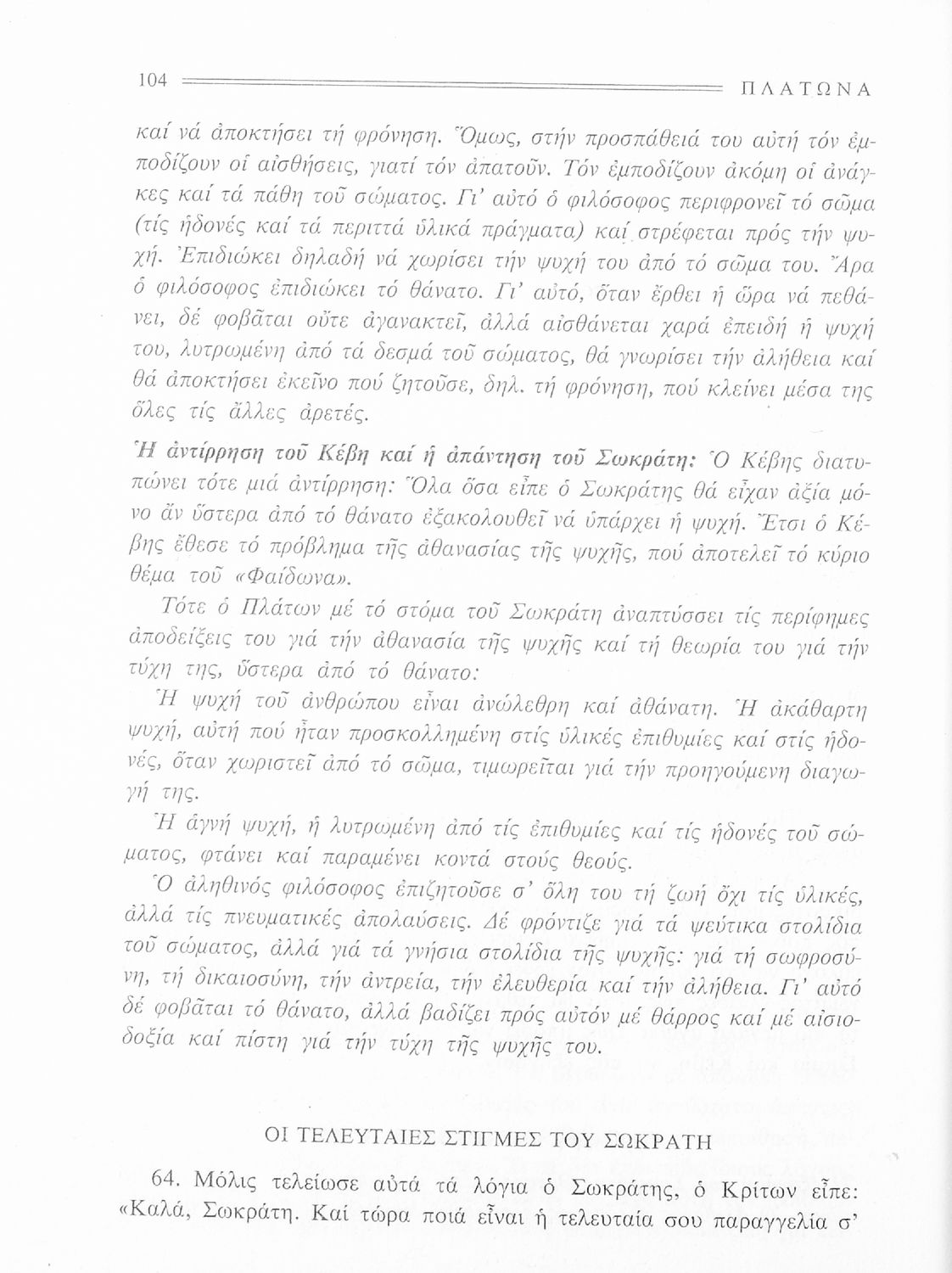 Σχολικό εγχειρίδιο Φιλοσοφίας Γ΄ Γυμνασίου που περιλαμβάνει τα κείμενα Απολογία του Σωκράτη, Κρίτων, Φαίδων και Ηθικά Νικομάχεια. Περιέχει εισαγωγικά και ερμηνευτικά σχόλια και παρατηρήσεις για μελέτη.