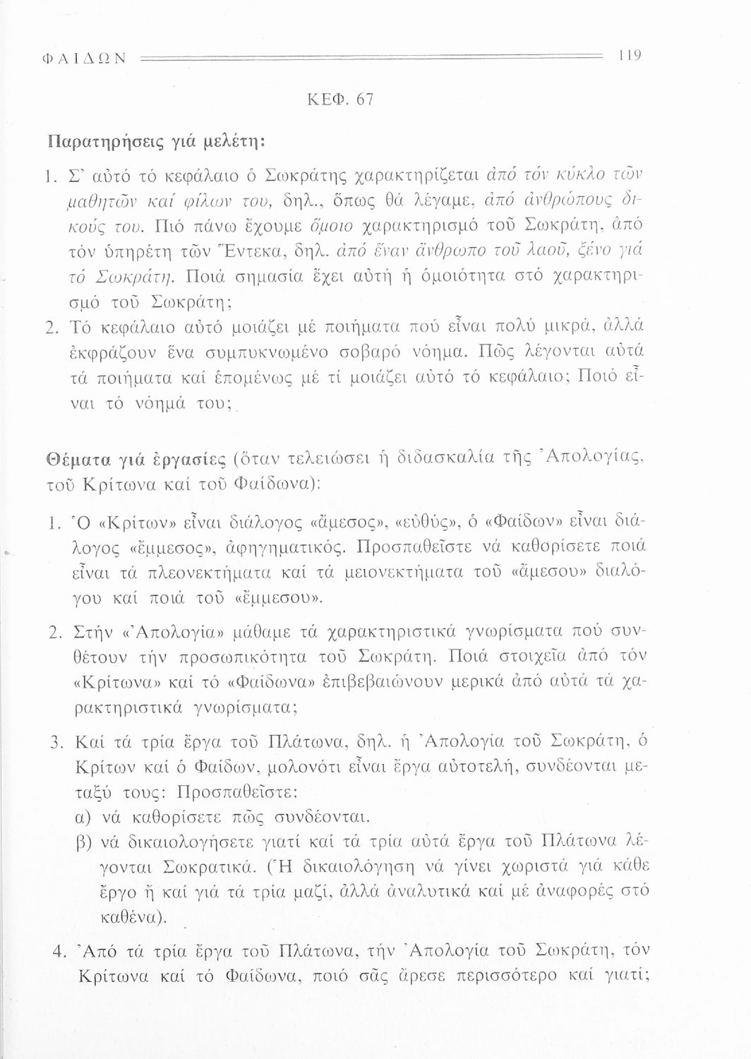 Παρουσίαση περιεχομένου: Σχολικό εγχειρίδιο Φιλοσοφίας Γ΄ Γυμνασίου που περιλαμβάνει τα κείμενα Απολογία του Σωκράτη, Κρίτων, Φαίδων και Ηθικά Νικομάχεια. Περιέχει εισαγωγικά και ερμηνευτικά σχόλια και παρατηρήσεις για μελέτη.