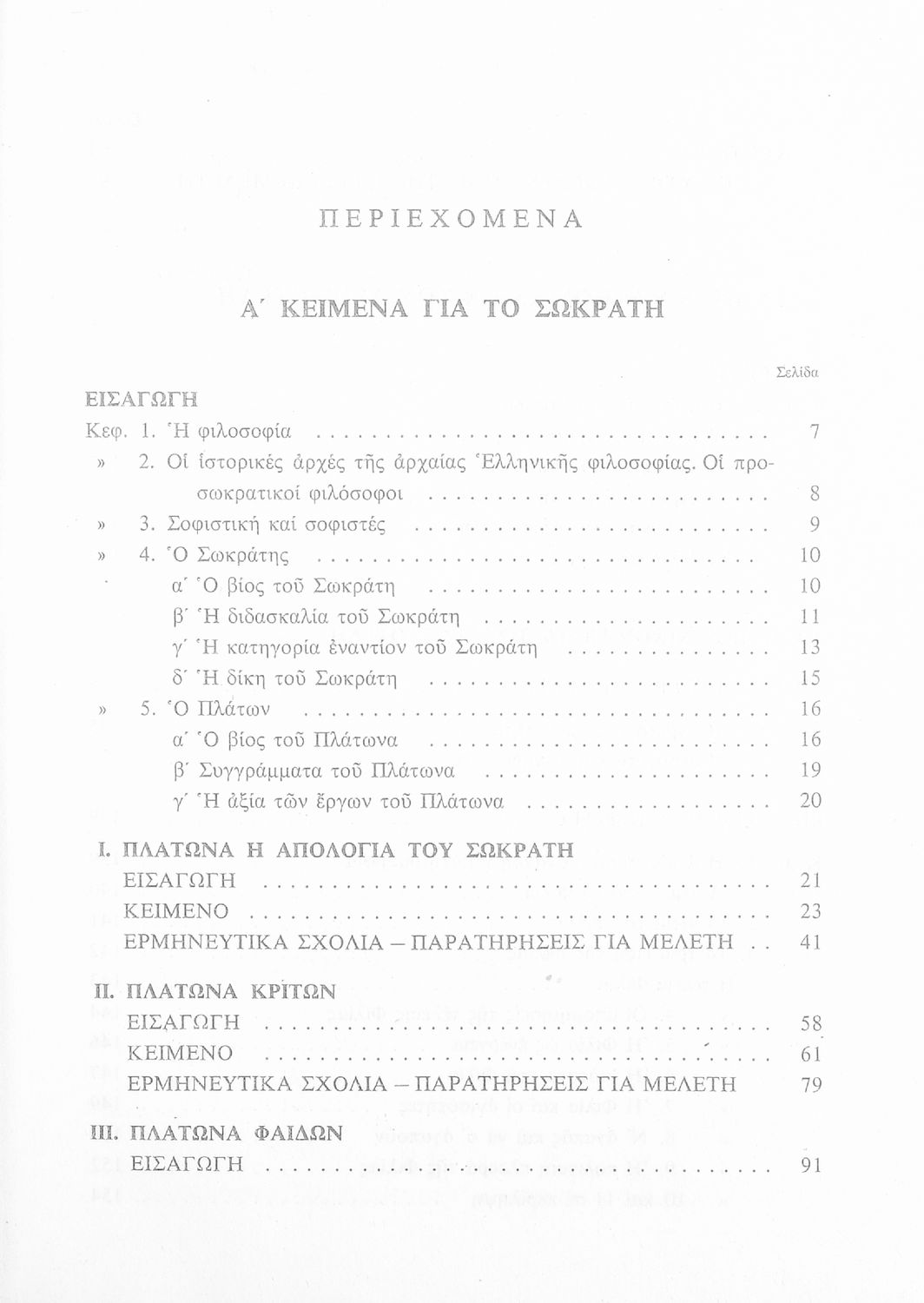 Σχολικό εγχειρίδιο Φιλοσοφίας Γ΄ Γυμνασίου που περιλαμβάνει τα κείμενα Απολογία του Σωκράτη, Κρίτων, Φαίδων και Ηθικά Νικομάχεια. Περιέχει εισαγωγικά και ερμηνευτικά σχόλια και παρατηρήσεις για μελέτη.