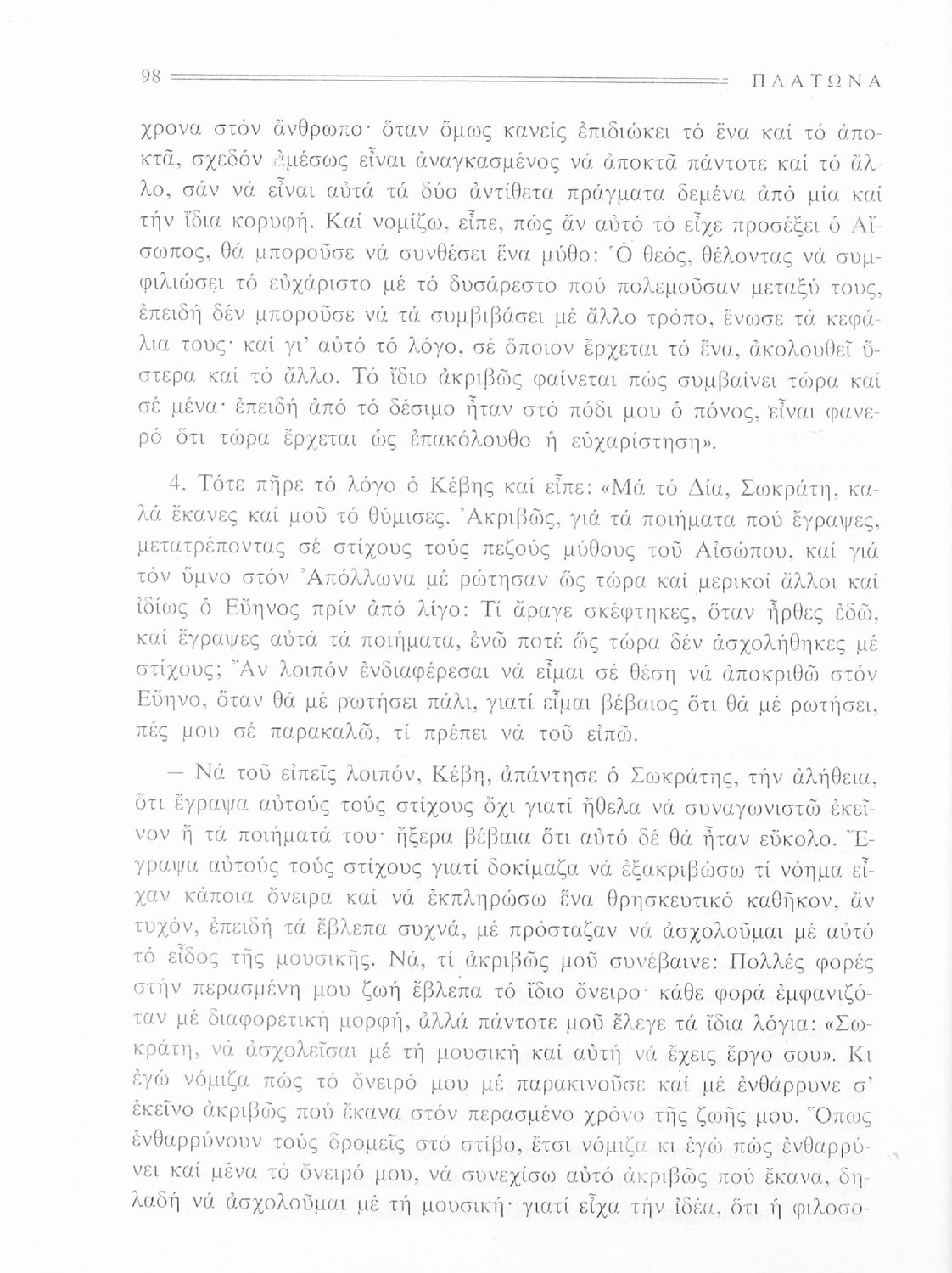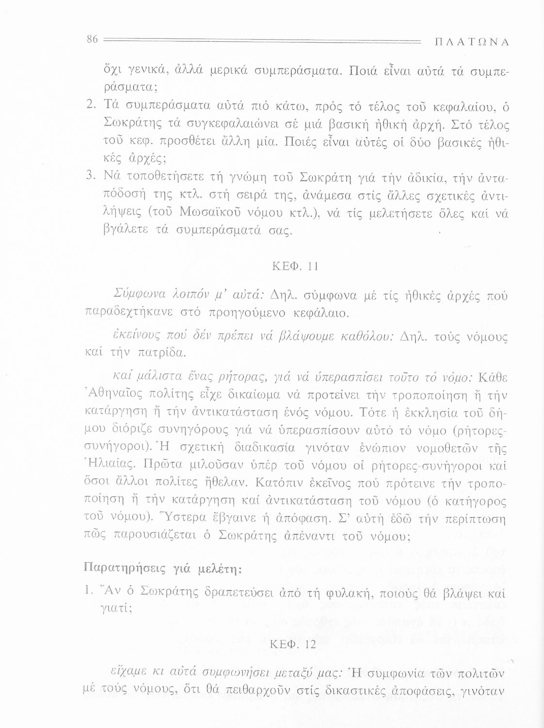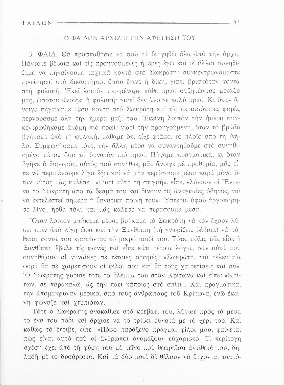 Σχολικό εγχειρίδιο Φιλοσοφίας Γ΄ Γυμνασίου που περιλαμβάνει τα κείμενα Απολογία του Σωκράτη, Κρίτων, Φαίδων και Ηθικά Νικομάχεια. Περιέχει εισαγωγικά και ερμηνευτικά σχόλια και παρατηρήσεις για μελέτη.