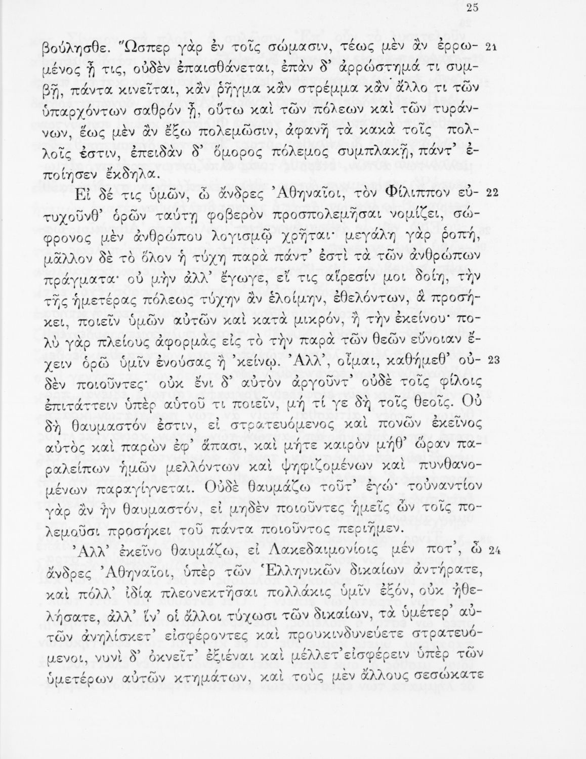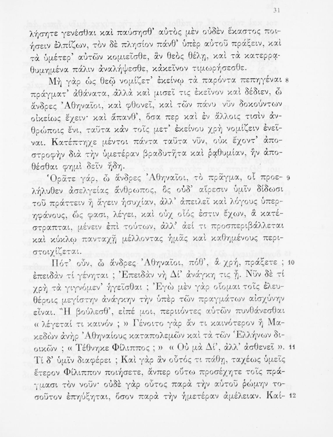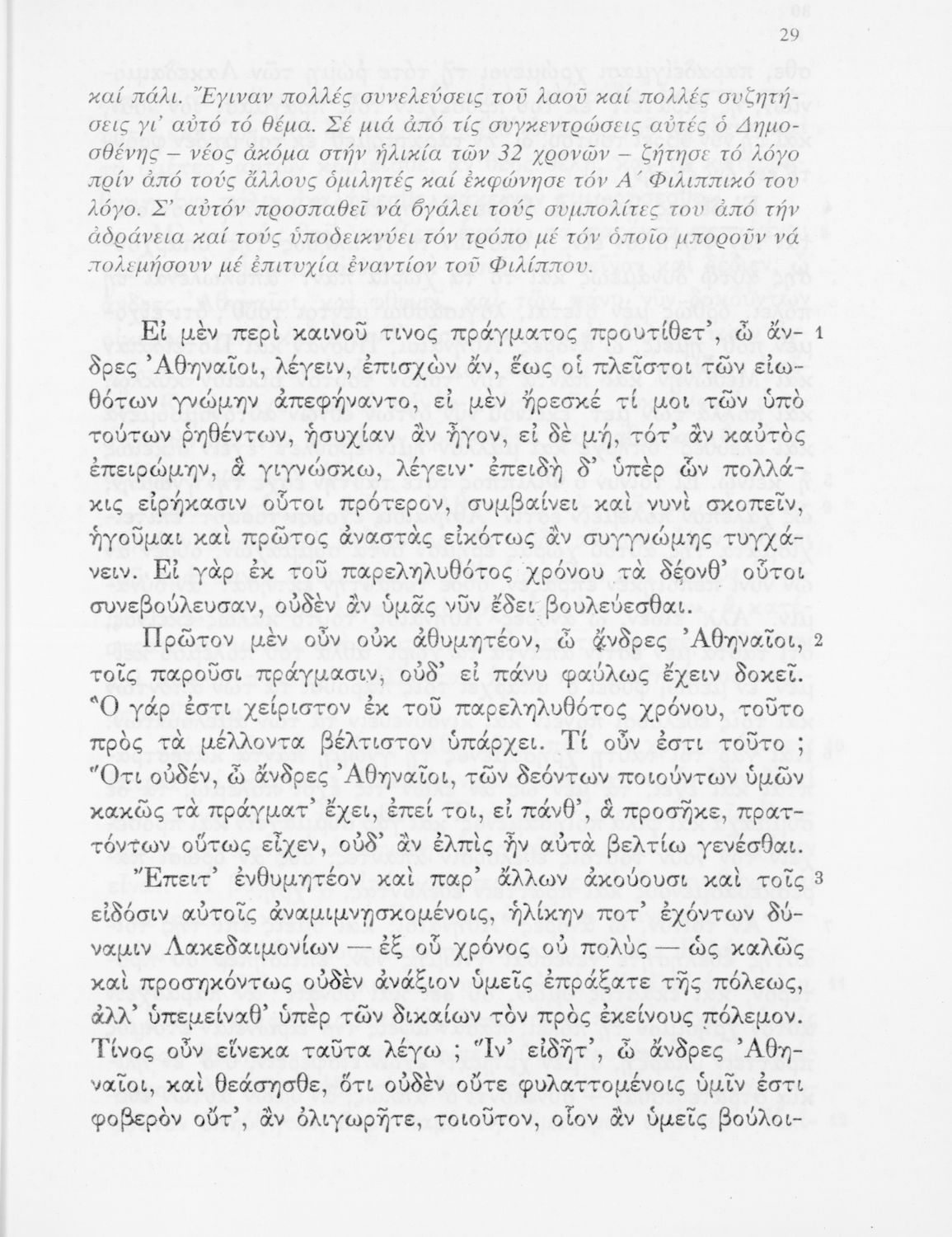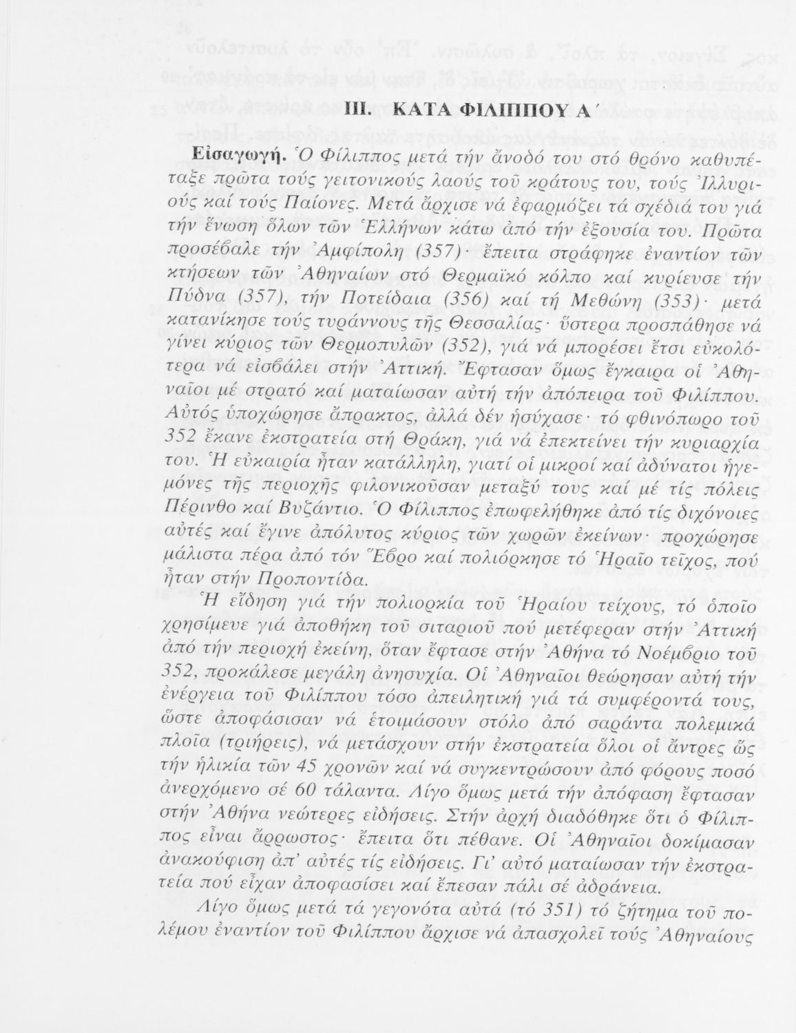 Σχολικό εγχειρίδιο Αρχαίων Ελληνικών. Α΄ Λυκείου που περιλαμβάνει εισαγωγή στη ζωή και το έργο του Δημοσθένη, τους Λόγους Α΄ και Β΄ Ολυνθιακός και Α΄ και Β΄ κατά Φιλίππου και ερμηνευτικές σημειώσεις.