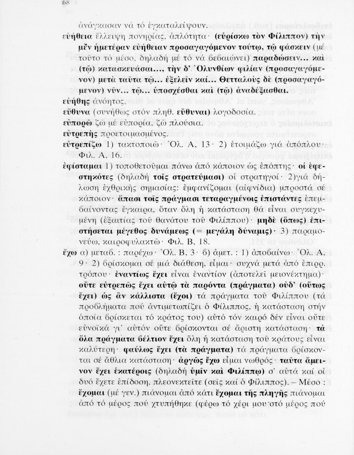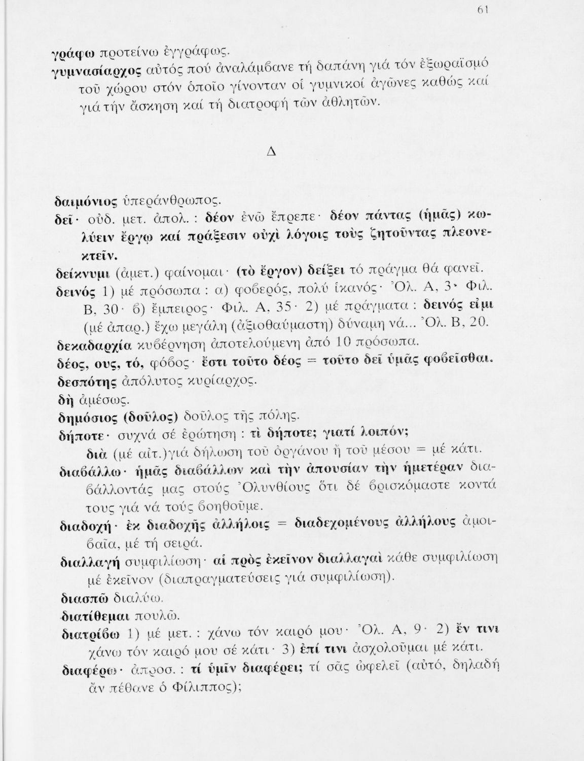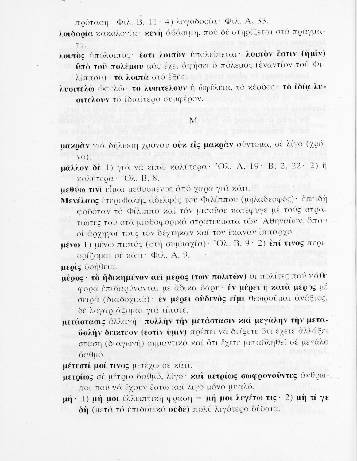 Σχολικό εγχειρίδιο Αρχαίων Ελληνικών Δ΄ Γυμνασίου που περιλαμβάνει εισαγωγή στη ζωή και στο έργο του Δημοσθένη, τον Α΄ κατά Φιλίππου, και τους Α΄ και Β΄ Ολυνθιακούς και ερμηνευτικά και ετυμολογικά σχόλια.