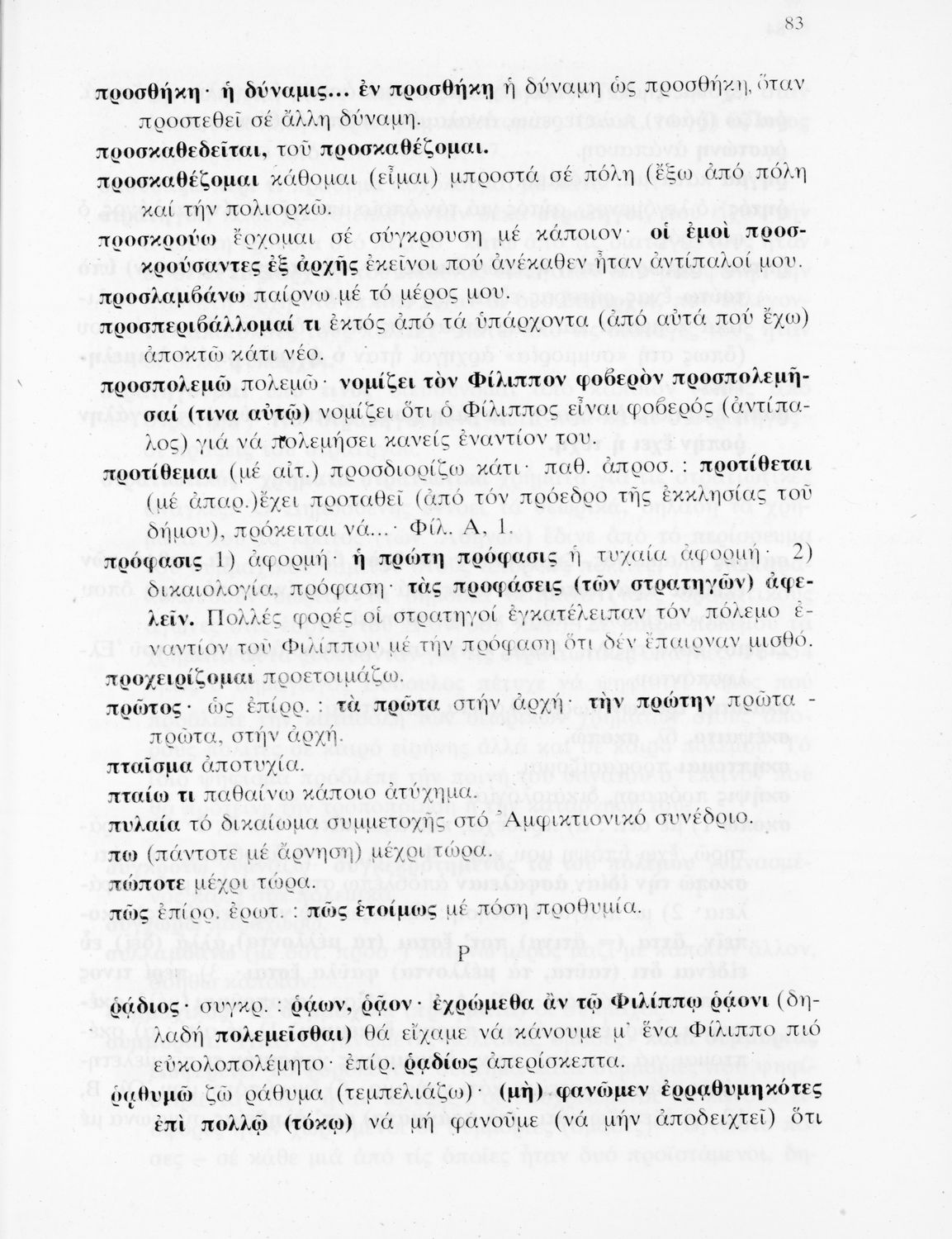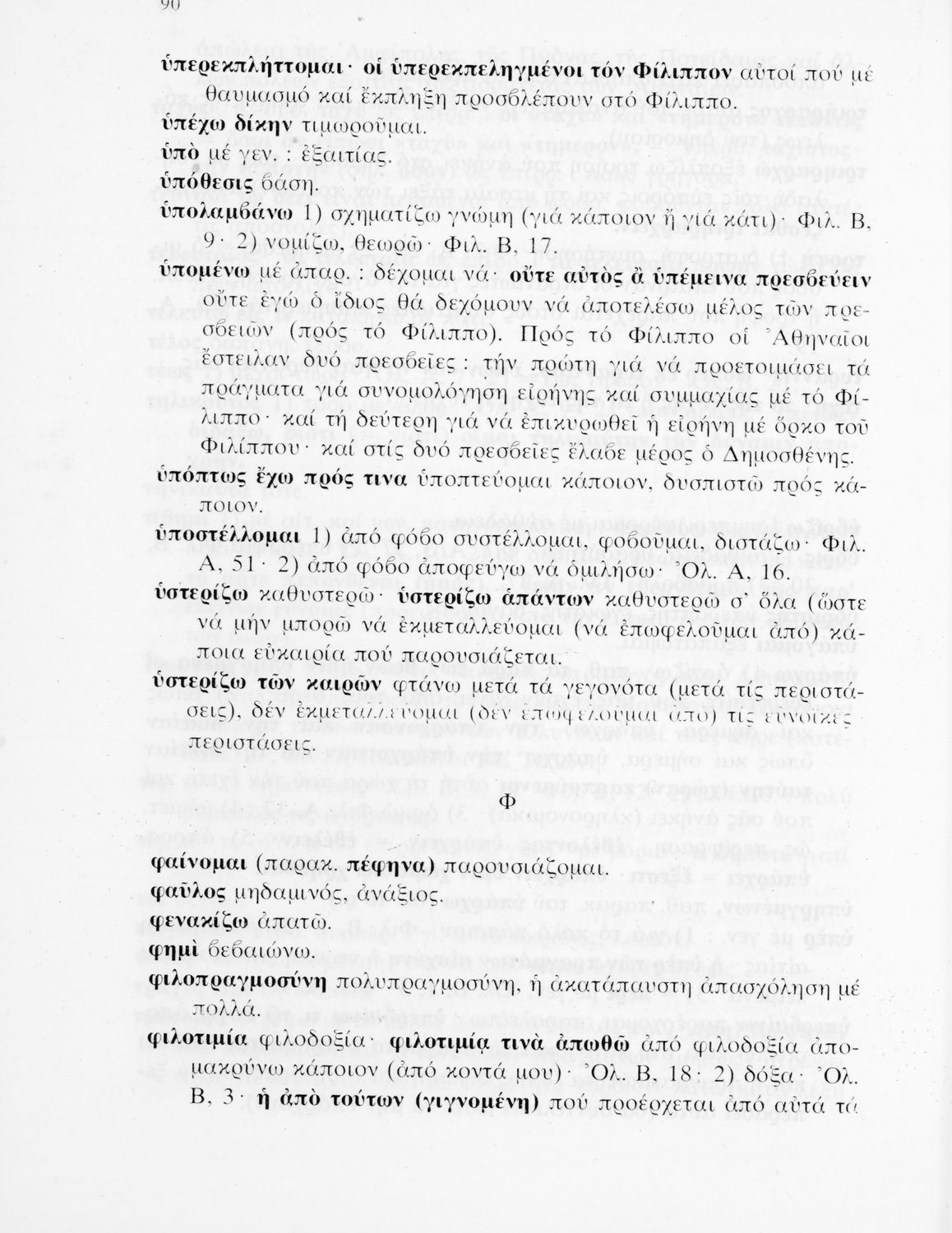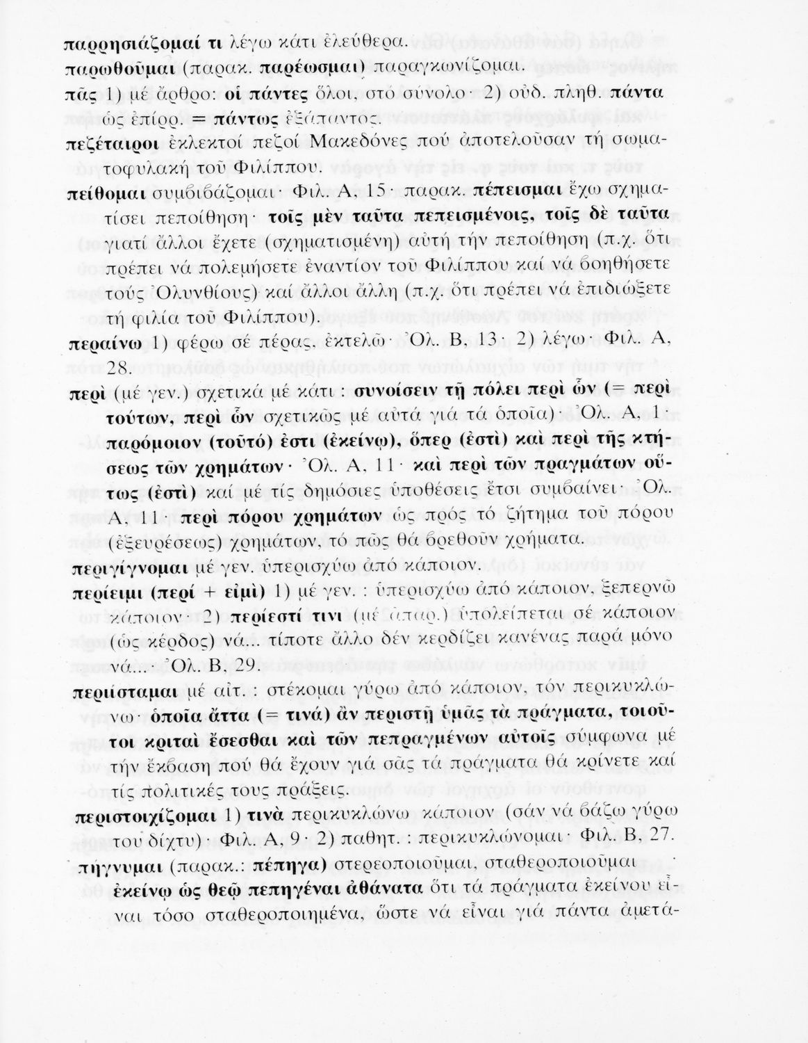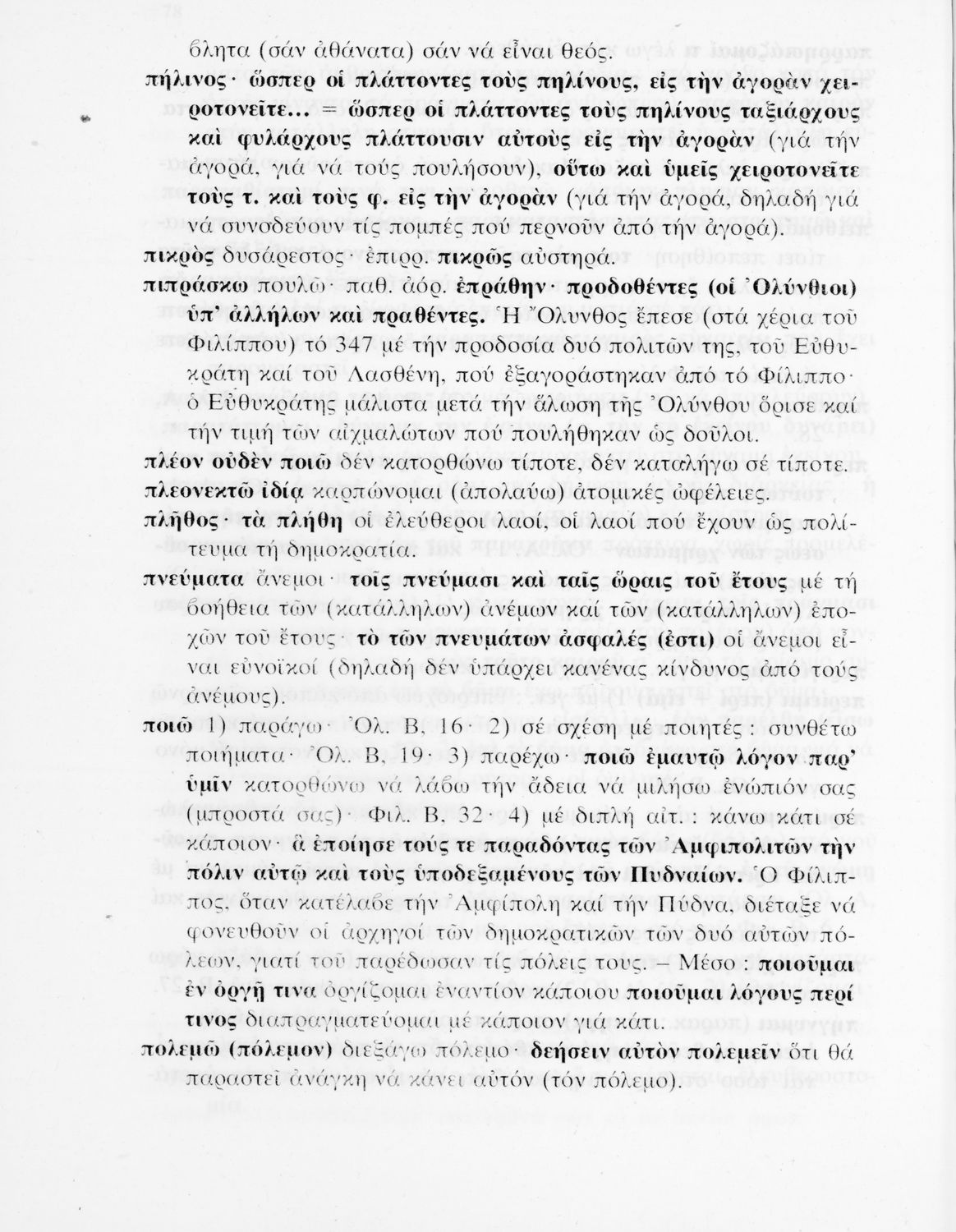 Σχολικό εγχειρίδιο Αρχαίων Ελληνικών Δ΄ Γυμνασίου που περιλαμβάνει εισαγωγή στη ζωή και στο έργο του Δημοσθένη, τον Α΄ κατά Φιλίππου, και τους Α΄ και Β΄ Ολυνθιακούς και ερμηνευτικά και ετυμολογικά σχόλια.