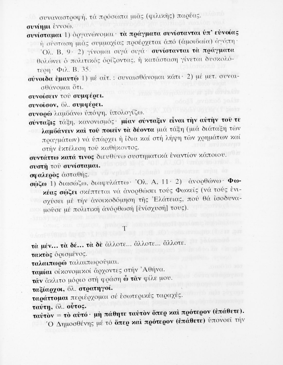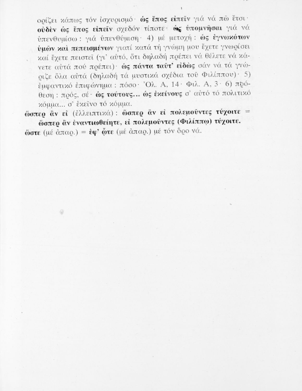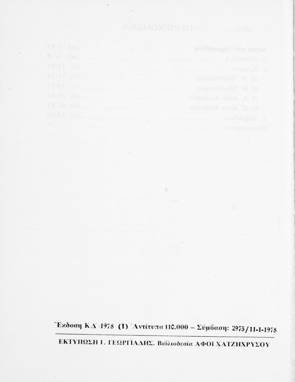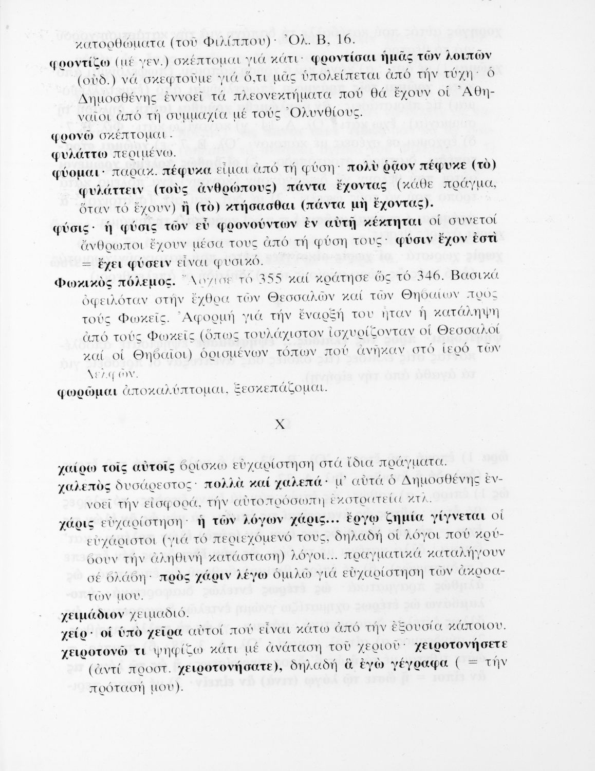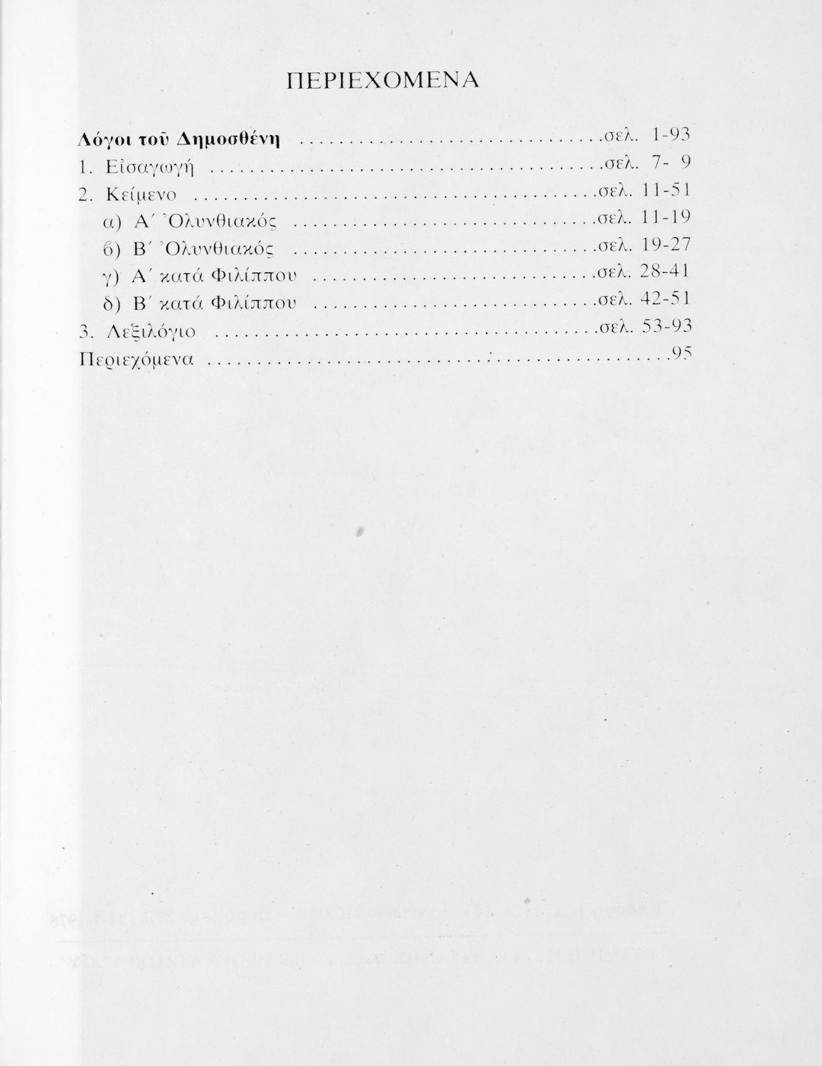 Σχολικό εγχειρίδιο Αρχαίων Ελληνικών Δ΄ Γυμνασίου που περιλαμβάνει τους Ολυνθιακούς Α΄ και Β΄ και τους Φιλιππικούς Α΄ και Β' του Δημοσθένη, εισαγωγή και ερμηνευτικά σχόλια. Φέρει το σύμβολο της δικτατορίας.