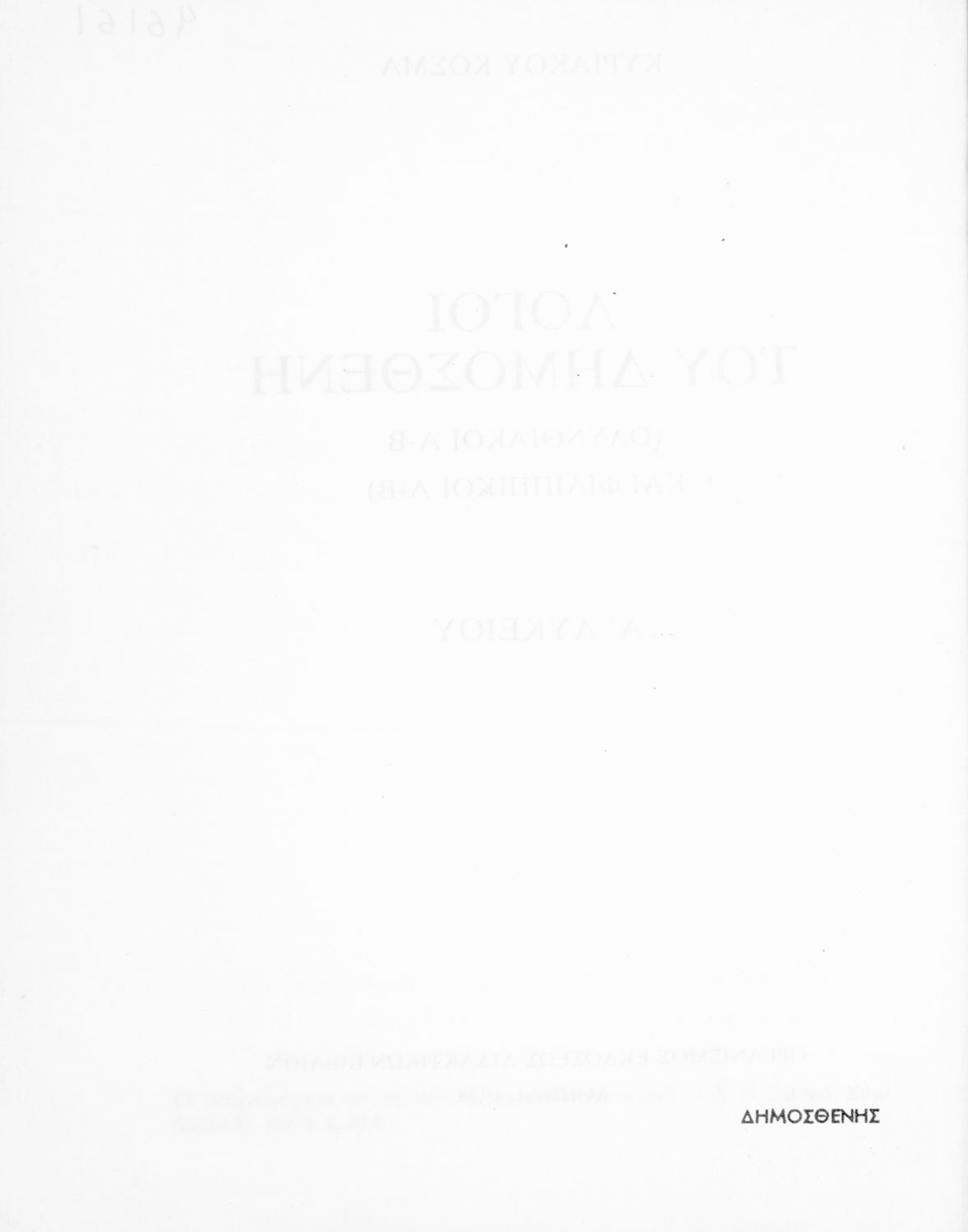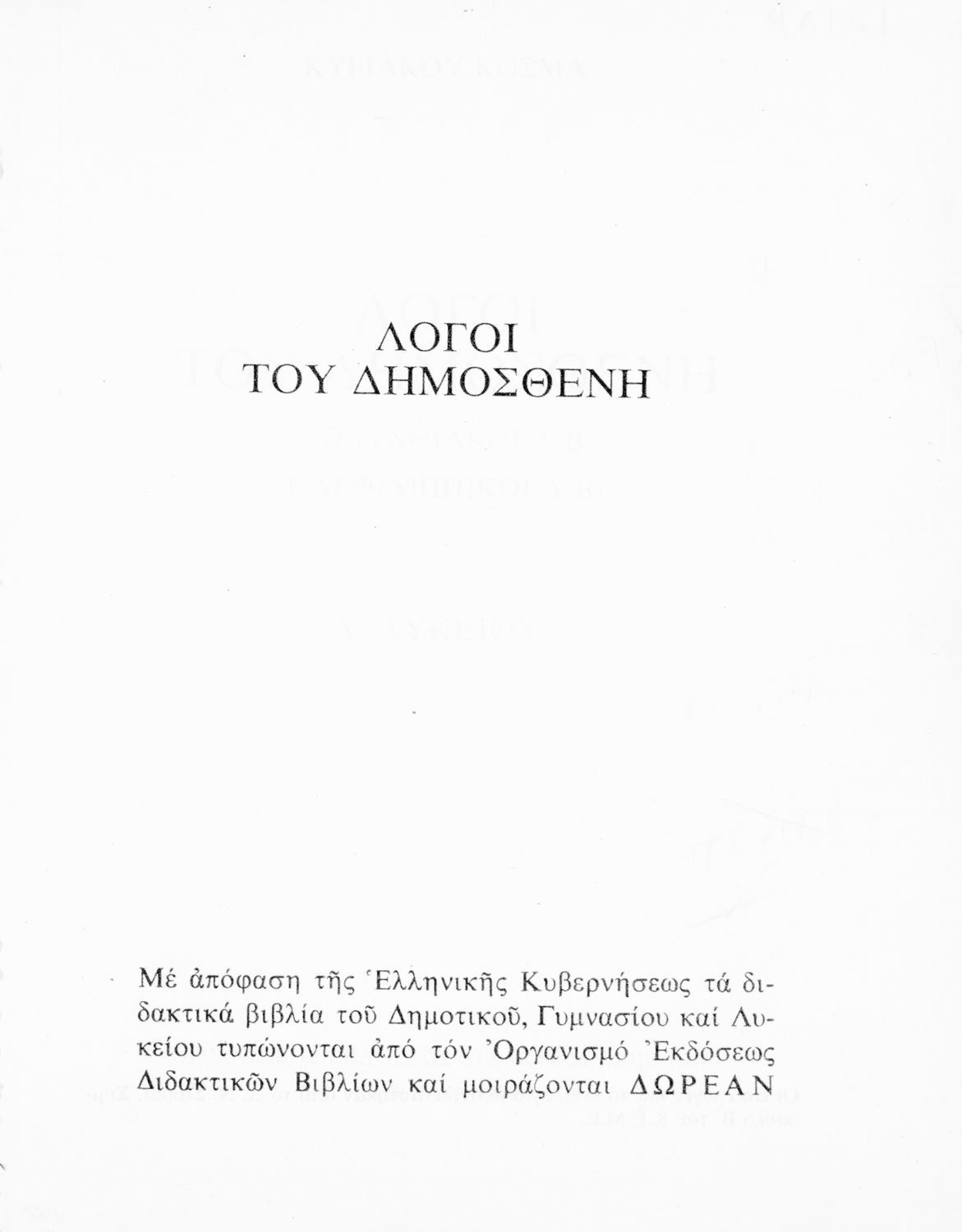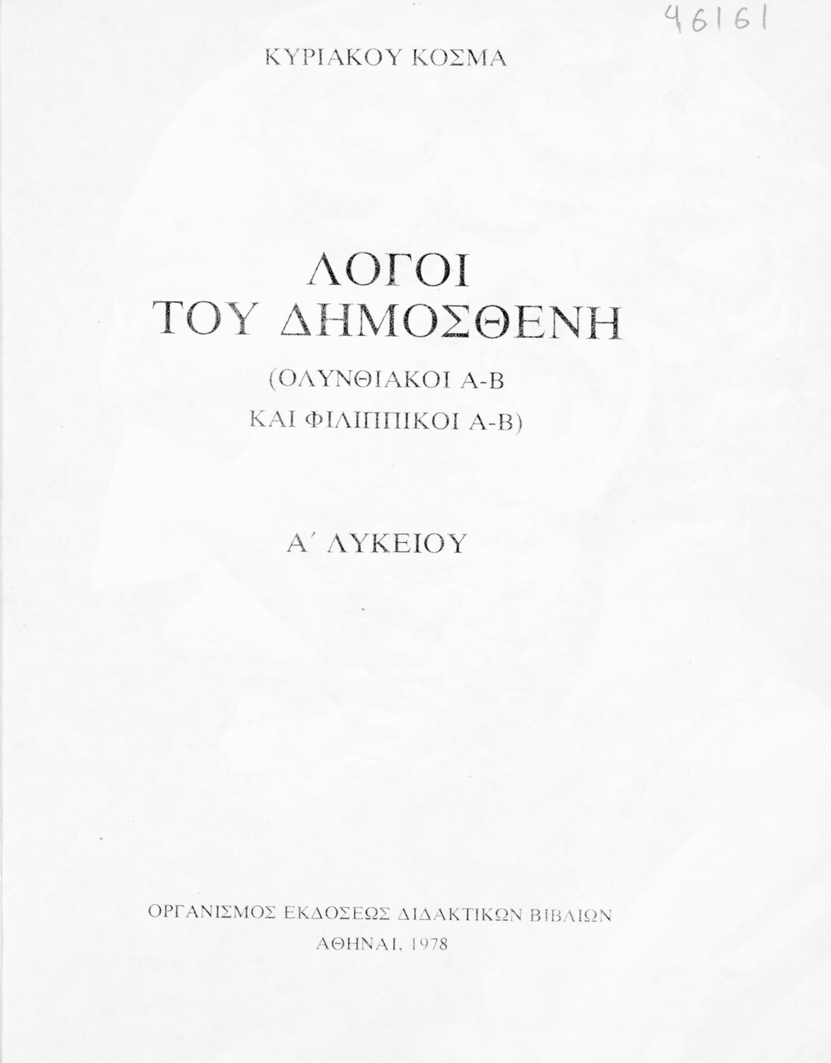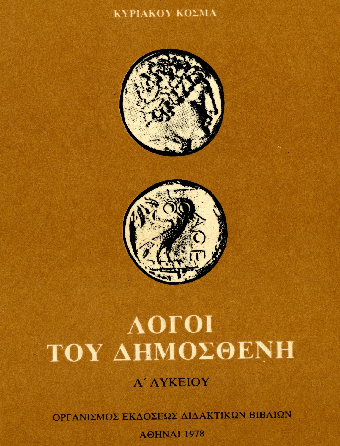 Σχολικό εγχειρίδιο Αρχαίων Ελληνικών. Α΄ Λυκείου που περιλαμβάνει εισαγωγή στη ζωή και το έργο του Δημοσθένη, τους Λόγους Α΄ και Β΄ Ολυνθιακός και Α΄ και Β΄ κατά Φιλίππου και ερμηνευτικές σημειώσεις.