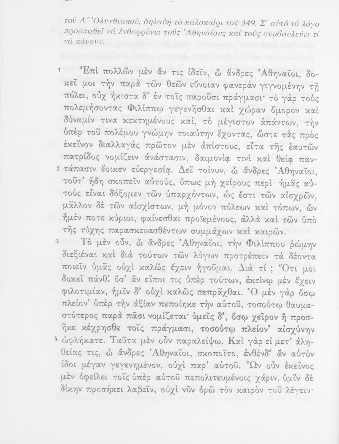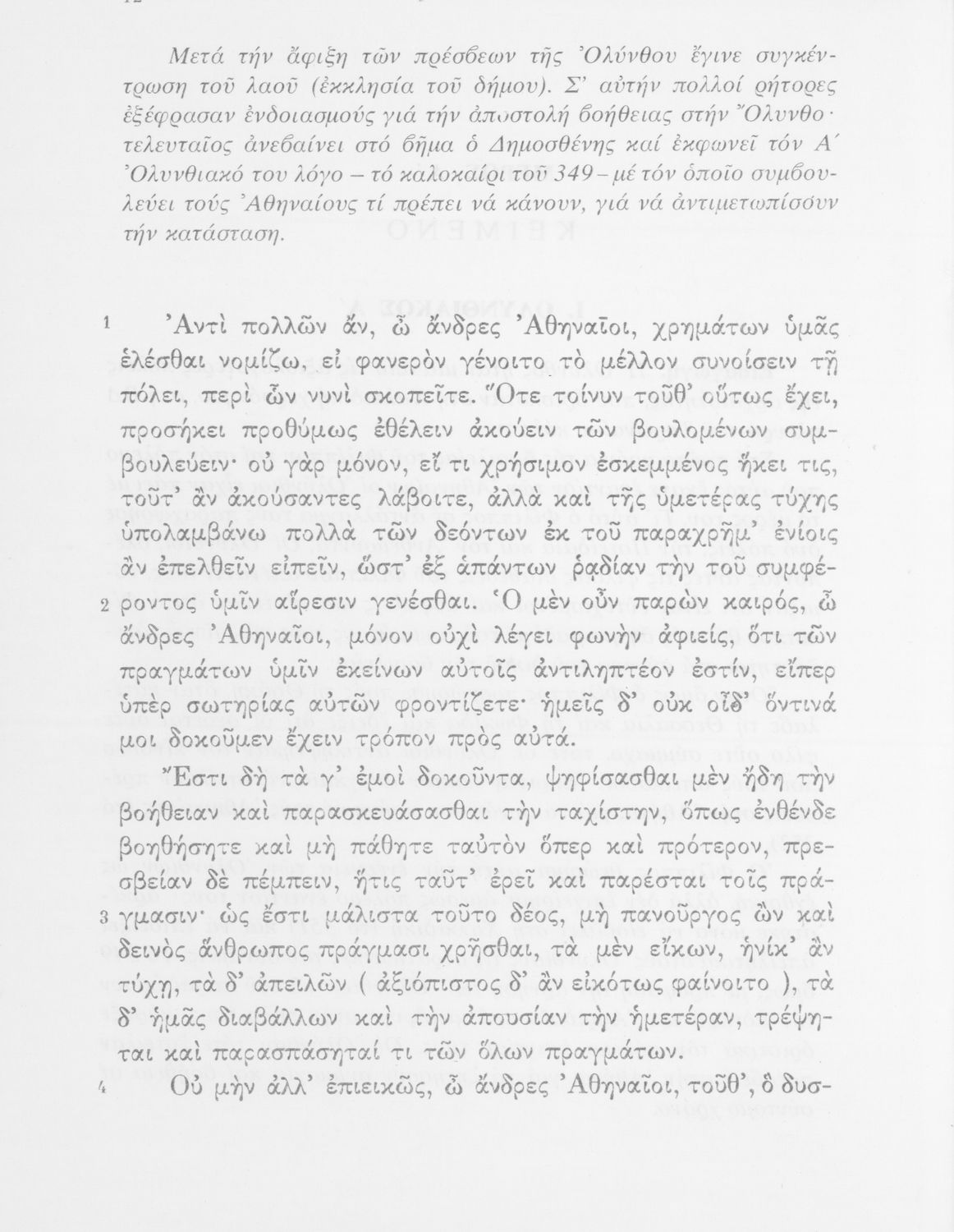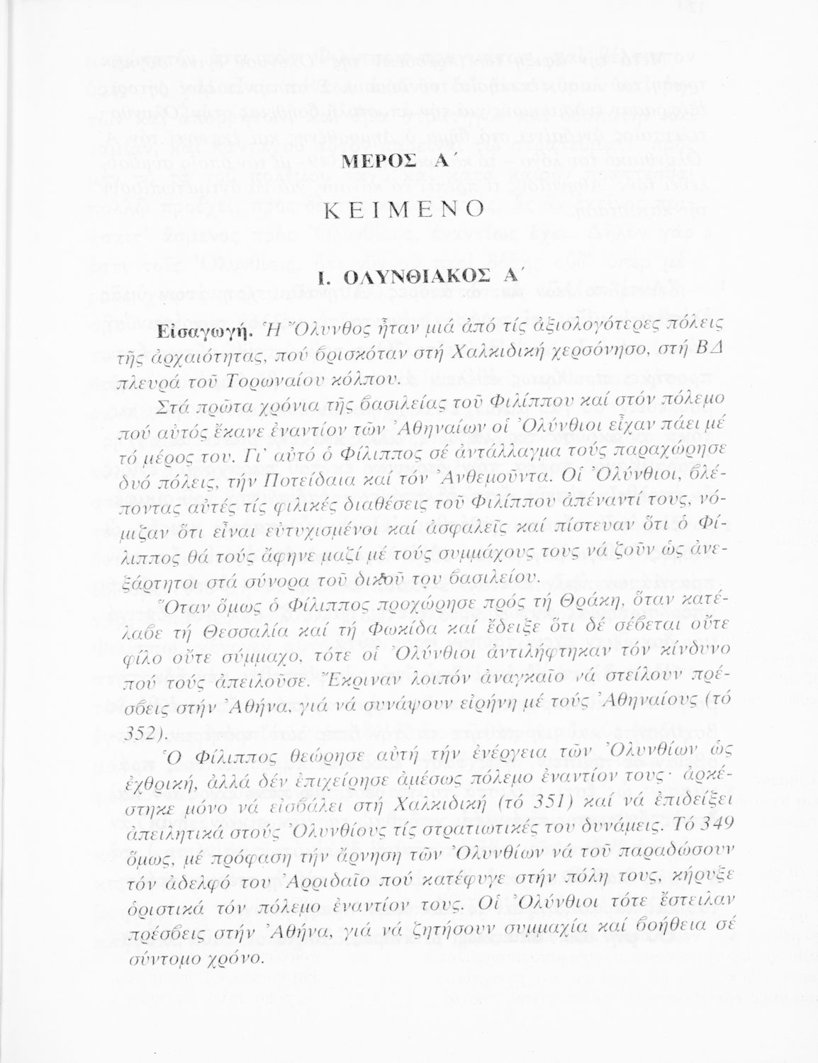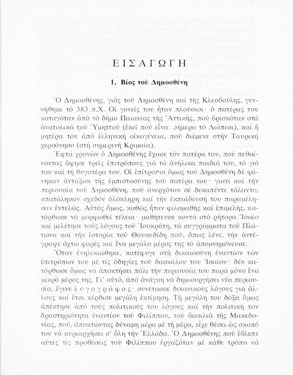 Σχολικό εγχειρίδιο Αρχαίων Ελληνικών. Α΄ Λυκείου που περιλαμβάνει εισαγωγή στη ζωή και το έργο του Δημοσθένη, τους Λόγους Α΄ και Β΄ Ολυνθιακός και Α΄ και Β΄ κατά Φιλίππου και ερμηνευτικές σημειώσεις.