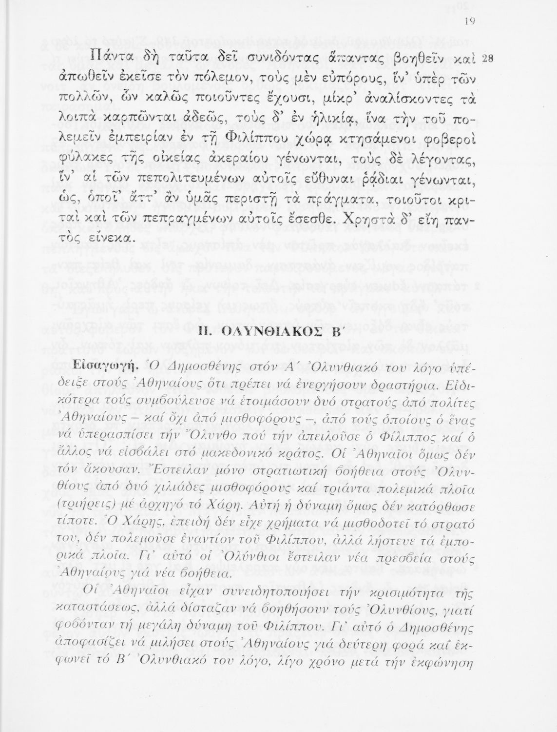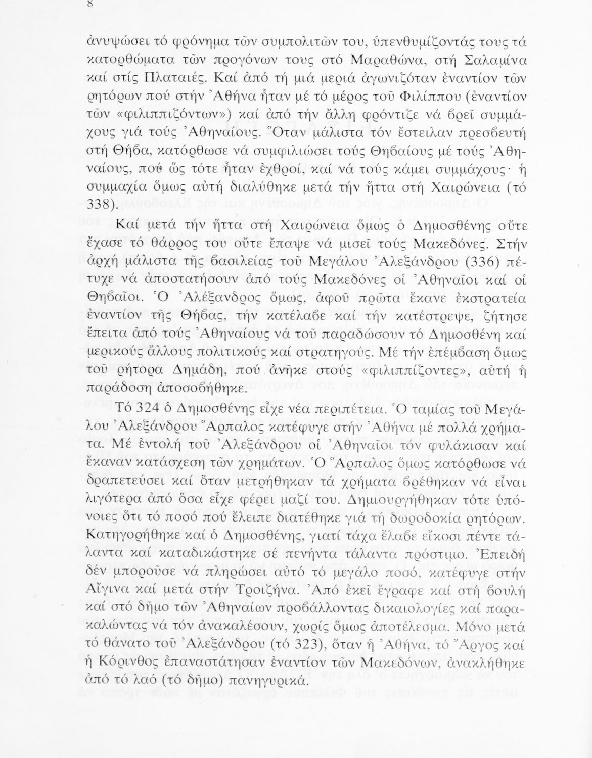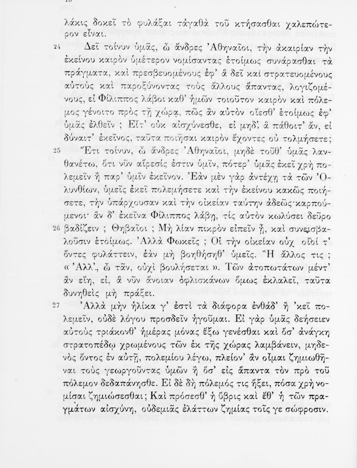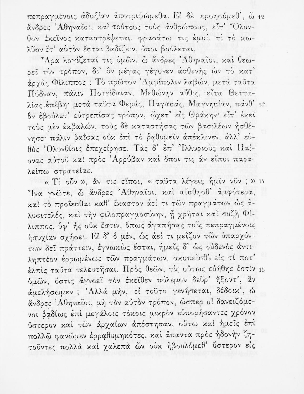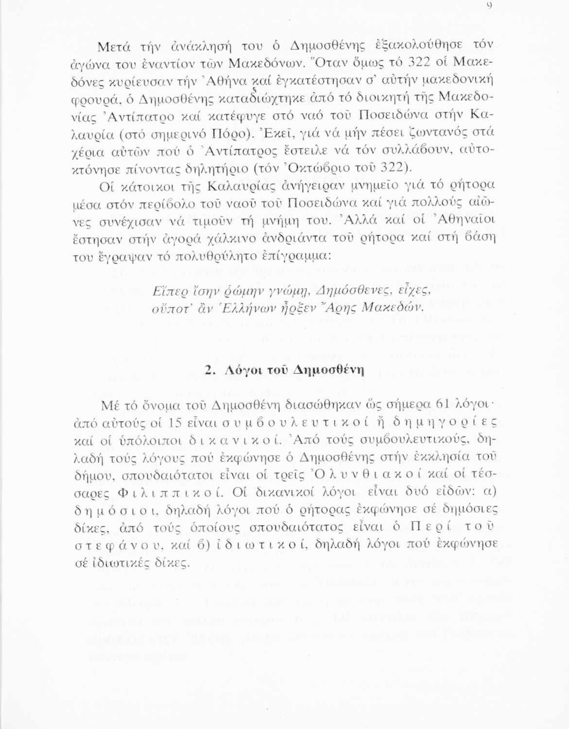 Σχολικό εγχειρίδιο Αρχαίων Ελληνικών. Α΄ Λυκείου που περιλαμβάνει εισαγωγή στη ζωή και το έργο του Δημοσθένη, τους Λόγους Α΄ και Β΄ Ολυνθιακός και Α΄ και Β΄ κατά Φιλίππου και ερμηνευτικές σημειώσεις.