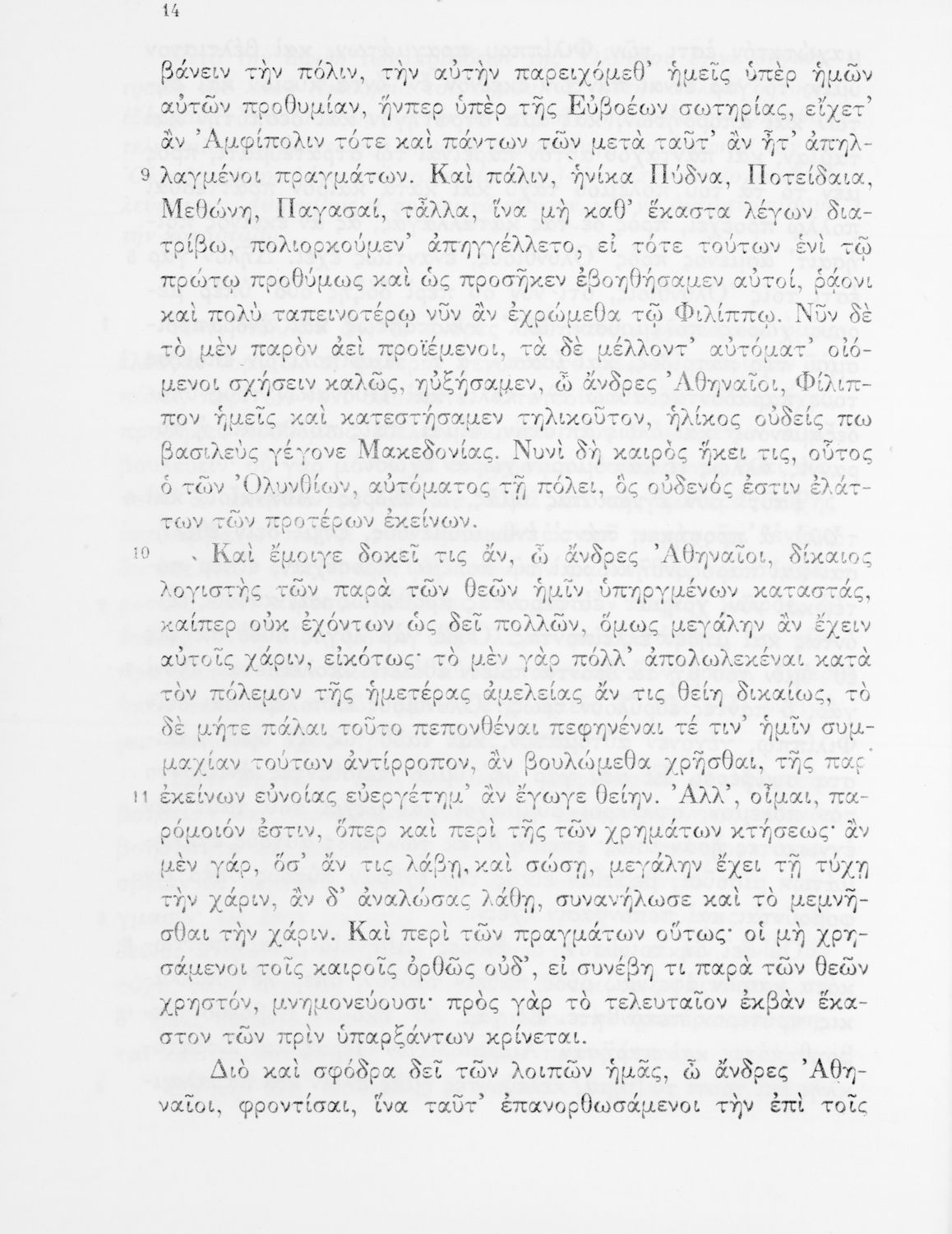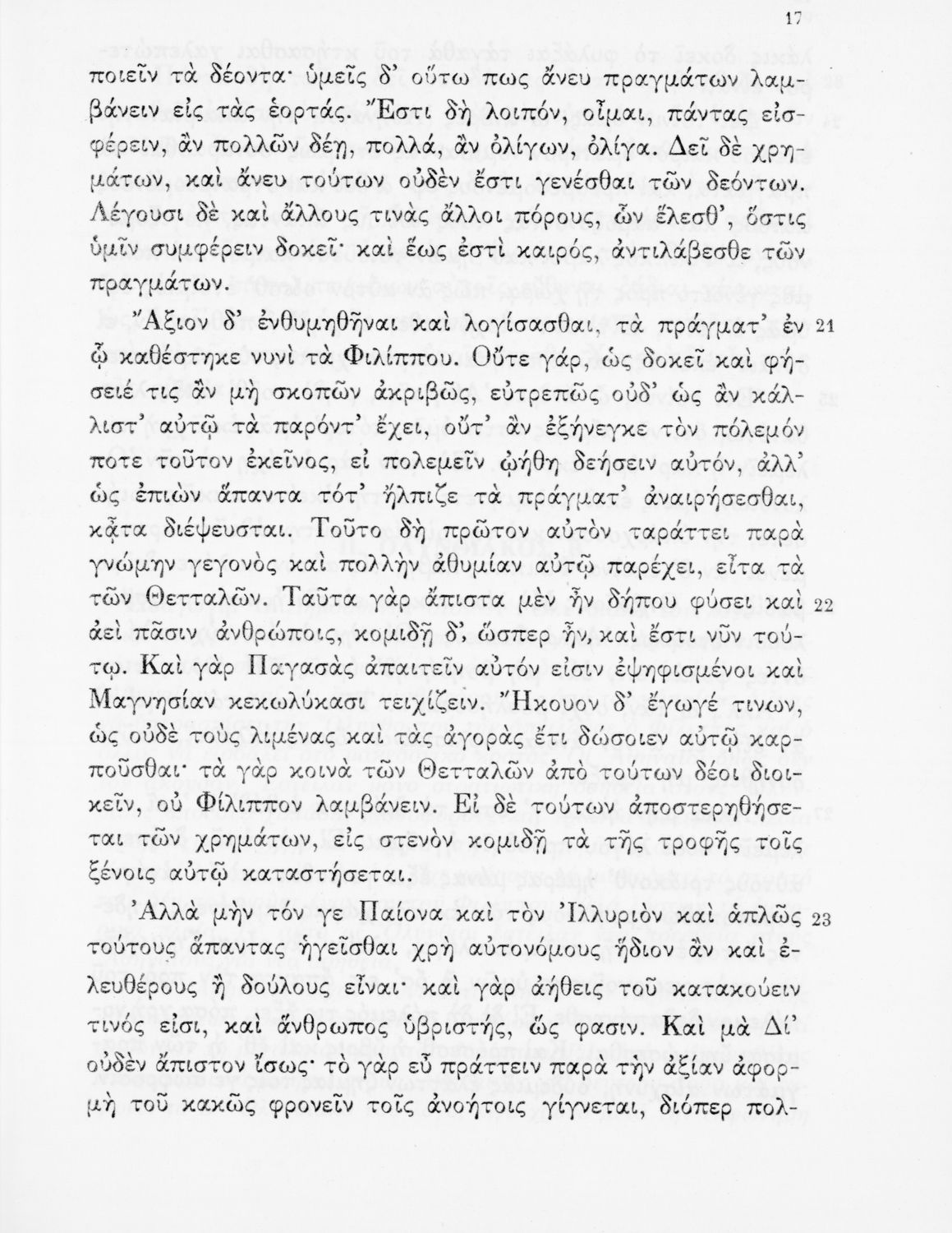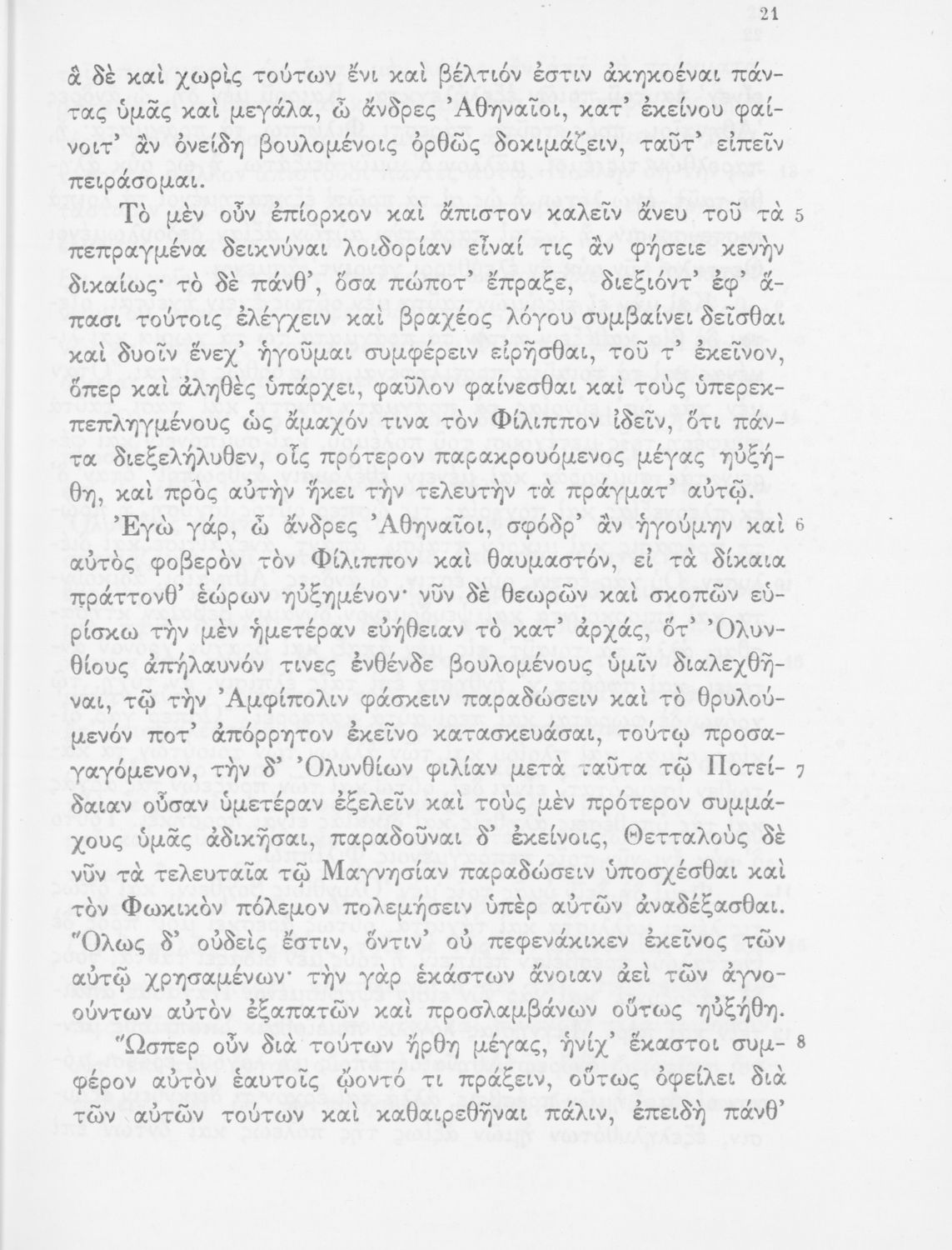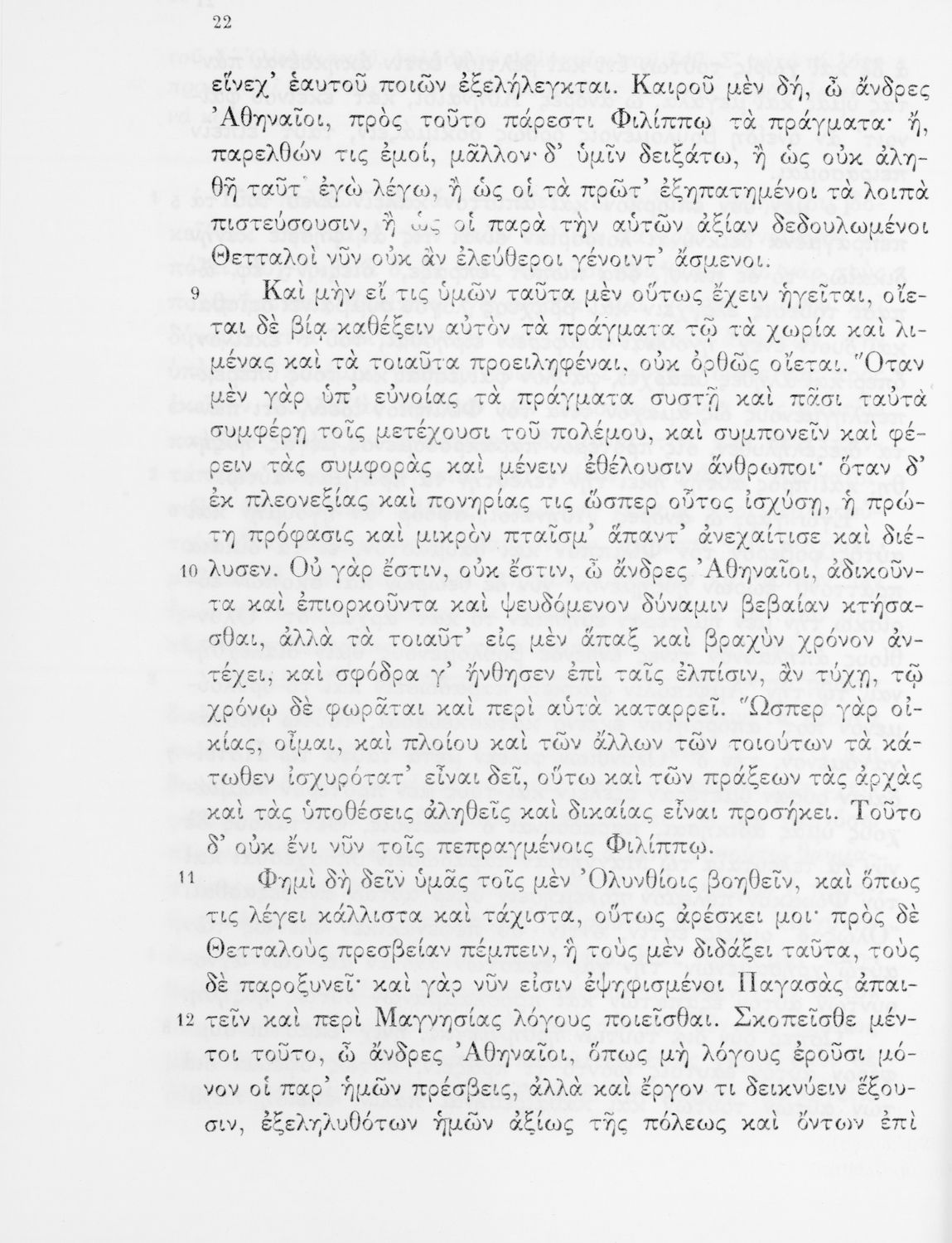 Σχολικό εγχειρίδιο Αρχαίων Ελληνικών. Α΄ Λυκείου που περιλαμβάνει εισαγωγή στη ζωή και το έργο του Δημοσθένη, τους Λόγους Α΄ και Β΄ Ολυνθιακός και Α΄ και Β΄ κατά Φιλίππου και ερμηνευτικές σημειώσεις.