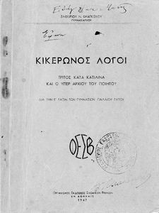Σχολικό εγχειρίδιο Λατινικών για την Ε΄ Γυμνασίου παλαιού τύπου και την ΣΤ΄ Γυμνασίου νέου τύπου ου περιέχει βιογραφικό σημείωμα των Κικέρωνα και Οβίδιου, εισαγωγικά σχόλια, κείμενο και ερμηνευτικές σημειώσεις.